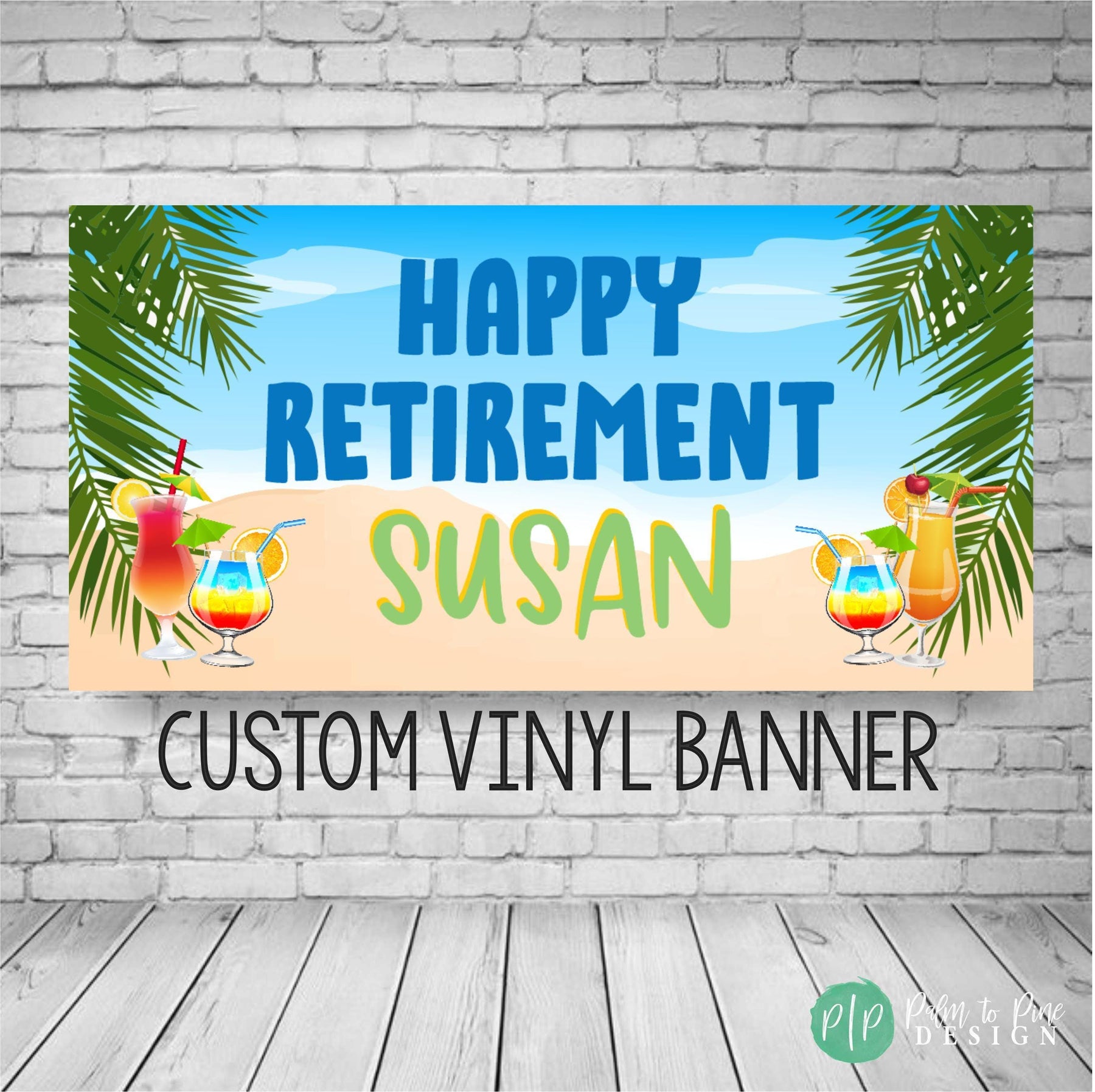 Custom retirement banner featuring a beach scene, tropical drinks, and palm leaves with the text Happy Retirement and name