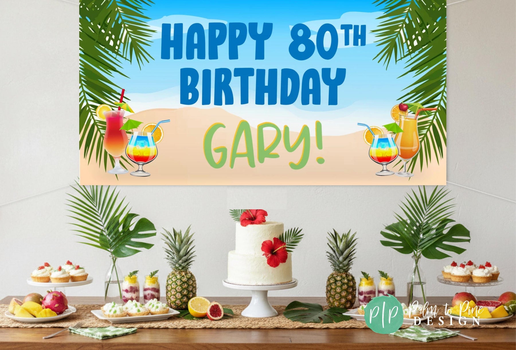 A birthday party setup with a banner that reads "Happy 80th Birthday Gary!" and various tropical-themed decorations, including palm leaves, colorful drinks, and a cake.