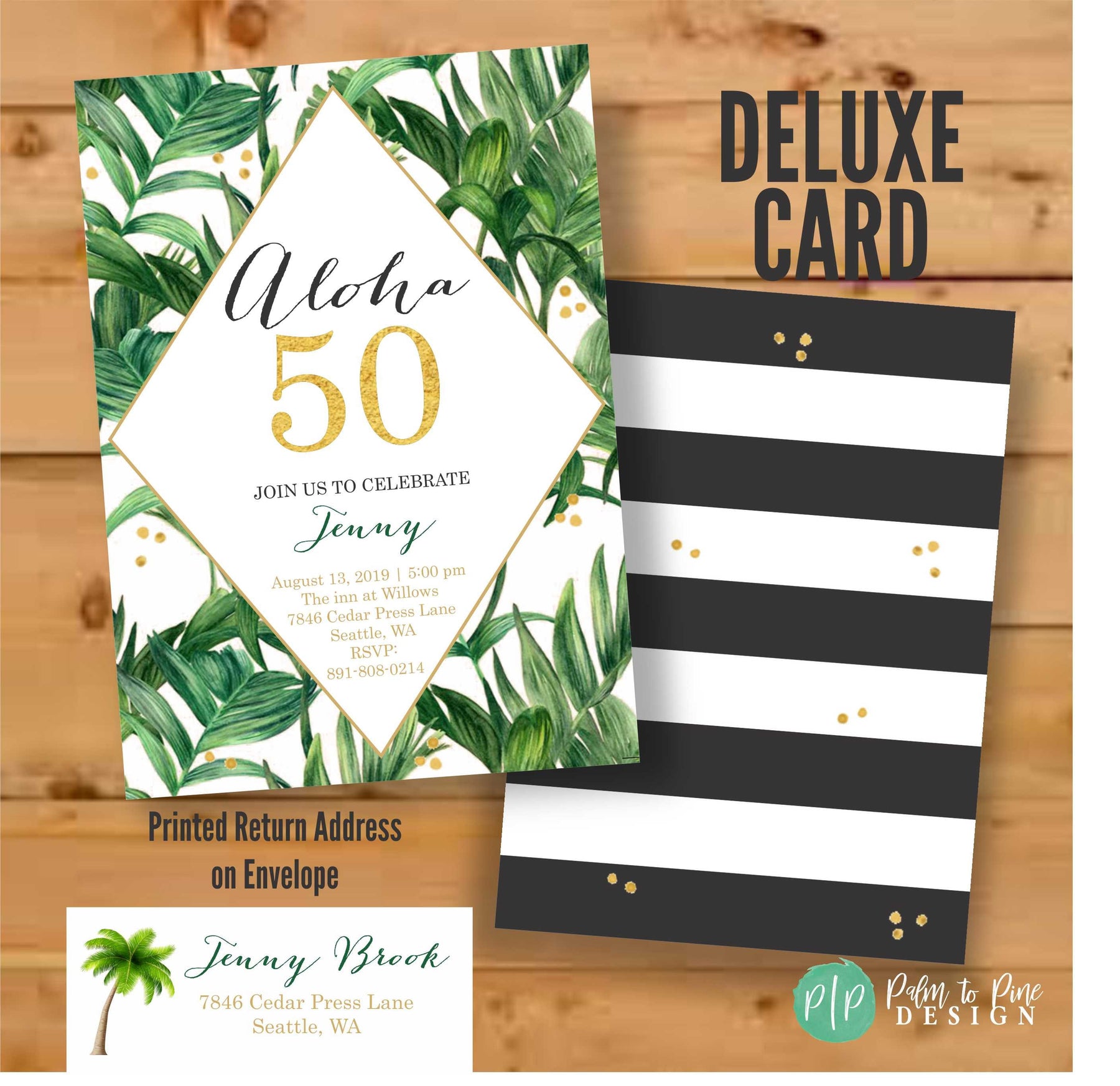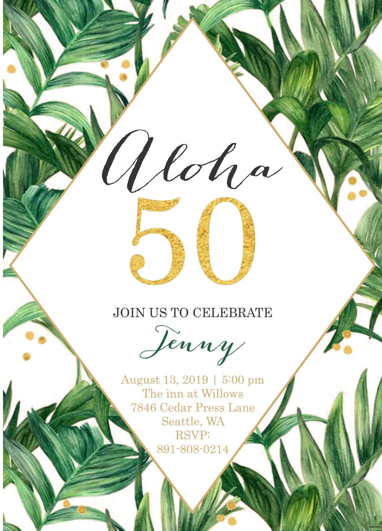 This modern aloha invitation with green palm leaves is perfect to celebrate a Thirtieth, Fortieth, Fiftieth etc. birthday party, bridal shower or even a tropical beach wedding invitation. All the text on this aloha birthday invitation is customizable for your party or age, just include your requests in the notes to seller section at checkout.