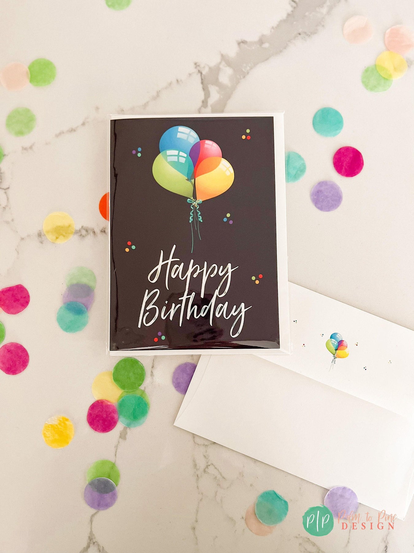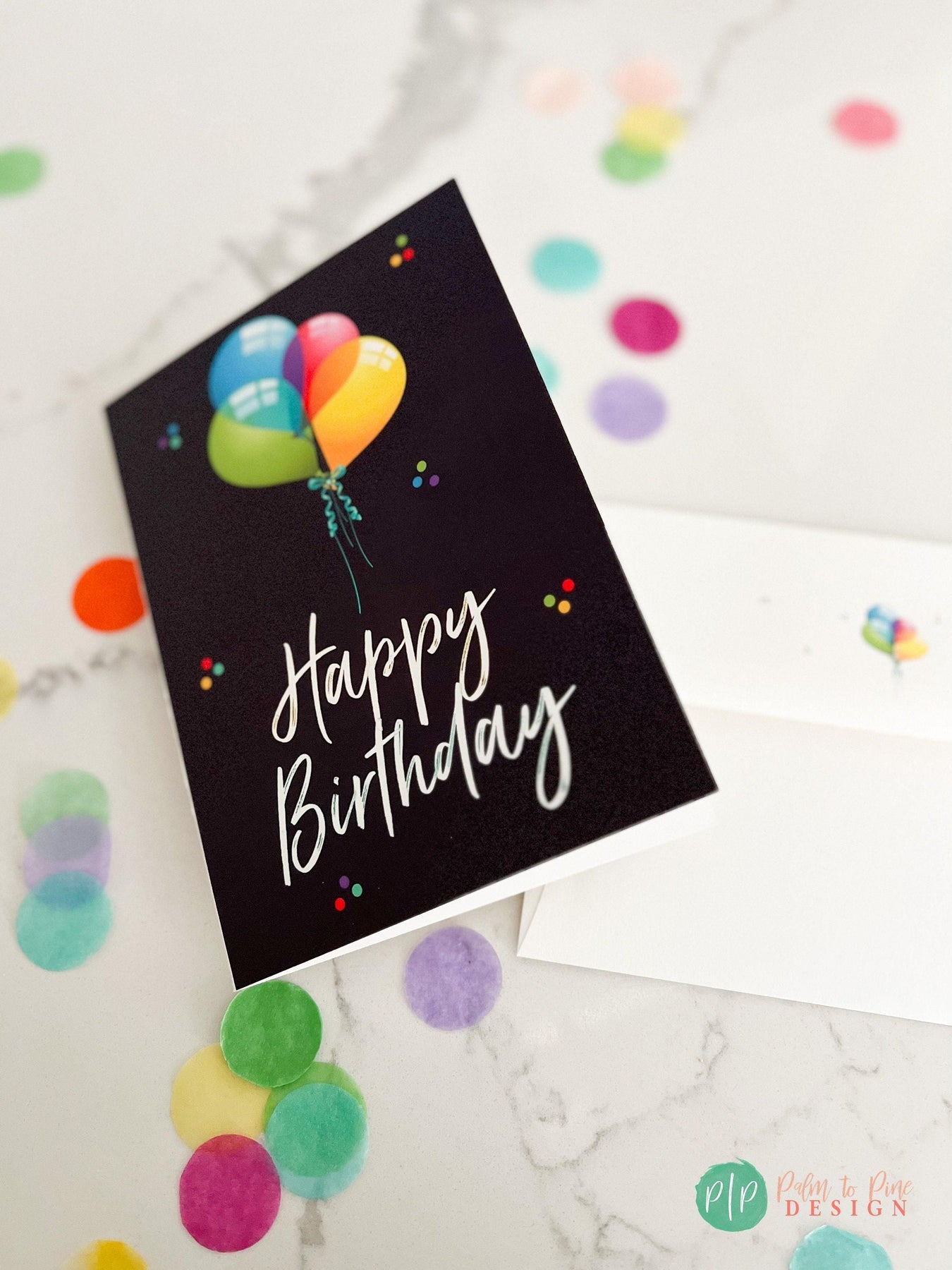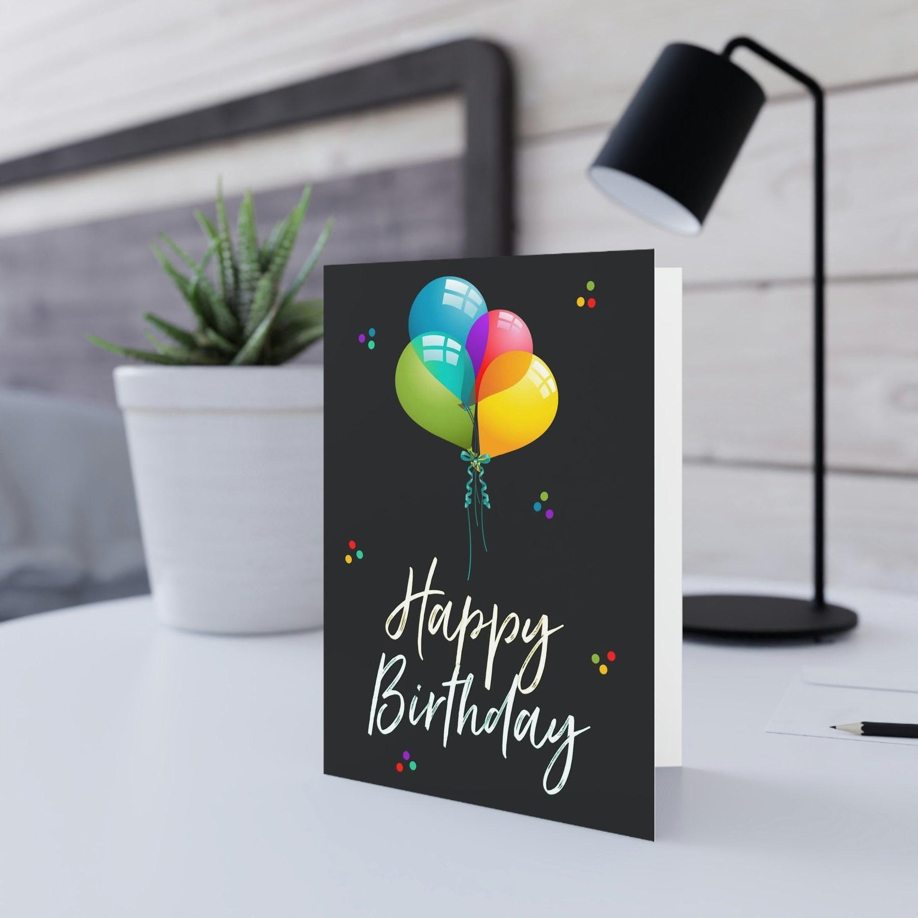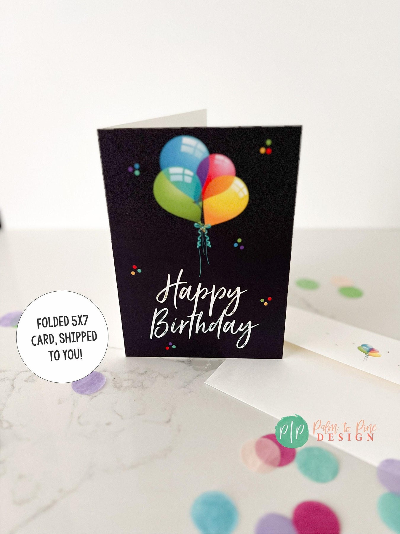 A birthday card with colorful balloons on a black background, along with the text "Happy Birthday" written on it. The card is folded and appears to be a 5x7 card that has been shipped to the recipient.