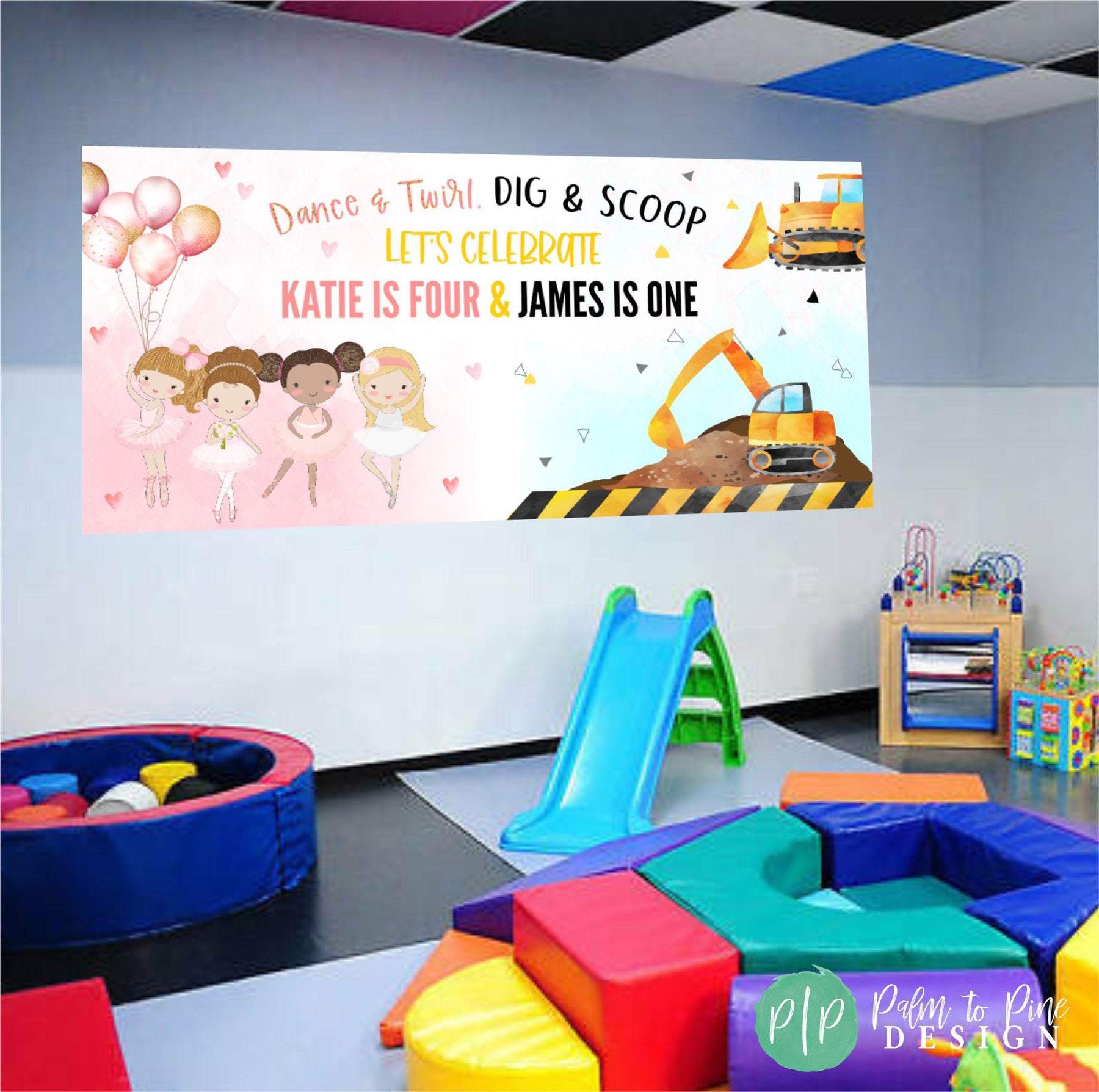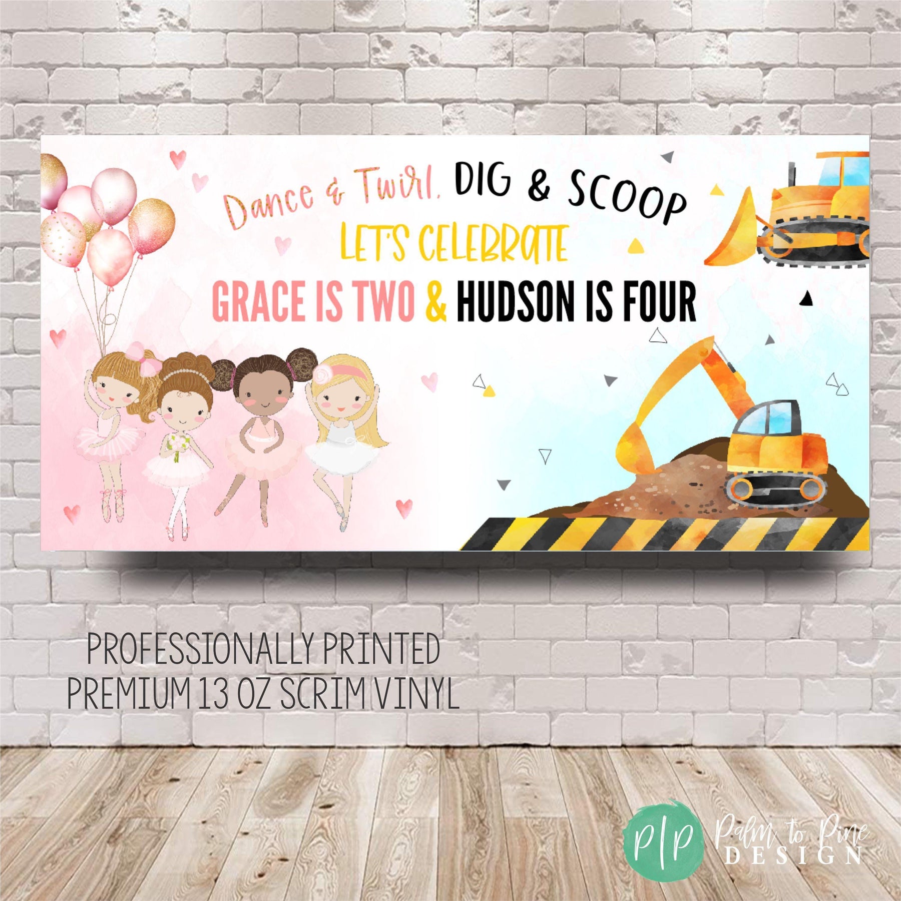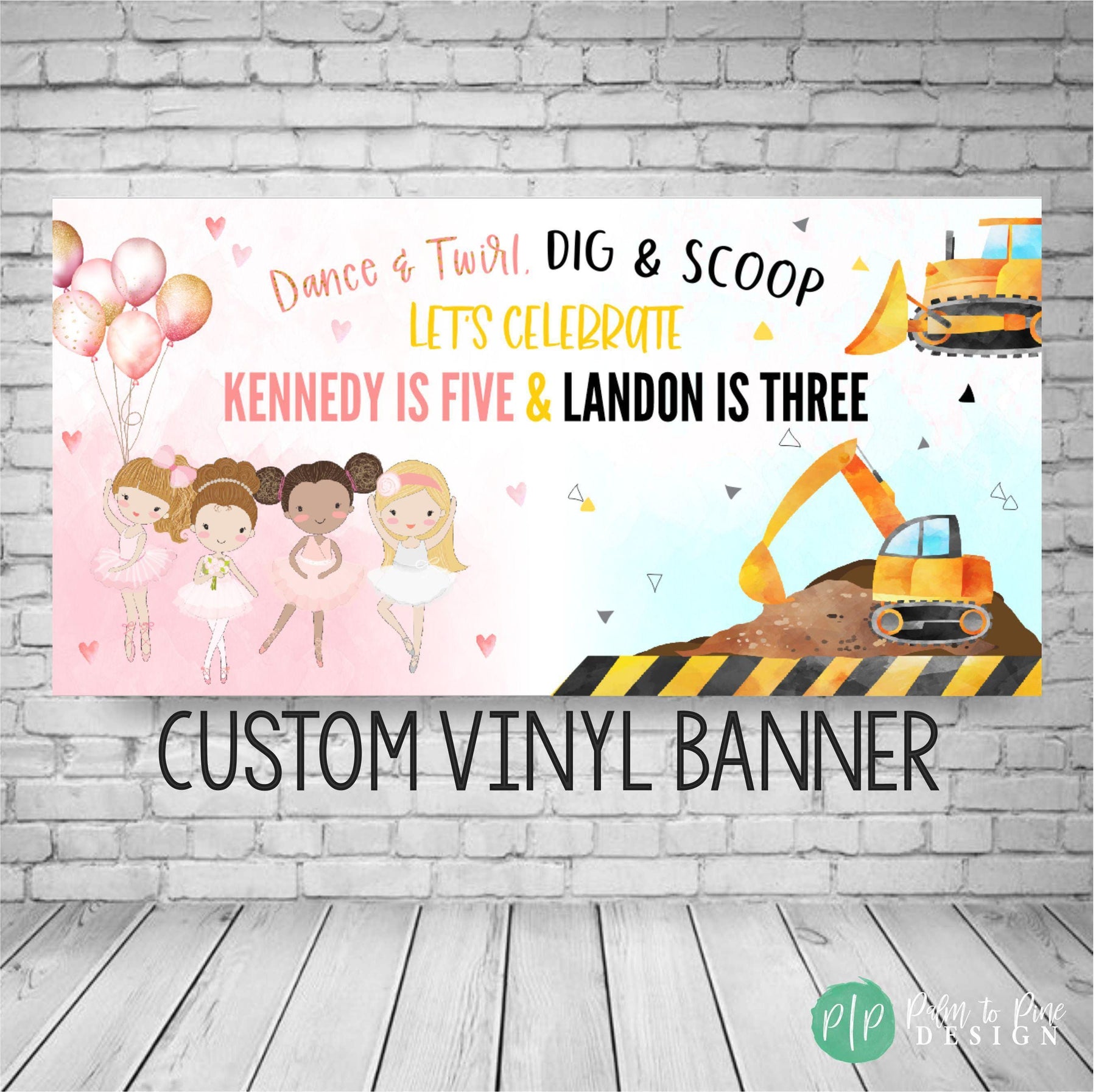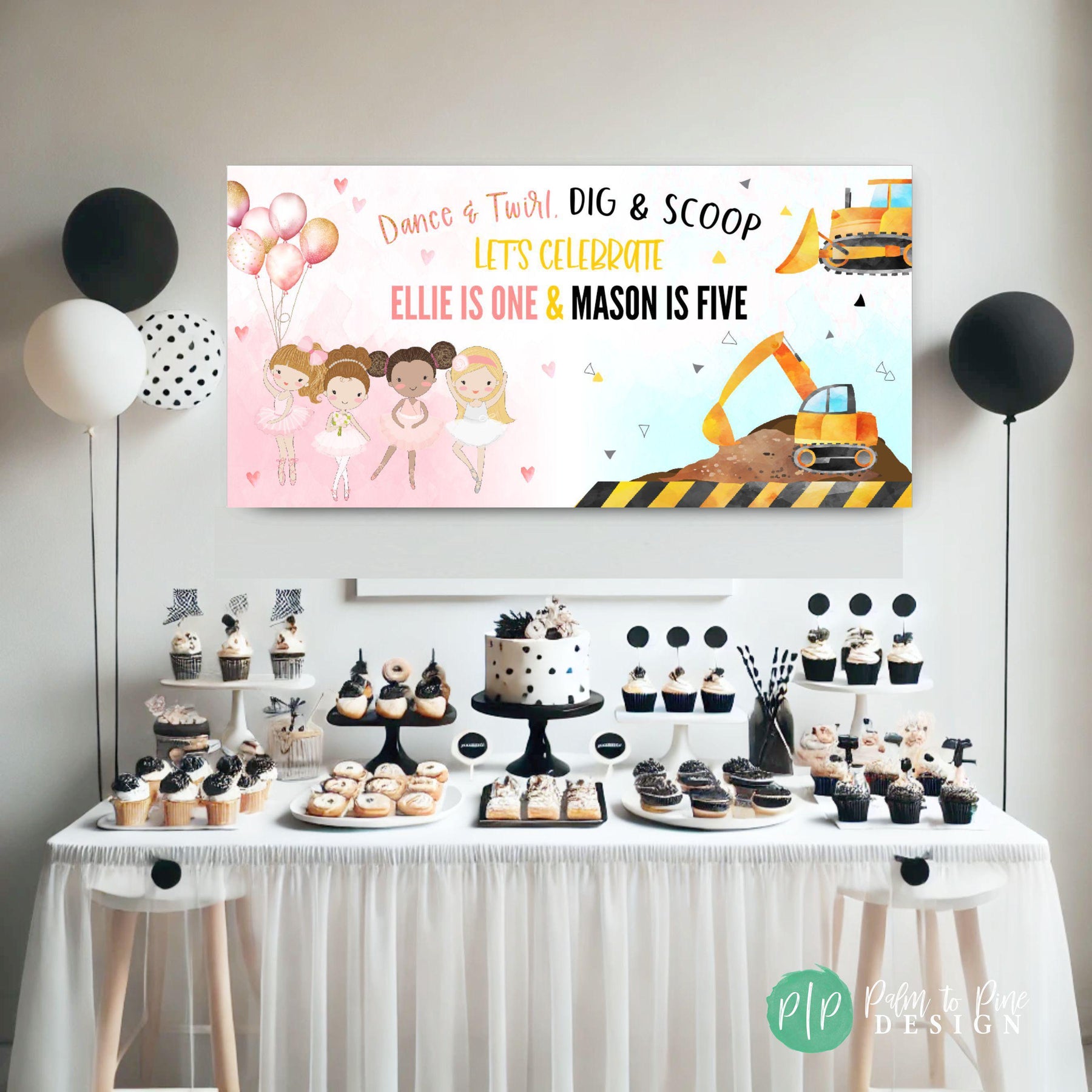Make your little ones’ birthday unforgettable with this unique personalized Ballerina + Construction-themed joint birthday banner — the perfect blend of sugar and steel for your dancing darling and building buddy! Featuring elegant watercolor pink ballerina clipart alongside bold yellow and black construction details, this banner celebrates both siblings' personalities in one fun and cohesive design!