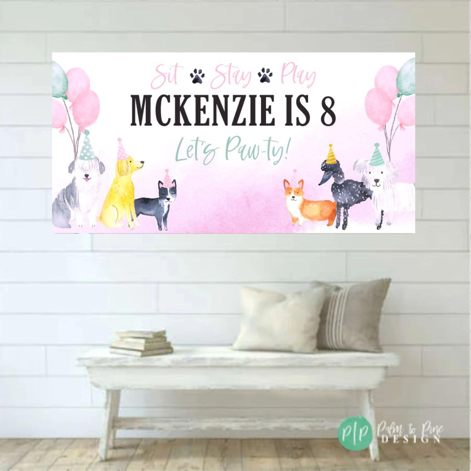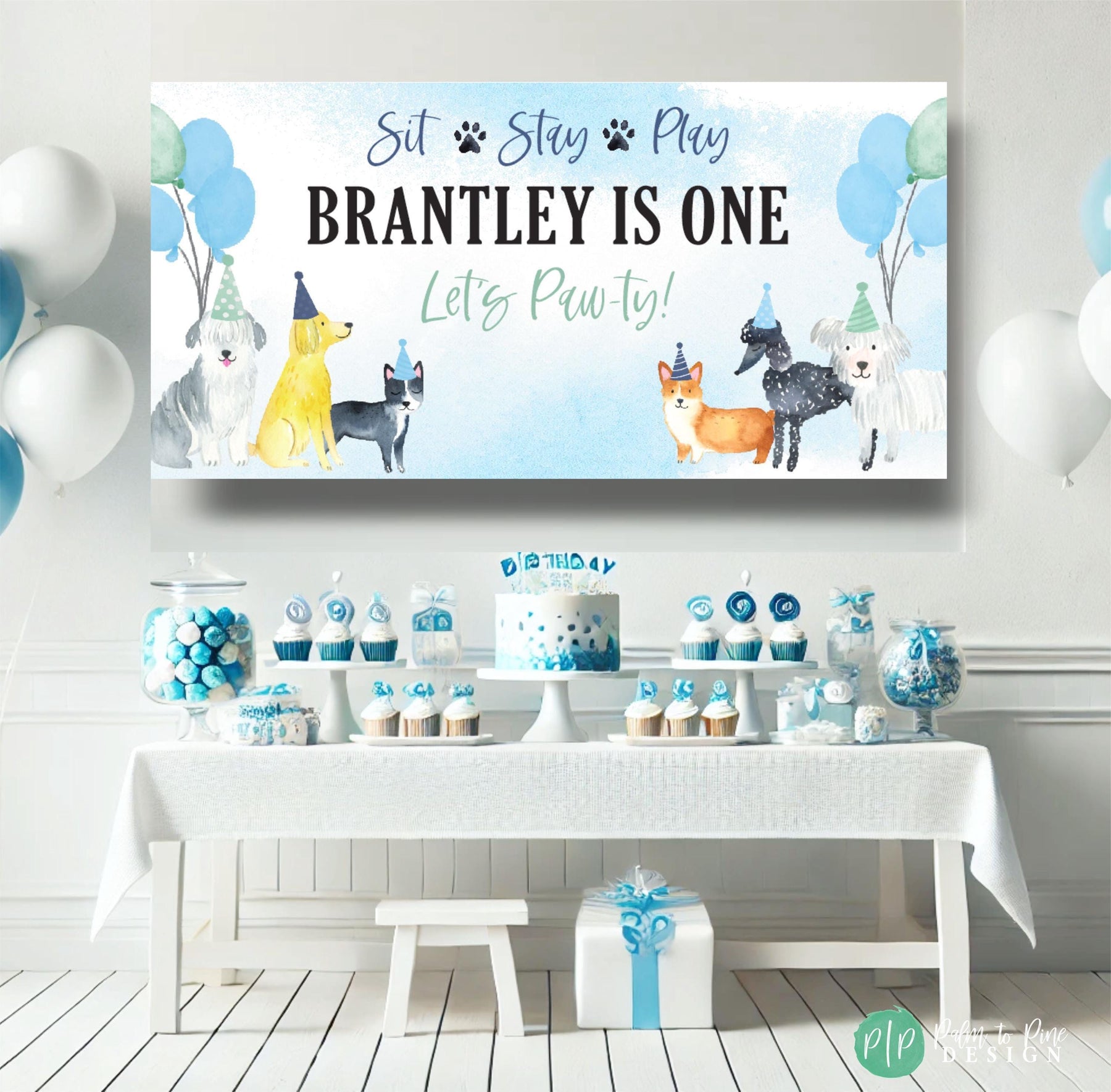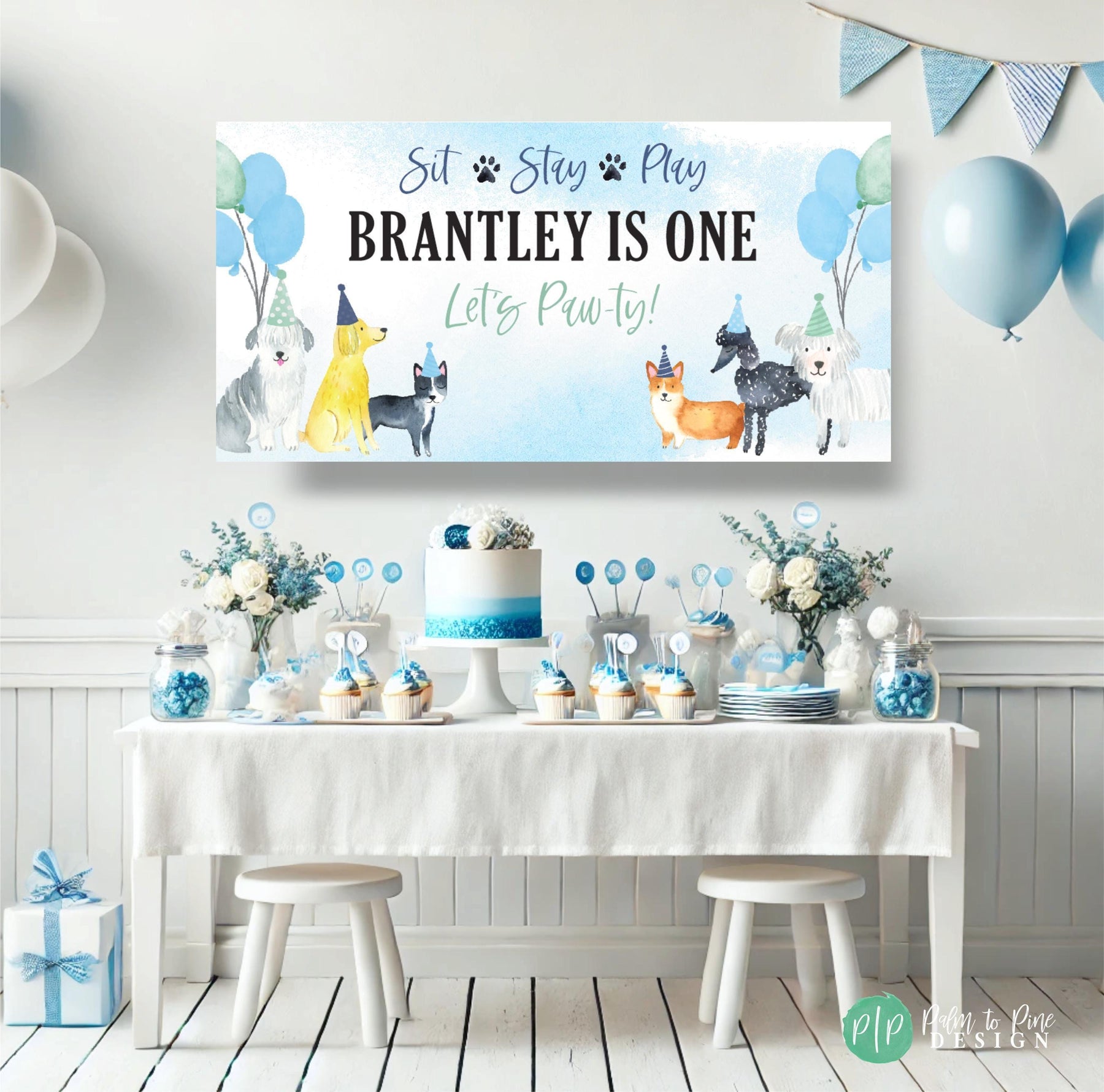 This watercolor dog themed birthday banner is perfect for your puppy dog obsessed boys birthday party. The watercolor dogs and light blue background with festive navy and mint balloons are the perfect decoration for your puppy birthday party for a boy or girl. The colors can also be changed (See listing photos for other colors, or leave a personalization note and I can match your party color theme)