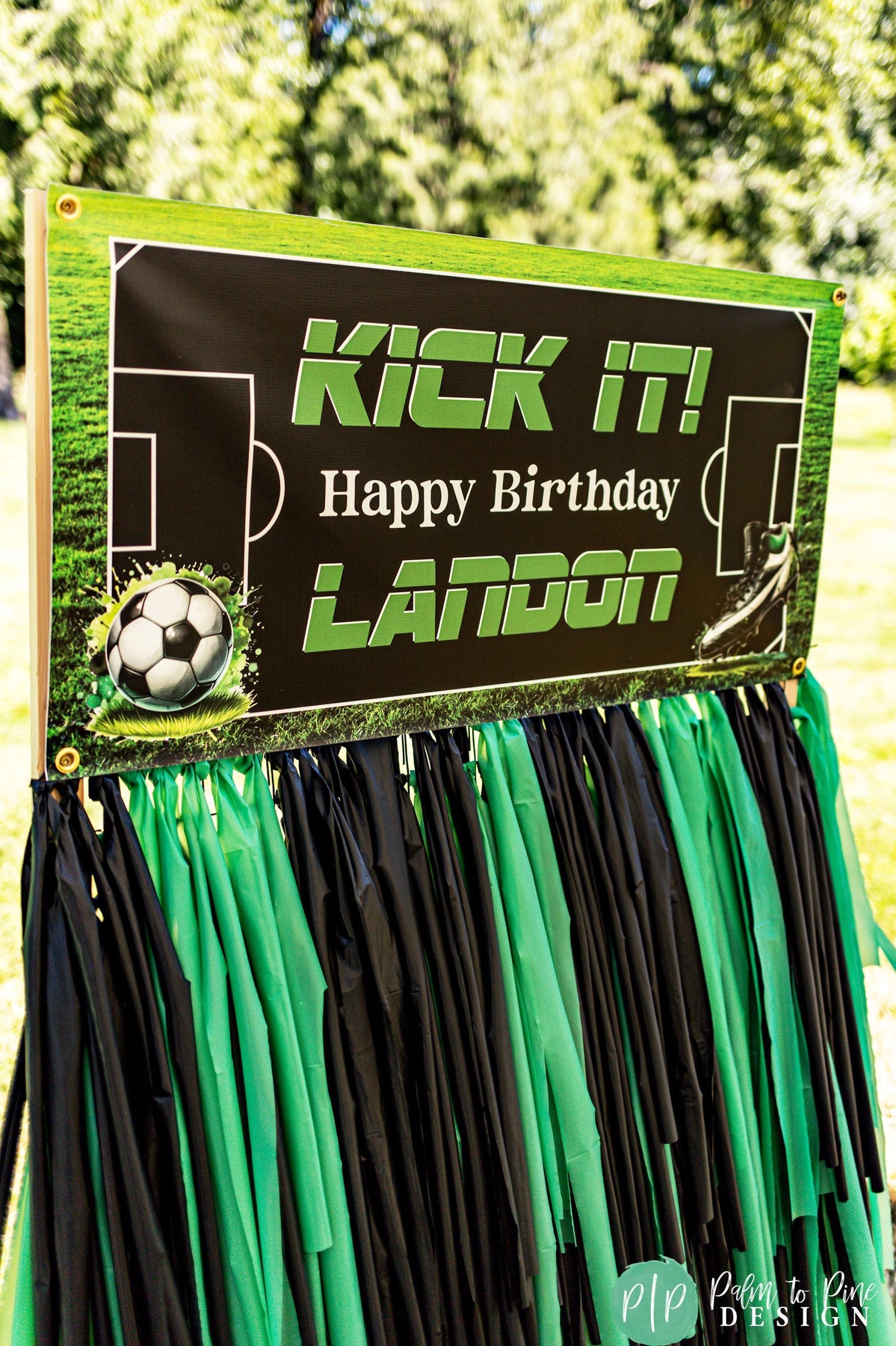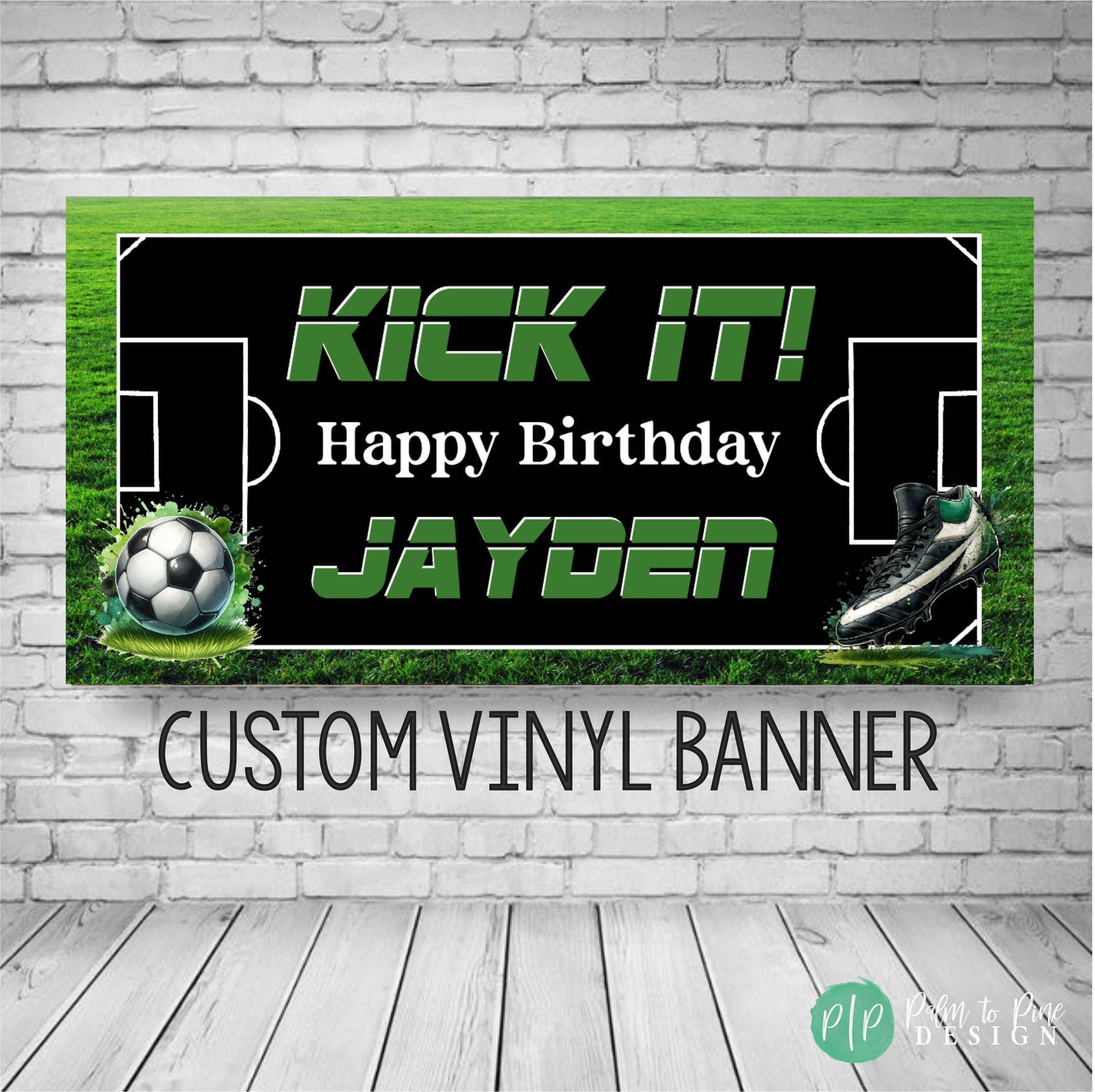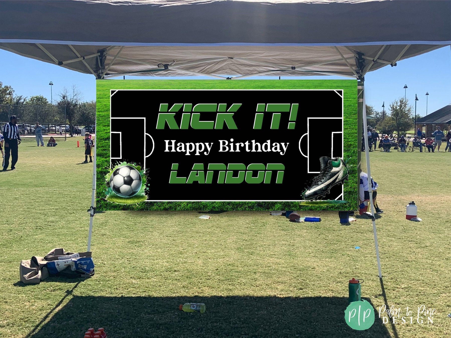 A great way to show your team pride for a sports birthday party! Use this birthday soccer banner in front of a dessert table, as a decoration, in the yard as a personalized yard banner or as a welcome banner to greet guests at your kids birthday party.