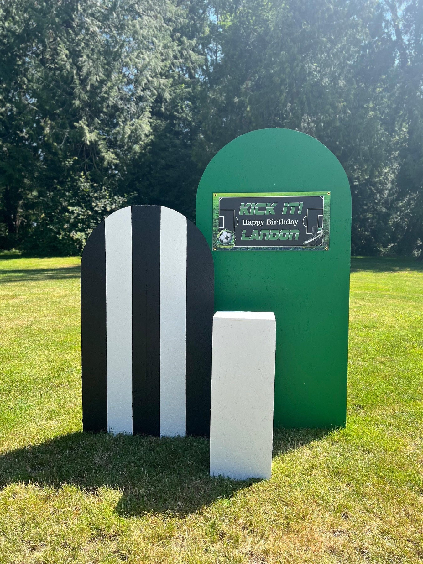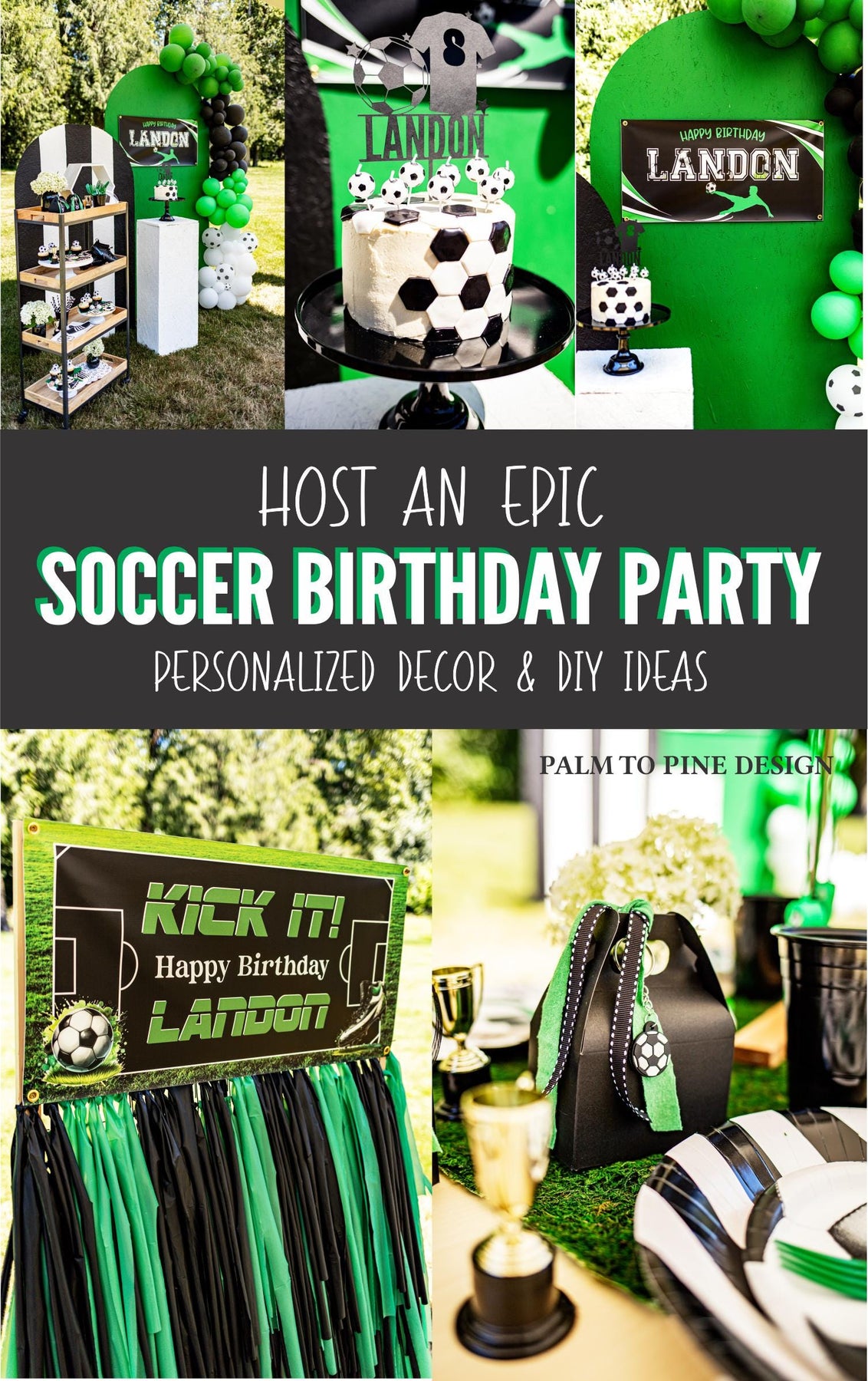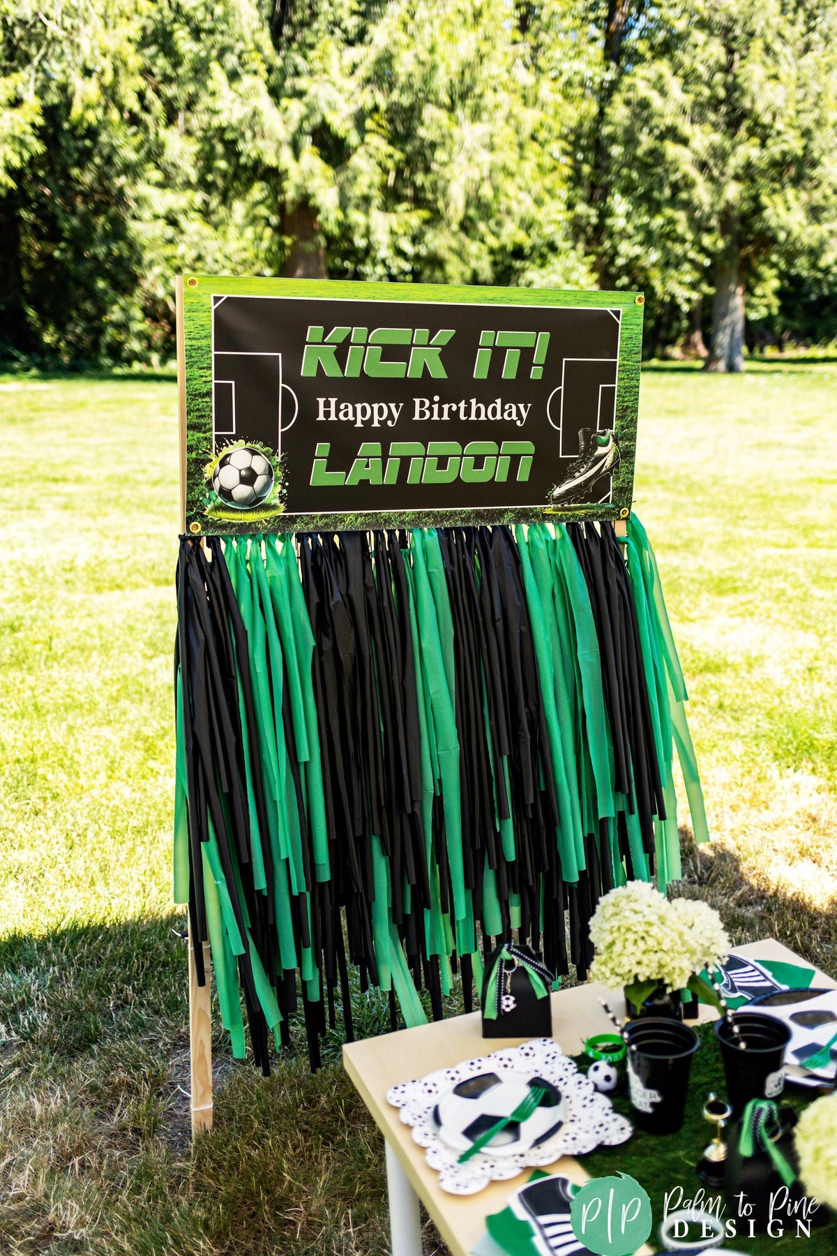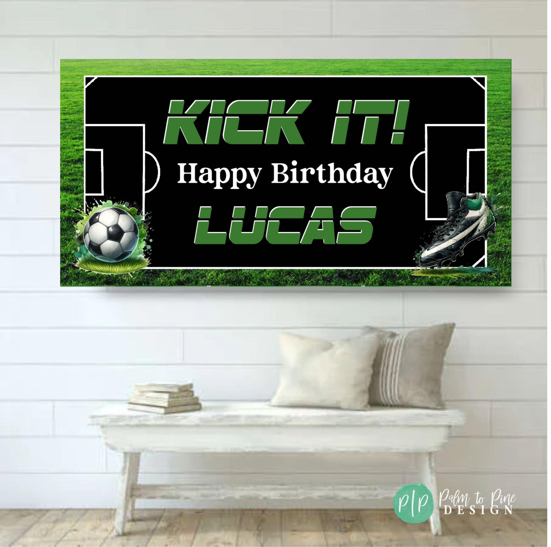 A great way to show your team pride for a sports birthday party! Use this birthday soccer banner in front of a dessert table, as a decoration, in the yard as a personalized yard banner or as a welcome banner to greet guests at your kids birthday party.