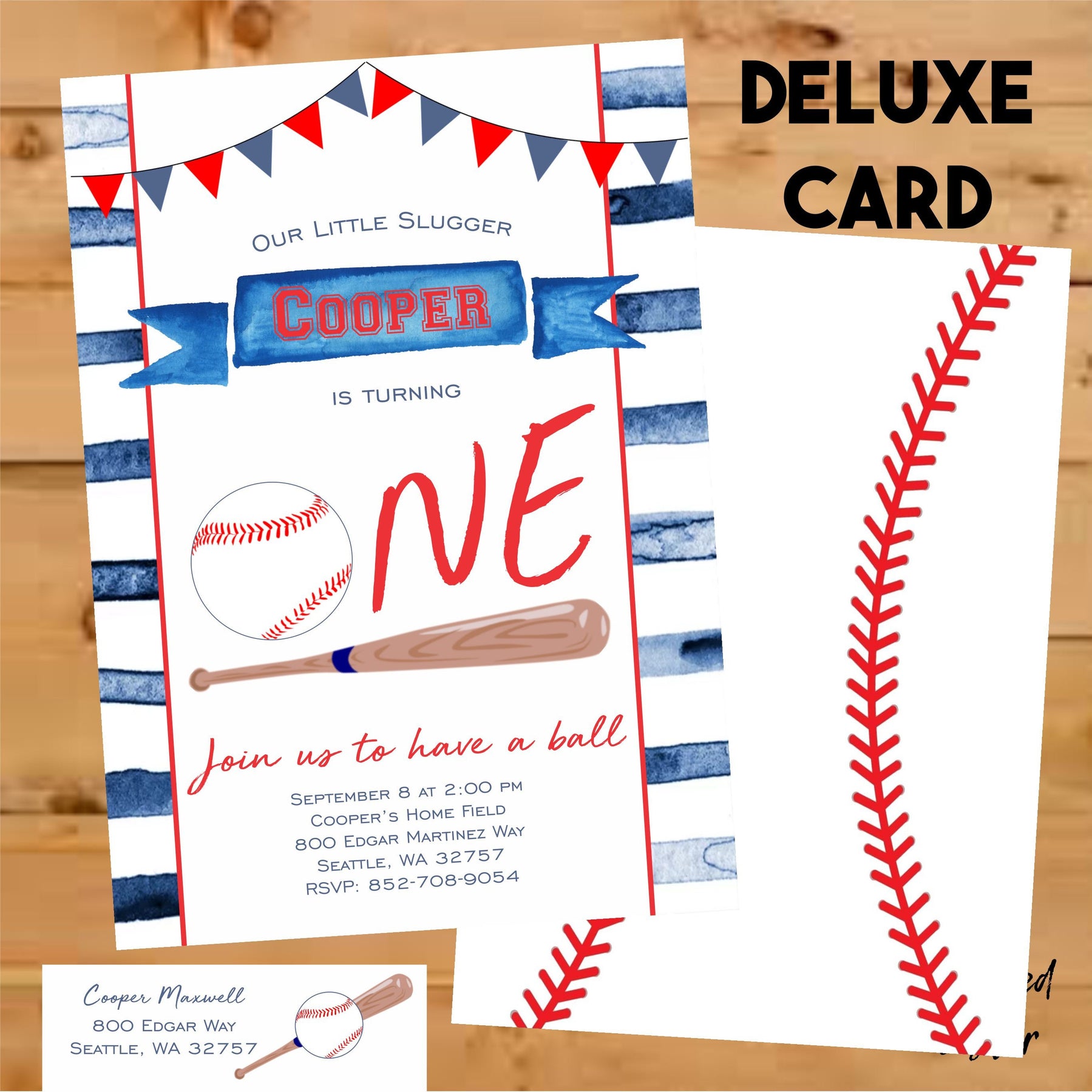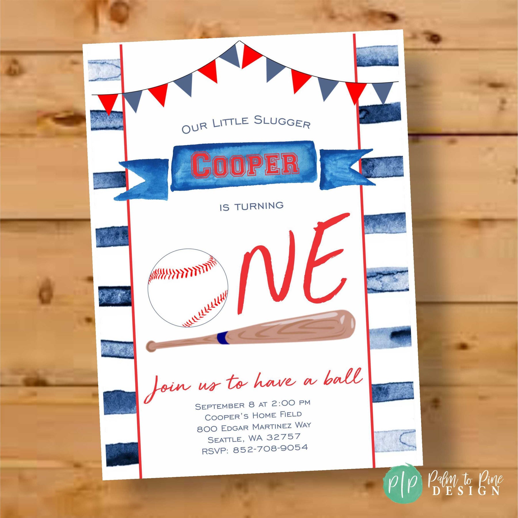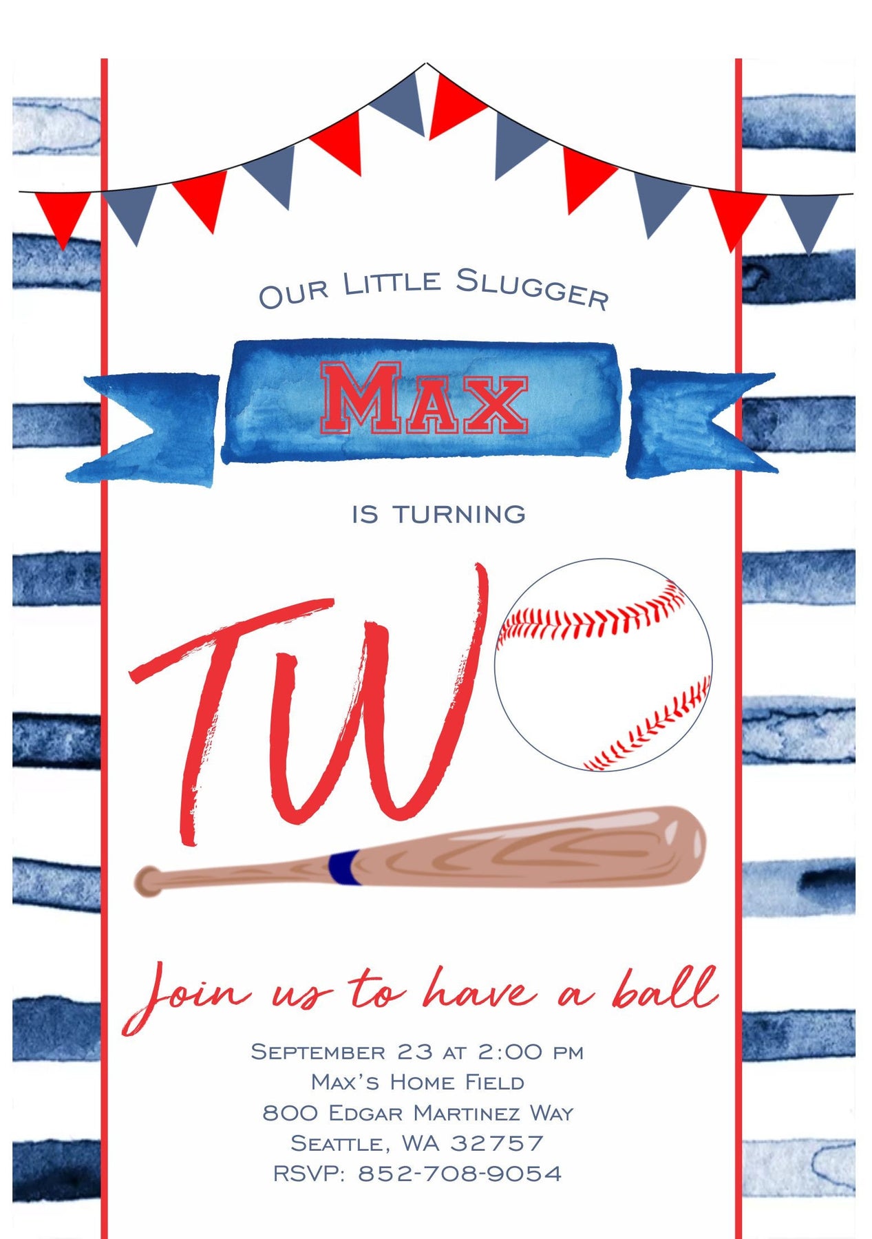 This watercolor baseball theme birthday invitation is perfect for your son or daughters first birthday, second birthday or can be customized for any age child. The watercolor striped blue background, and flag bunting make the perfect colors for your baseball birthday party theme.