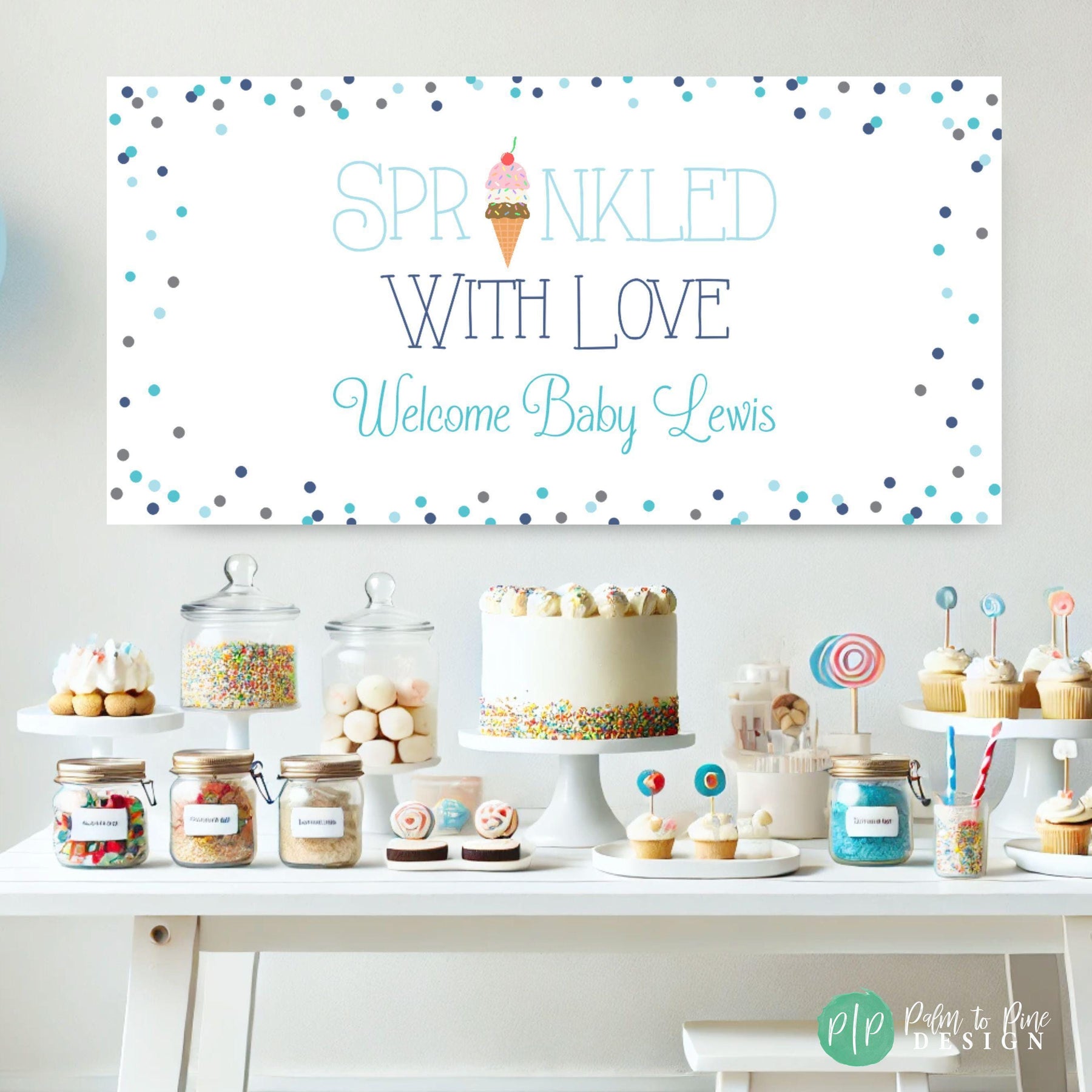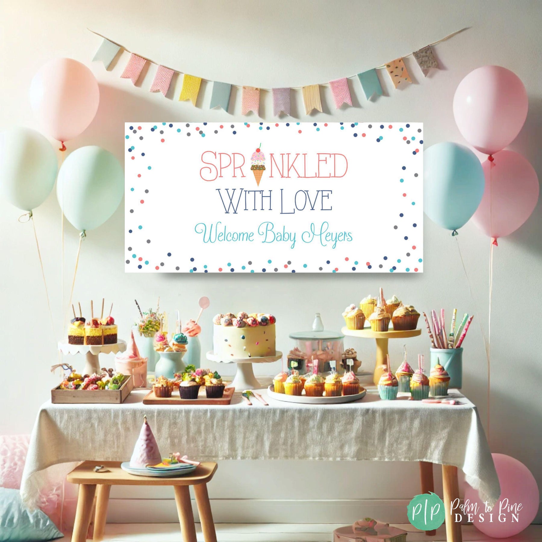 This personalized Sprinkled with Love baby shower banner with pastel rainbow sprinkles and ice cream cone is the perfect personalized backdrop to make a statement for your baby shower sprinkle party. The personalized Welcome Baby Wording and cute ice cream cone and sprinkles background are perfect for any type of baby shower sprinkle and the colors can be customized for a boy or girl too! The wording on this ice cream party banner can also be customized for an ice cream birthday party too, just include your request in your notes to seller section at checkout!