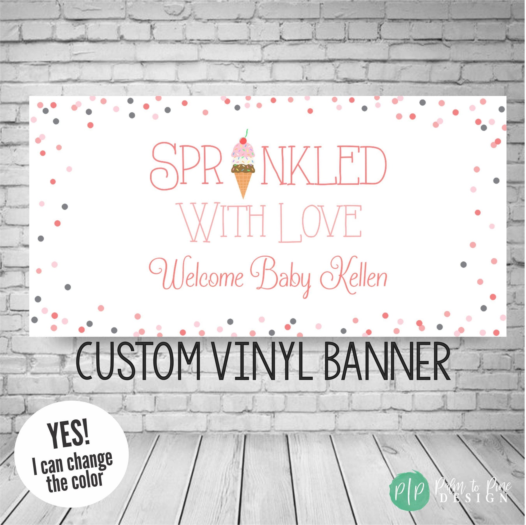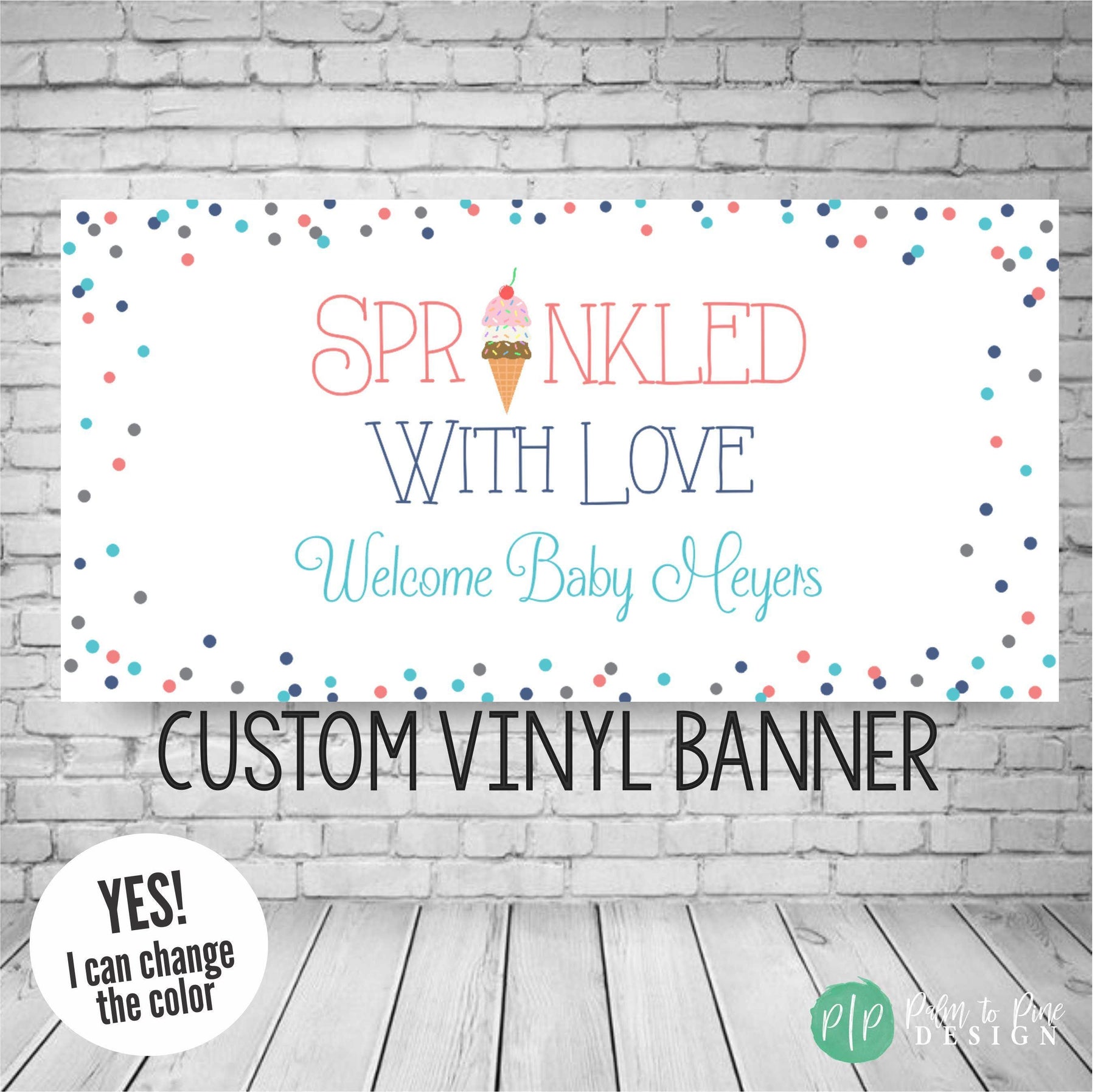BANNER DETAILS: The banner comes in two finishes, digital or printed. The printed banner is sized as an 18x36", 24x48", 30x60" or 36"x66", 42x84" or 48x96 and professionally printed on durable 13 oz scrim vinyl (this is a waterproof, super thick and highly durable banner that really makes a WOW statement at your ice cream themed baby shower sprinkle party!)