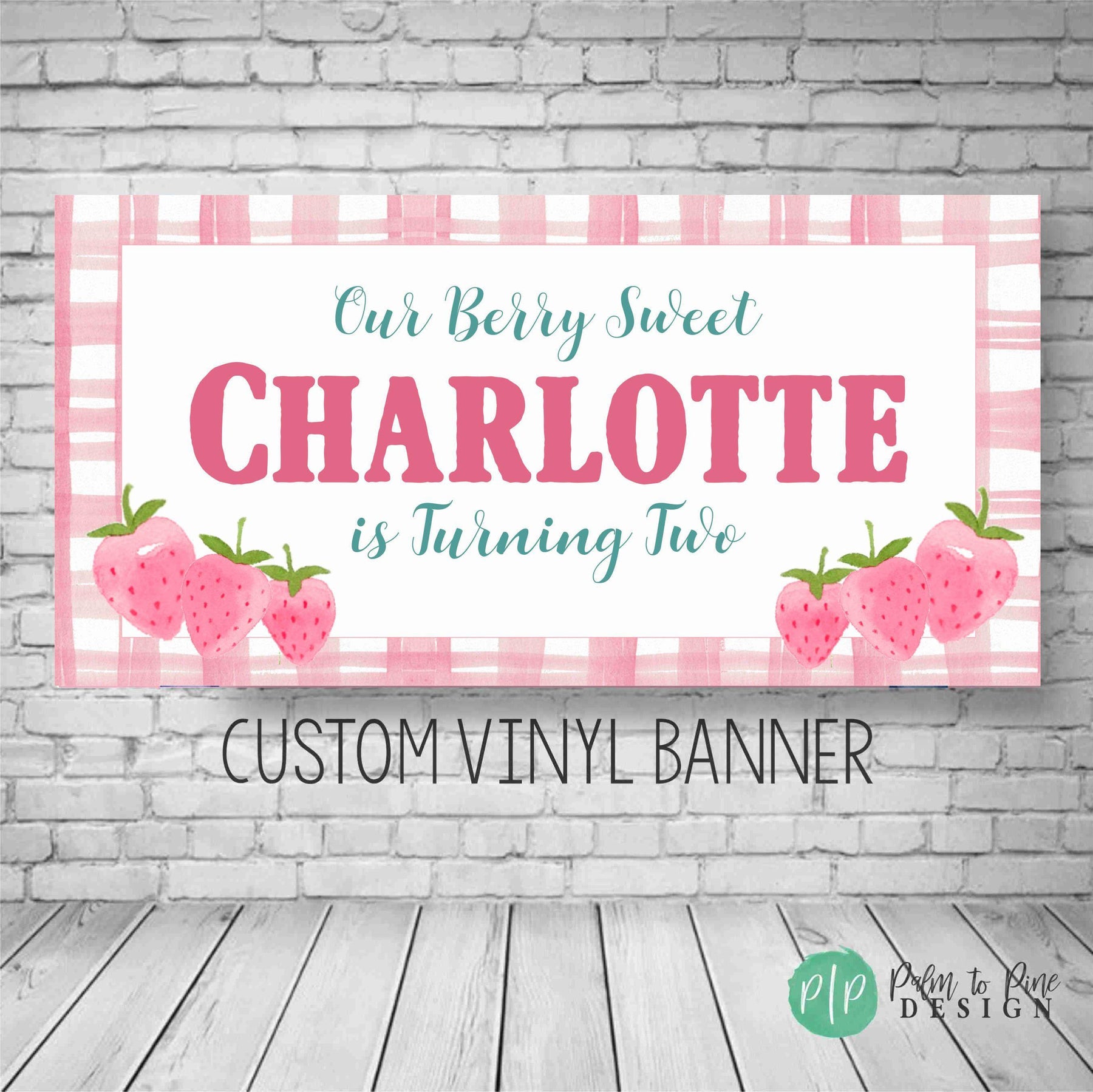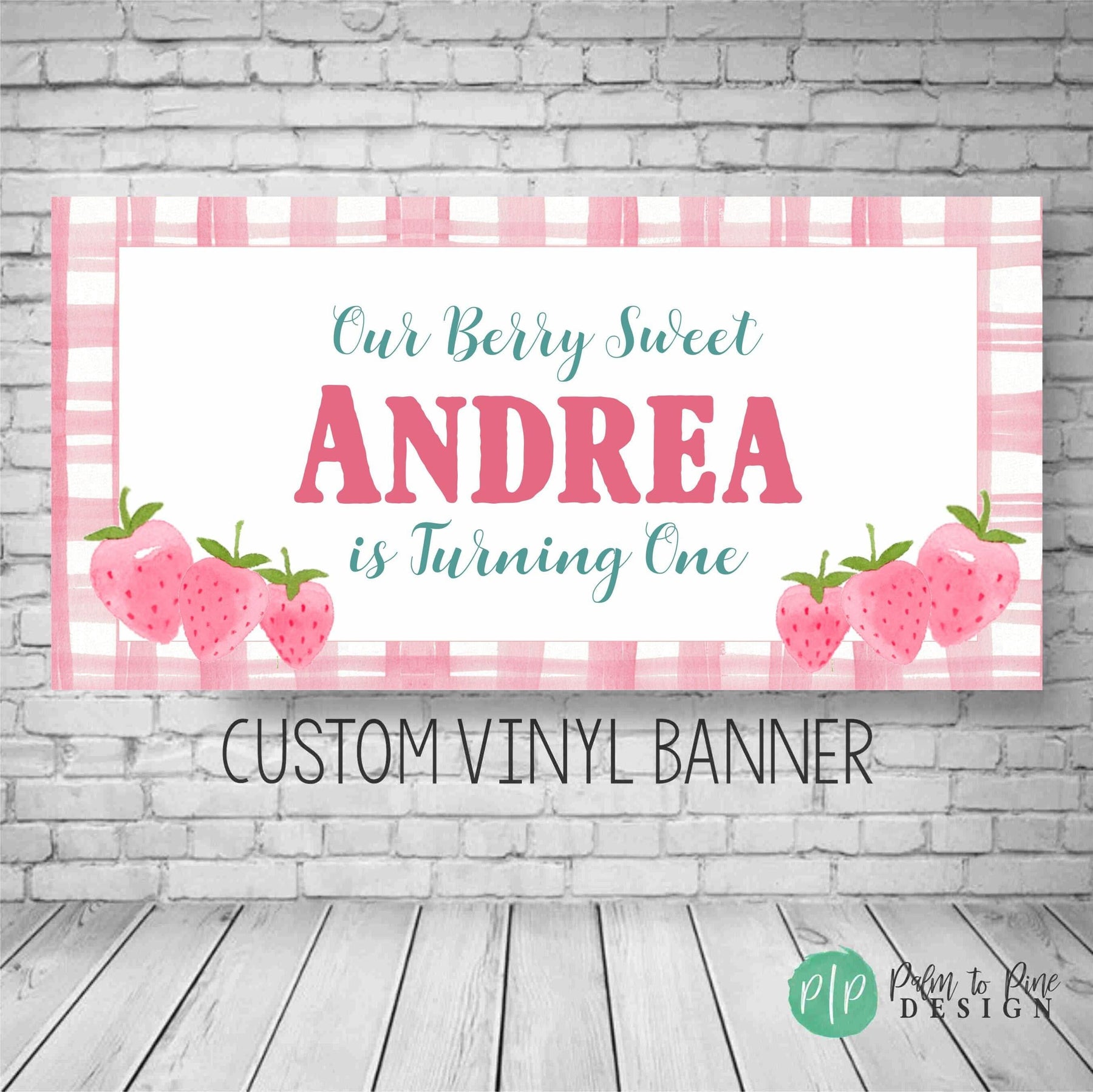 This pink gingham watercolor strawberry birthday banner is the perfect decoration to make a statement for your berry sweet Birthday party. The wording and age is customized for your girls berry birthday party making this personalized birthday banner one of a kind. This custom vinyl photo backdrop comes with grommets included for easy hanging or is available as a digital option to print locally and looks darling behind a dessert table at your strawberry shortcake birthday party!