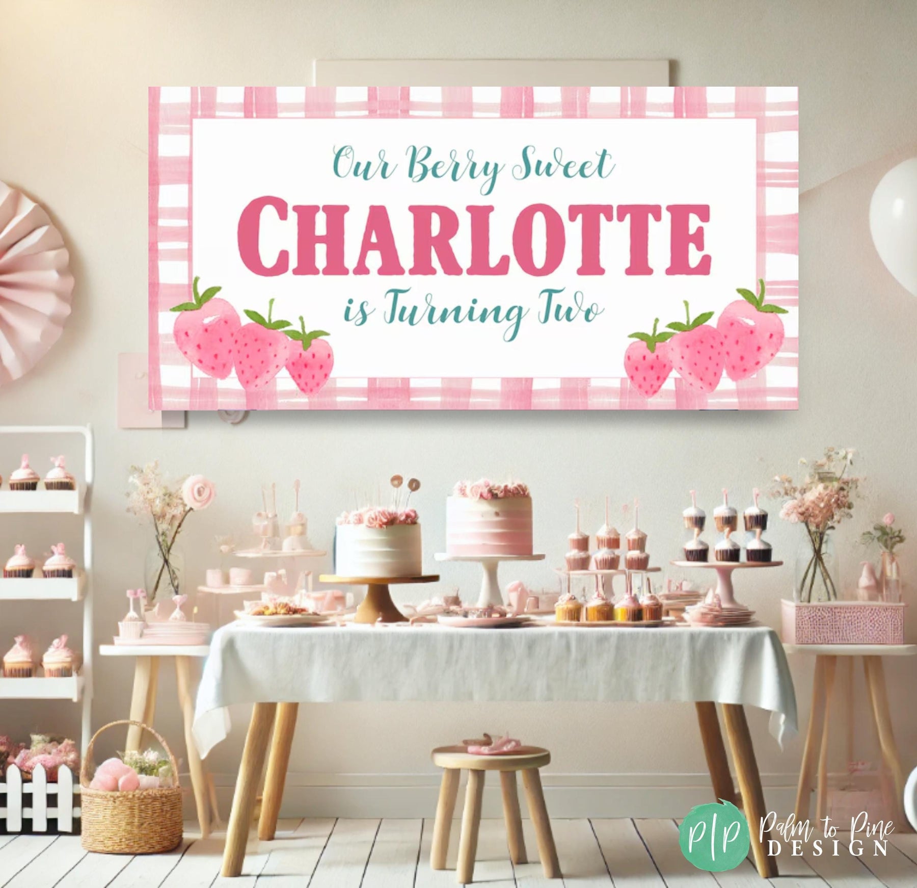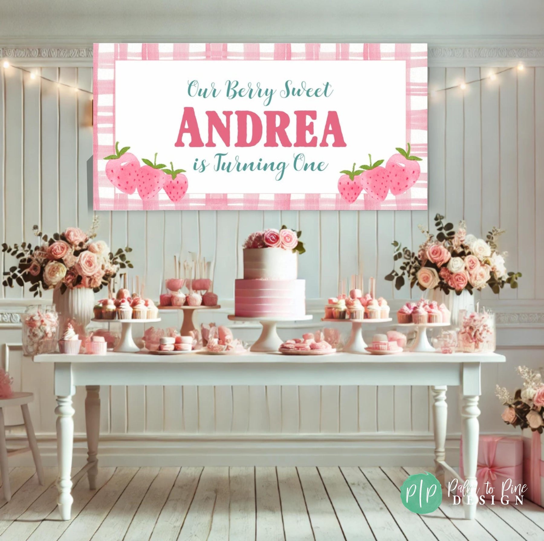 Strawberry Birthday Banner, Pink Gingham, Berry First Birthday Decor (Any Age)