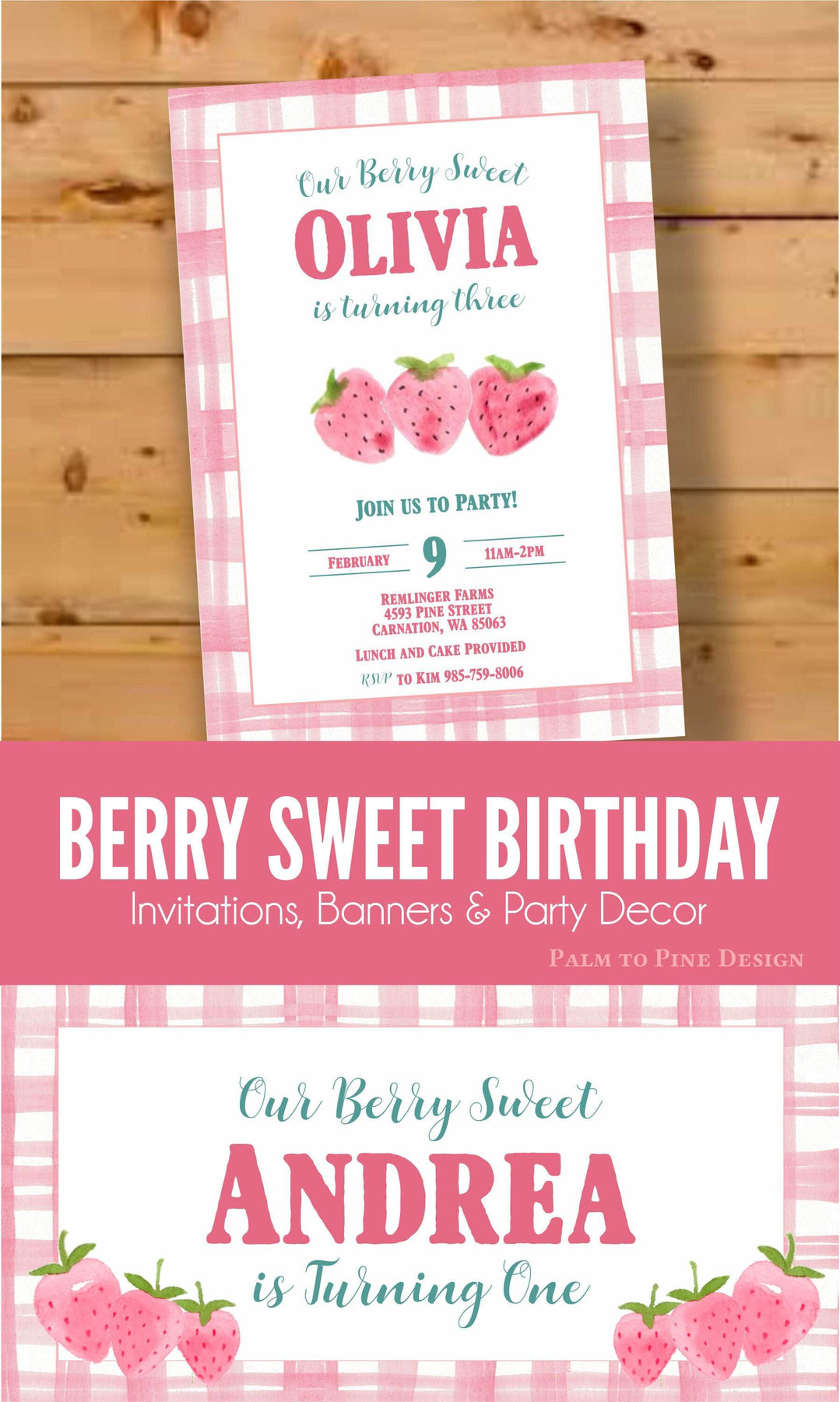 Berry Sweet Strawberry Birthday banner and invitation for girls birthday party
