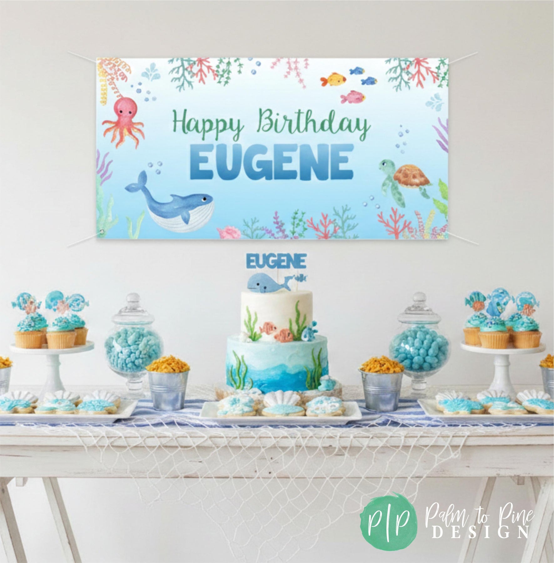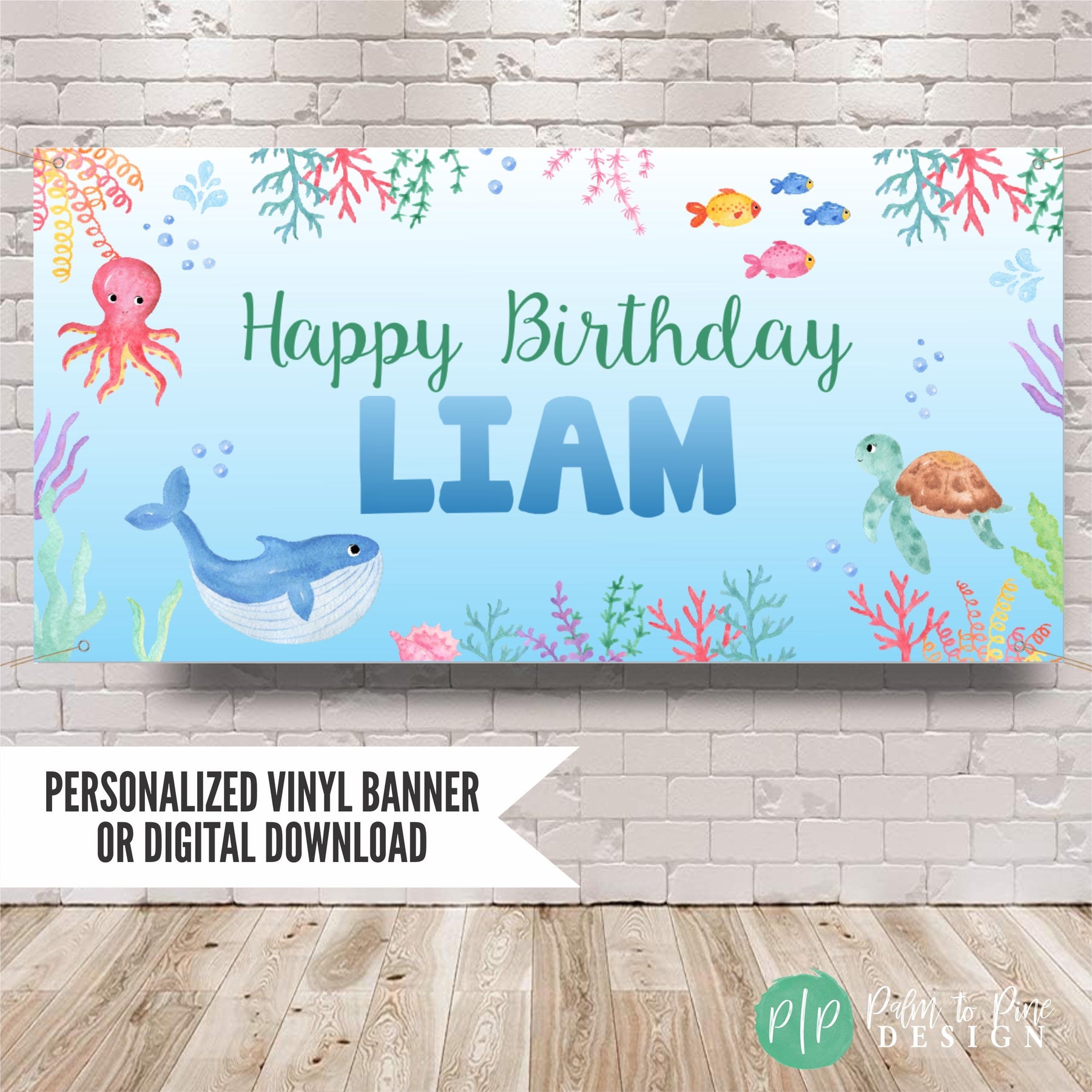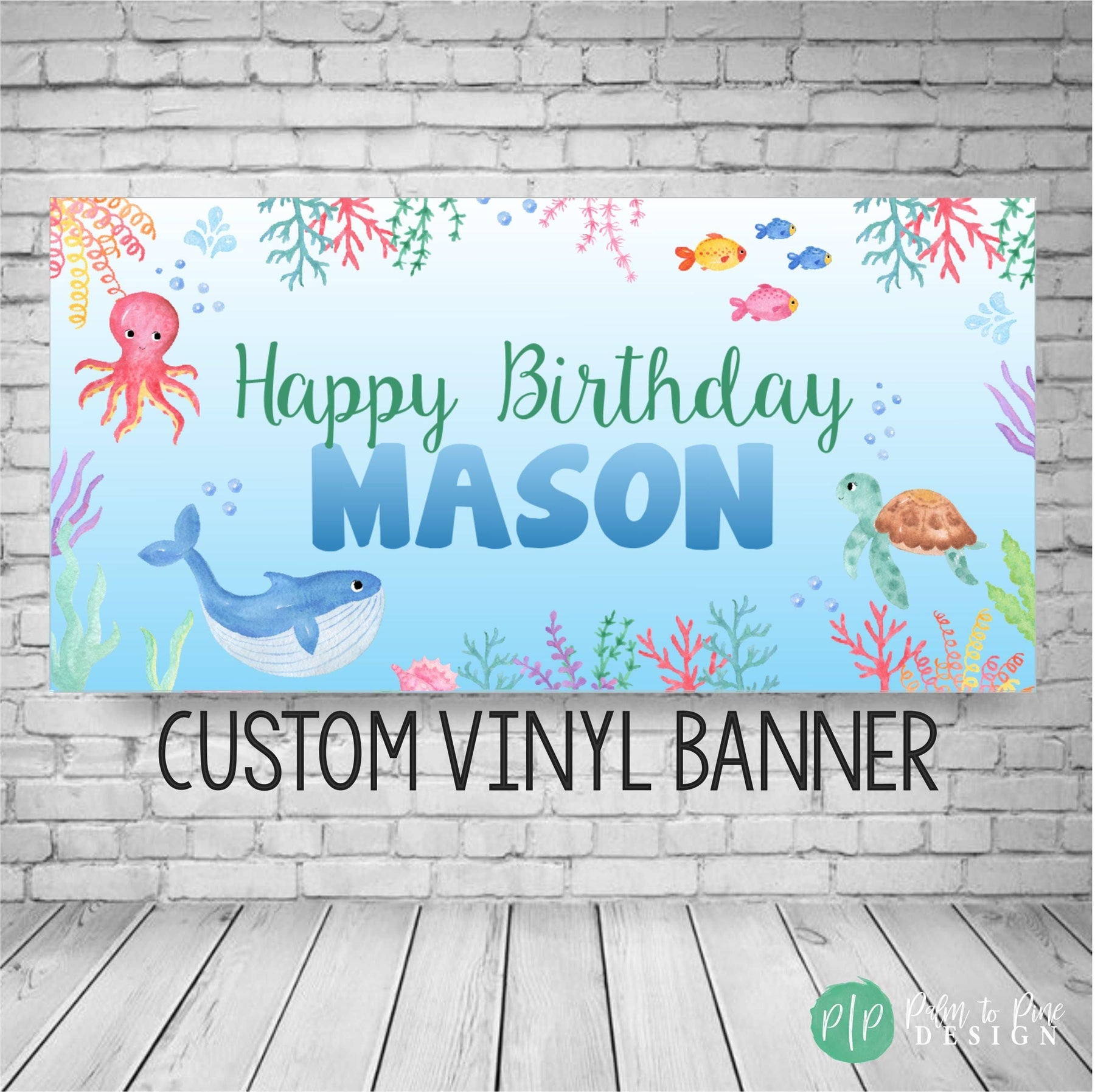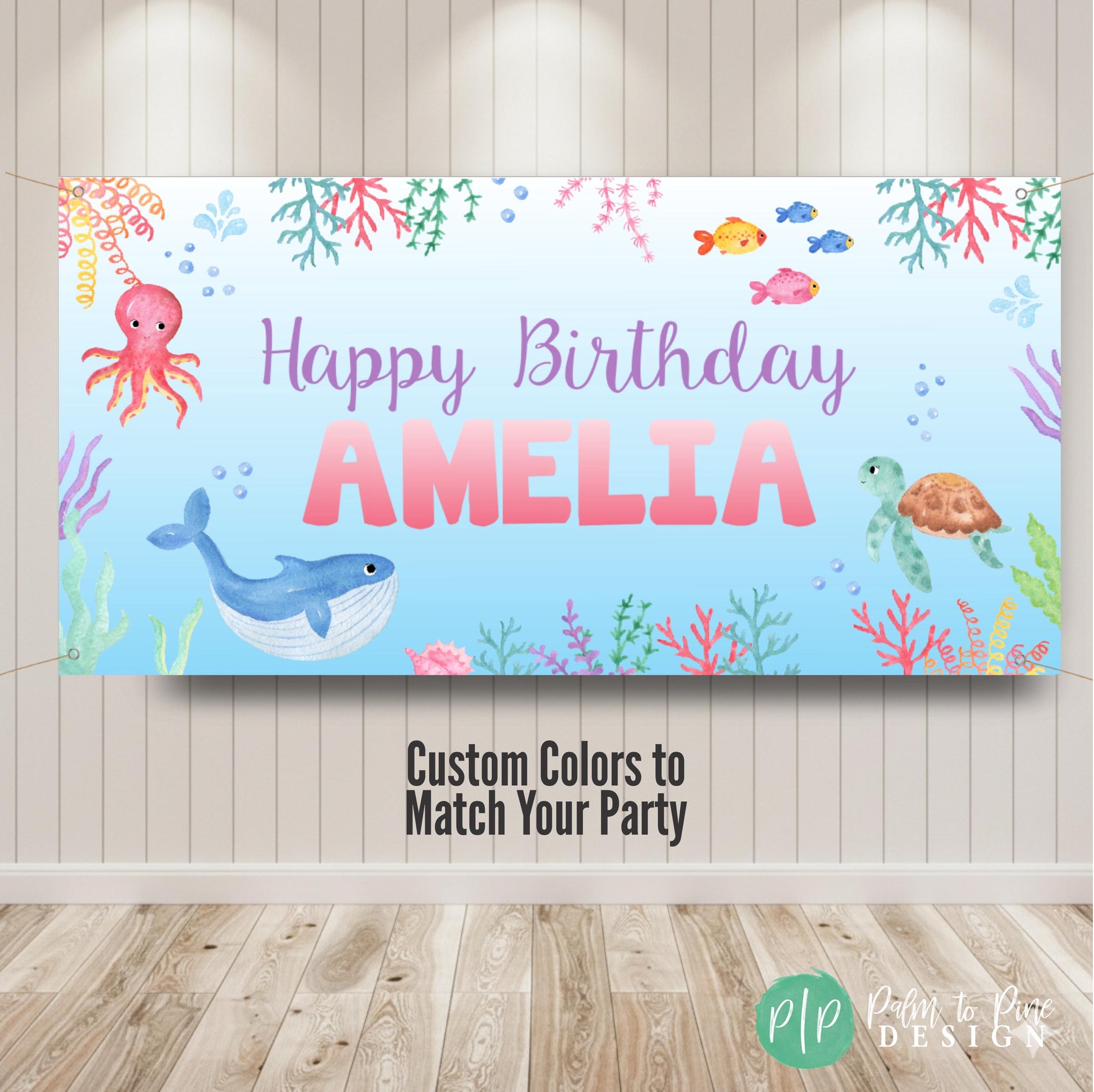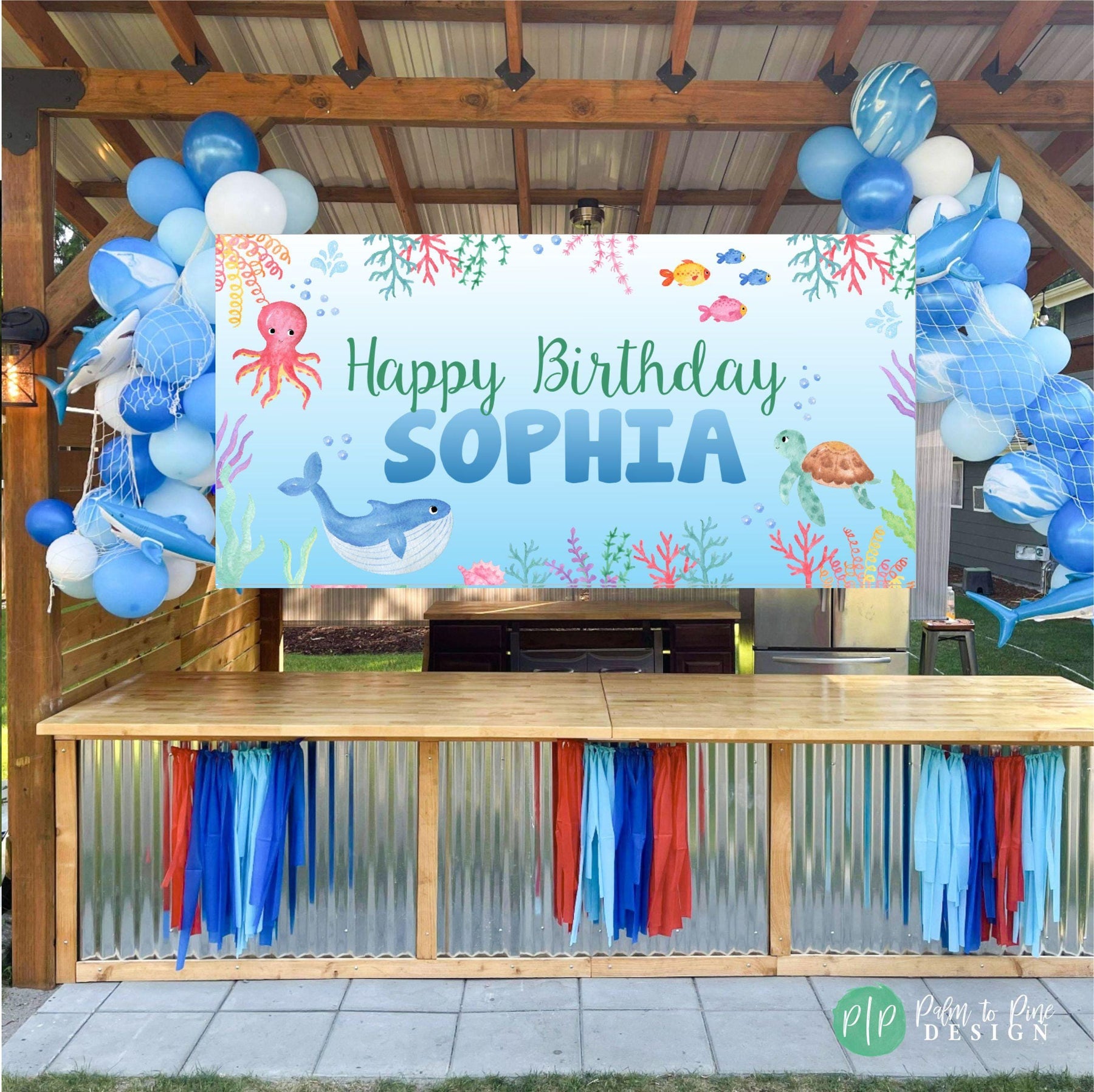 The watercolor blue background with fish, an octopus, turtle whale and colorful coral will make your ocean inspired party come together! This durable outdoor or indoor banner is perfect for a pool party, can be used in front of a dessert table, as a decoration near a pool, at an aquarium or as a welcome banner to greet guests at your kids birthday party, or is available as a digital download.