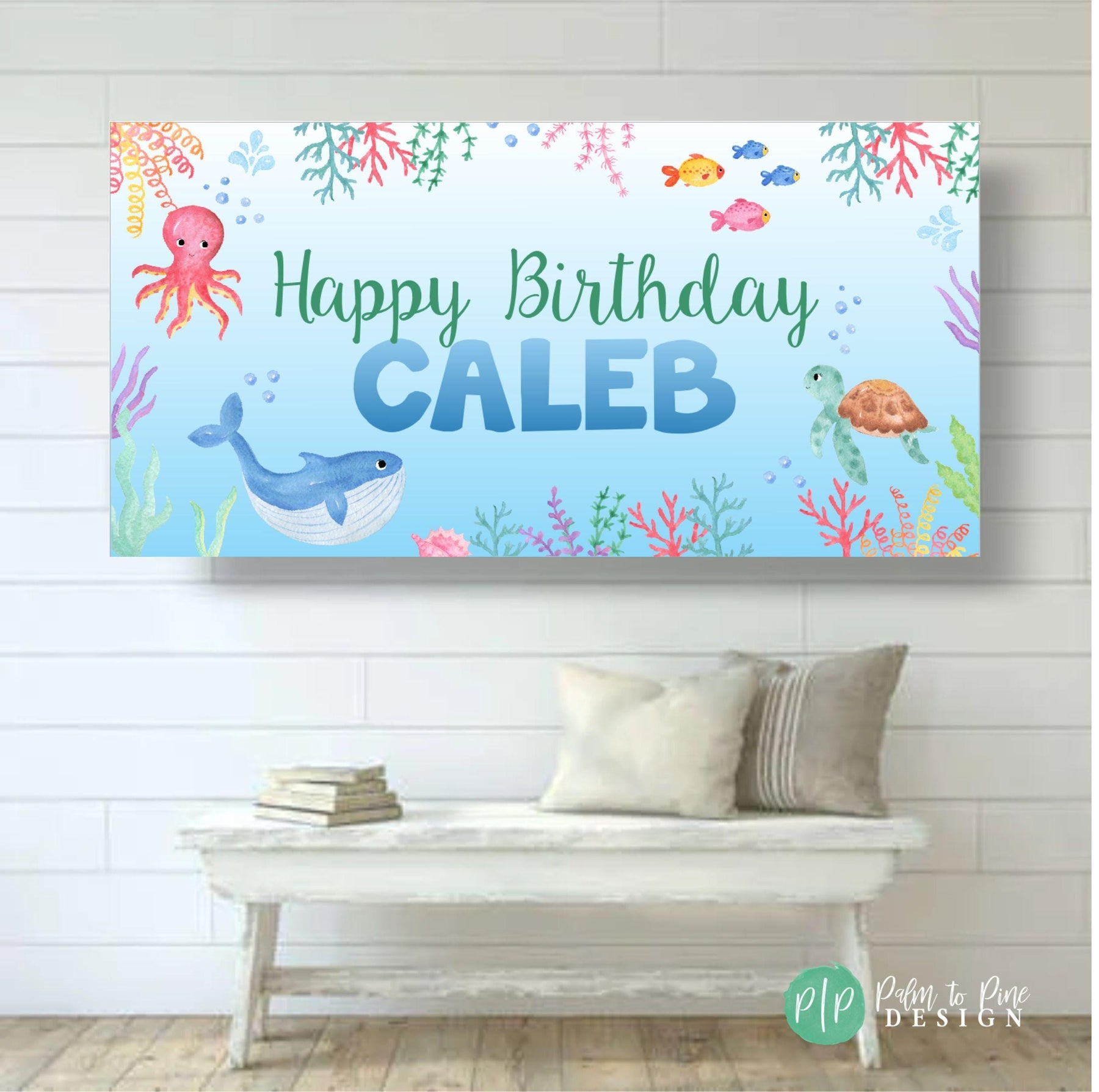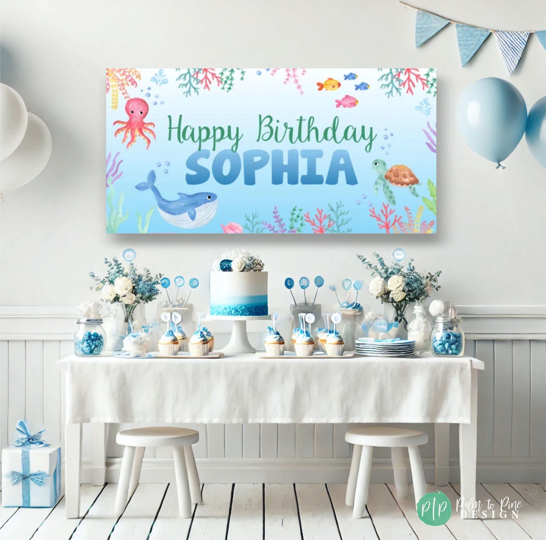This Under the Sea banner is the perfect decoration for your kids ocean animal themed birthday party! The wording on this sealife birthday backdrop can be personalized for your any age, gender or siblings and the colors can be changed to match your ocean party theme.