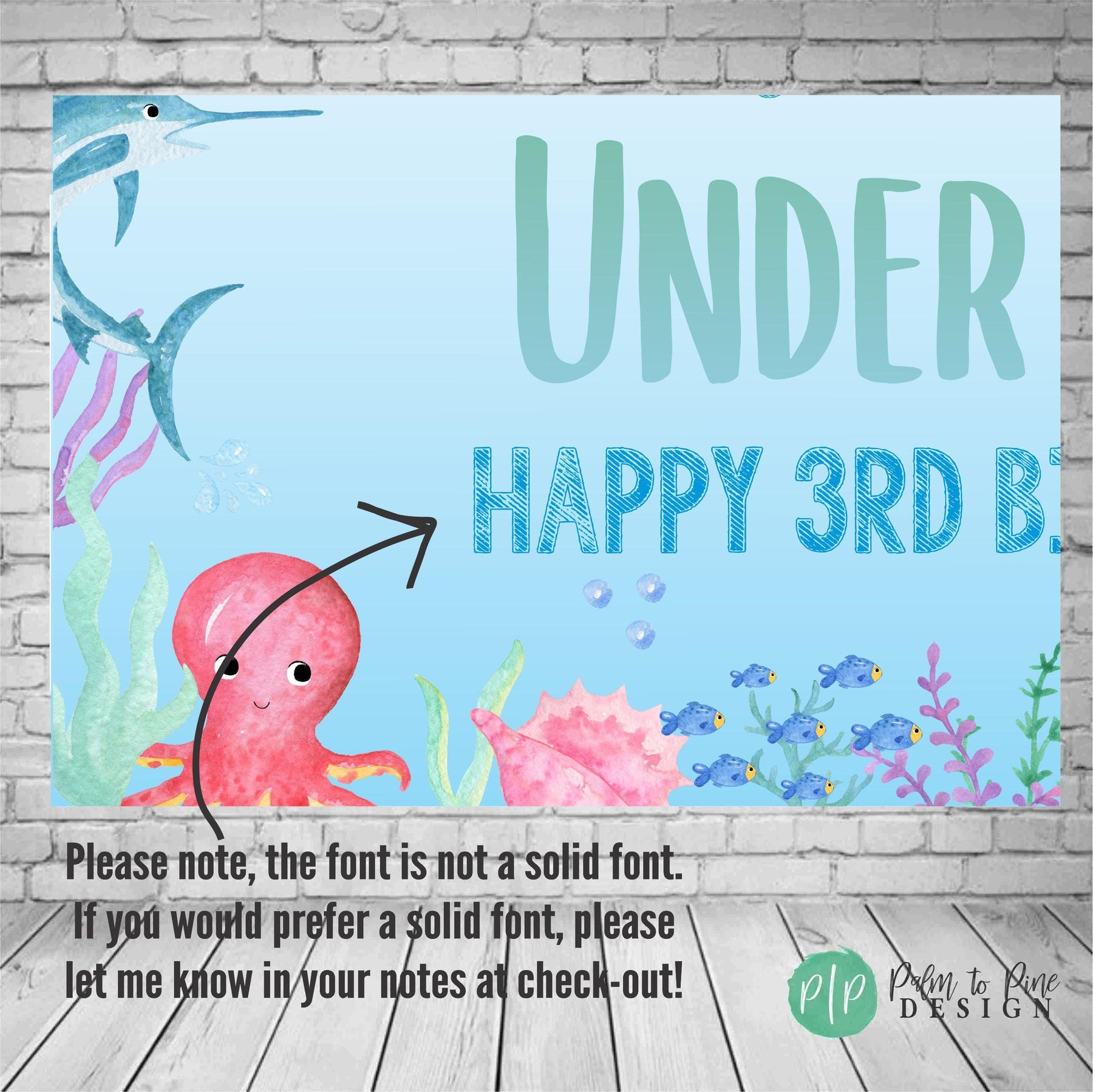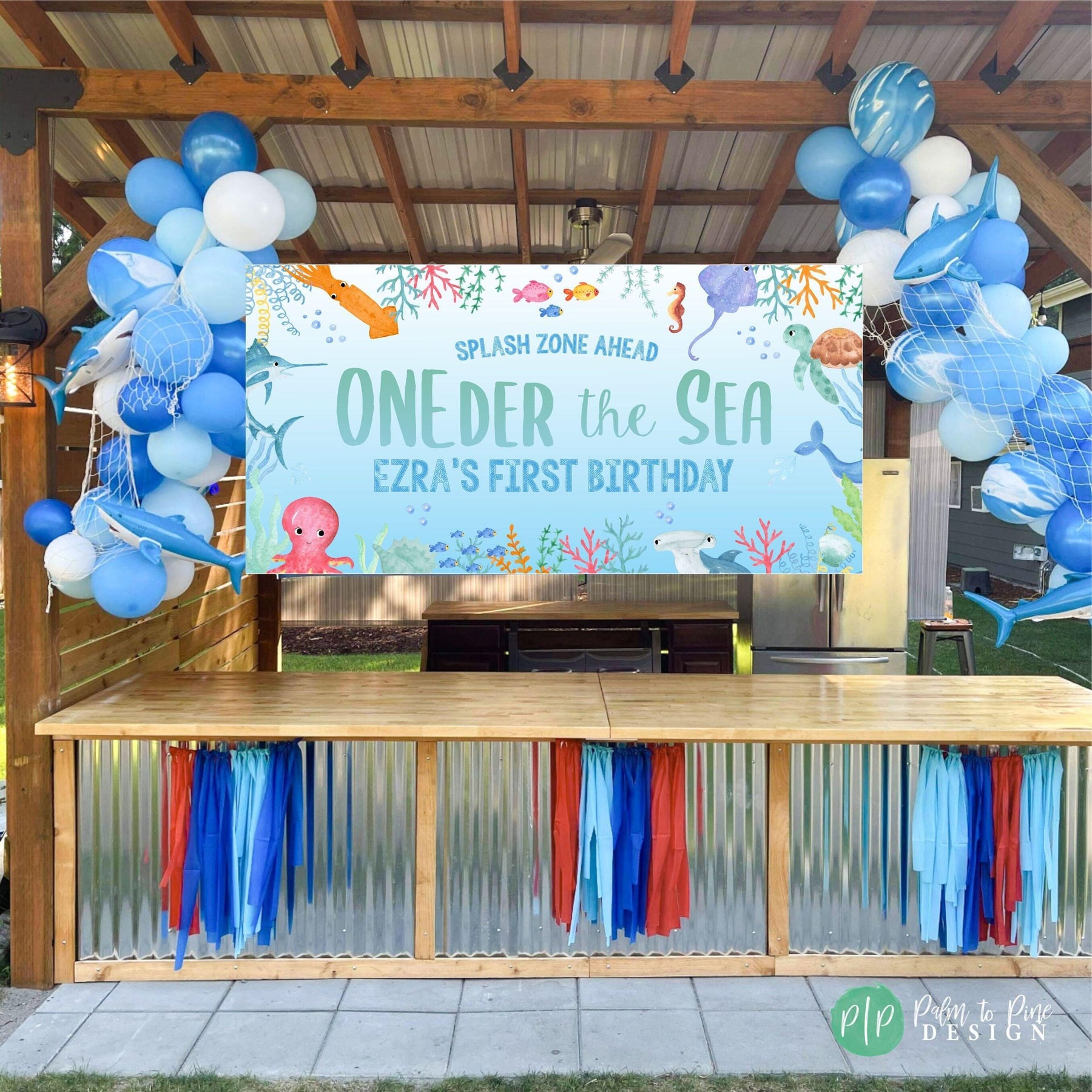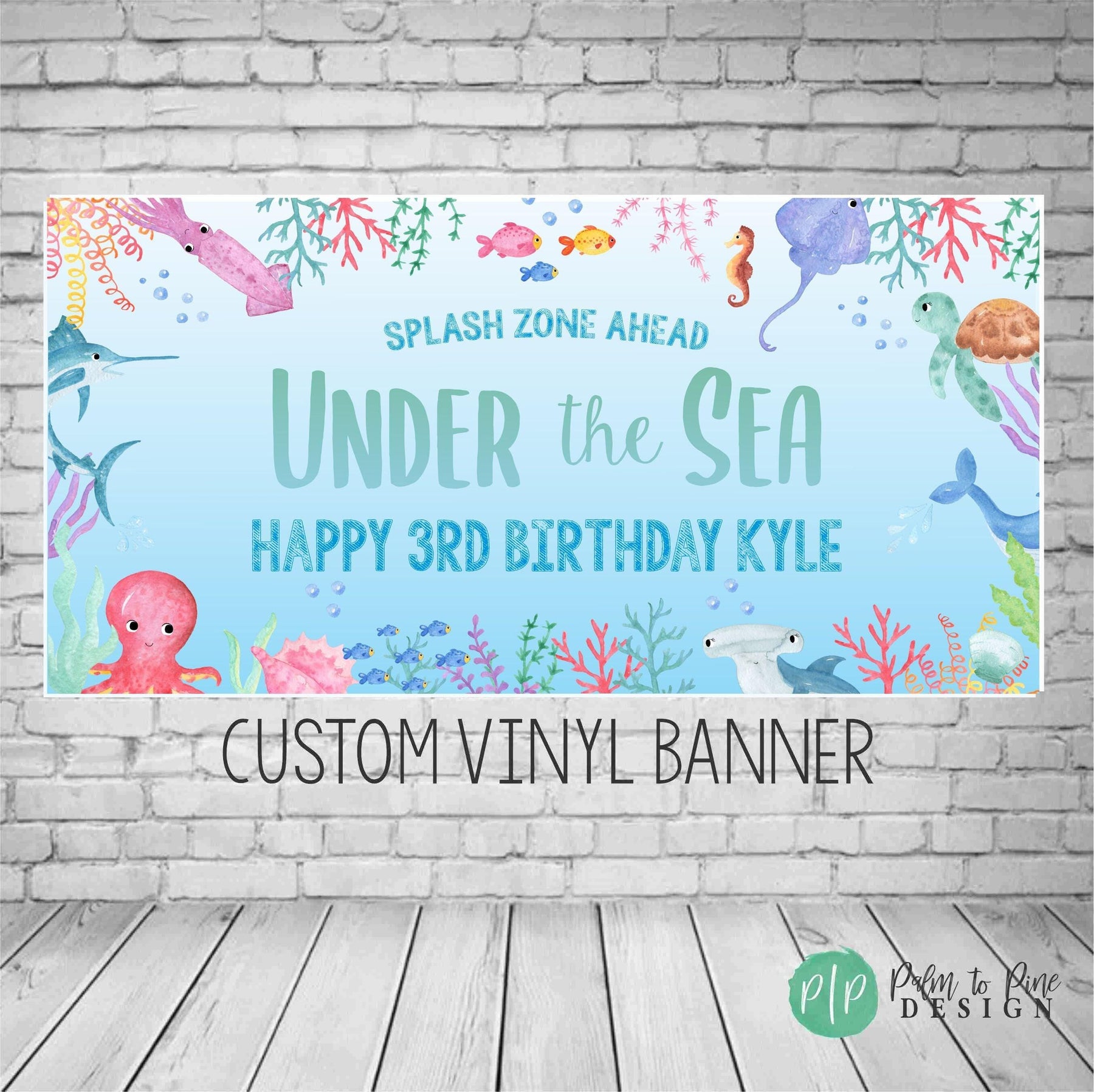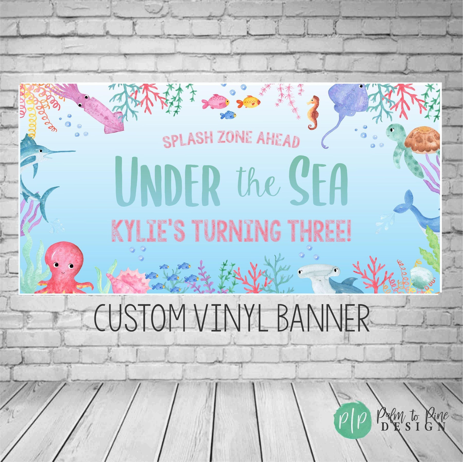 This Under the Sea birthday banner is the perfect decoration for your ocean themed or pool birthday party or even an Under the Sea Baby Shower decoration. The wording on this sea animal backdrop can be personalized for your son, daughter or twins birthday and the colors can be changed for your ocean party with wording like Oneder the sea, Dive into Five or 3 Under the Sea! This durable outdoor or indoor banner is perfect for a summer pool party and can be used in front of a dessert table, as a bounce house decoration, near a pool or as a welcome banner to greet guests at your kids birthday party.