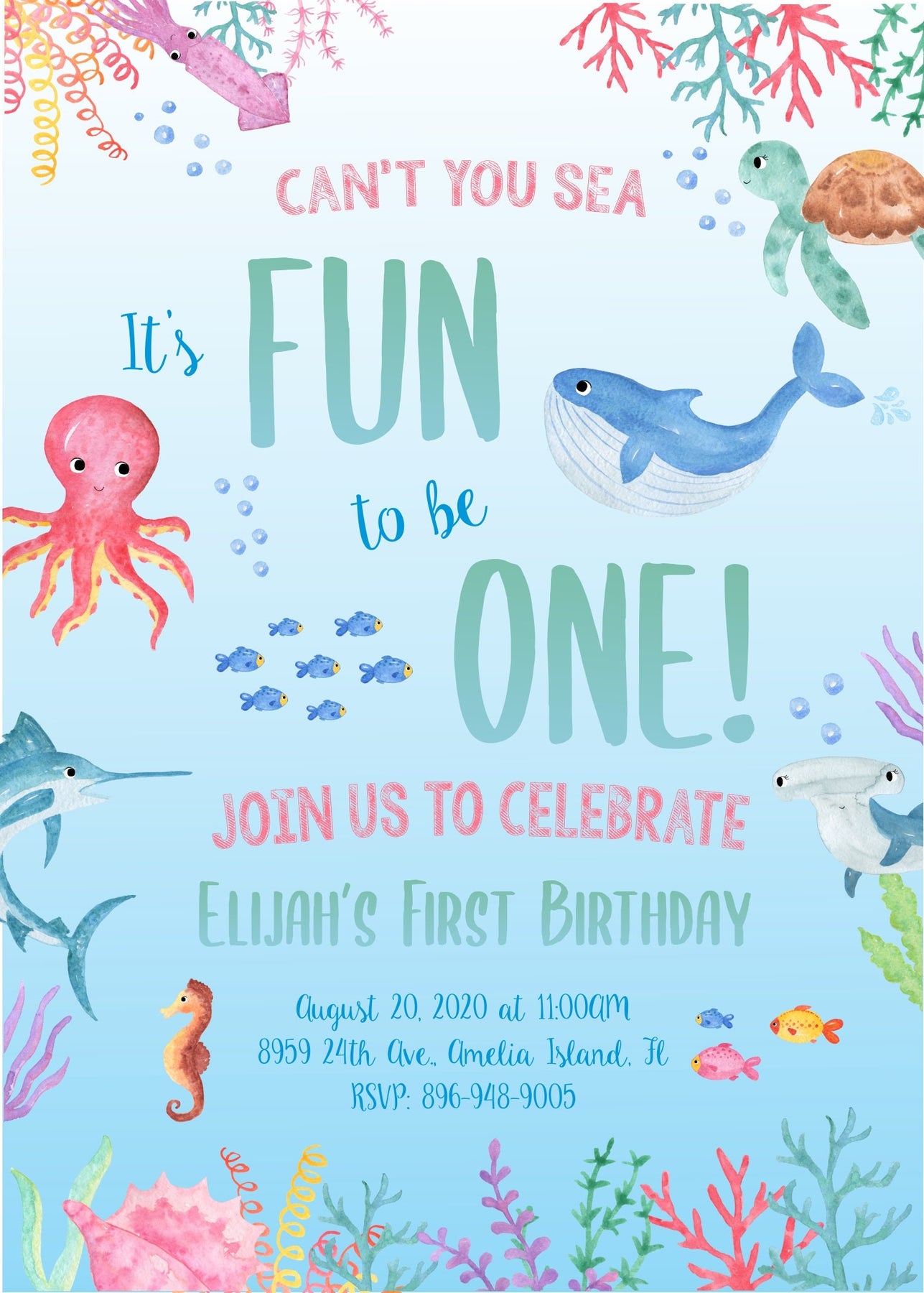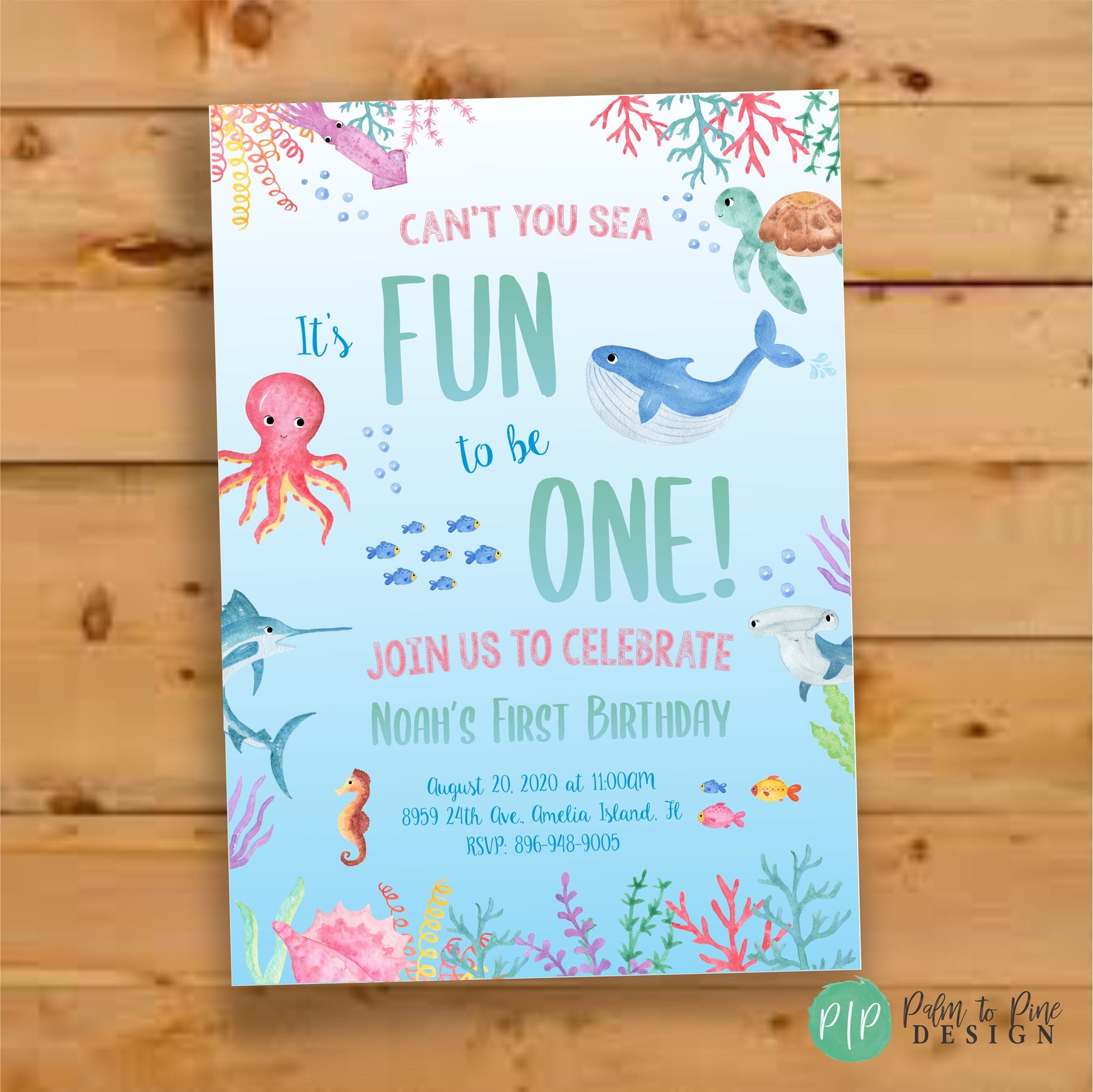 You are O-Fish-ally invited to have a whale of a time at this under the sea first birthday party! This printable or paper invite is perfect for your son or daughters first birthday party, and the wording can be changed for any age or twins birthday party! The fish clip art and under the sea animals make this card the perfect invitation for a beach birthday!