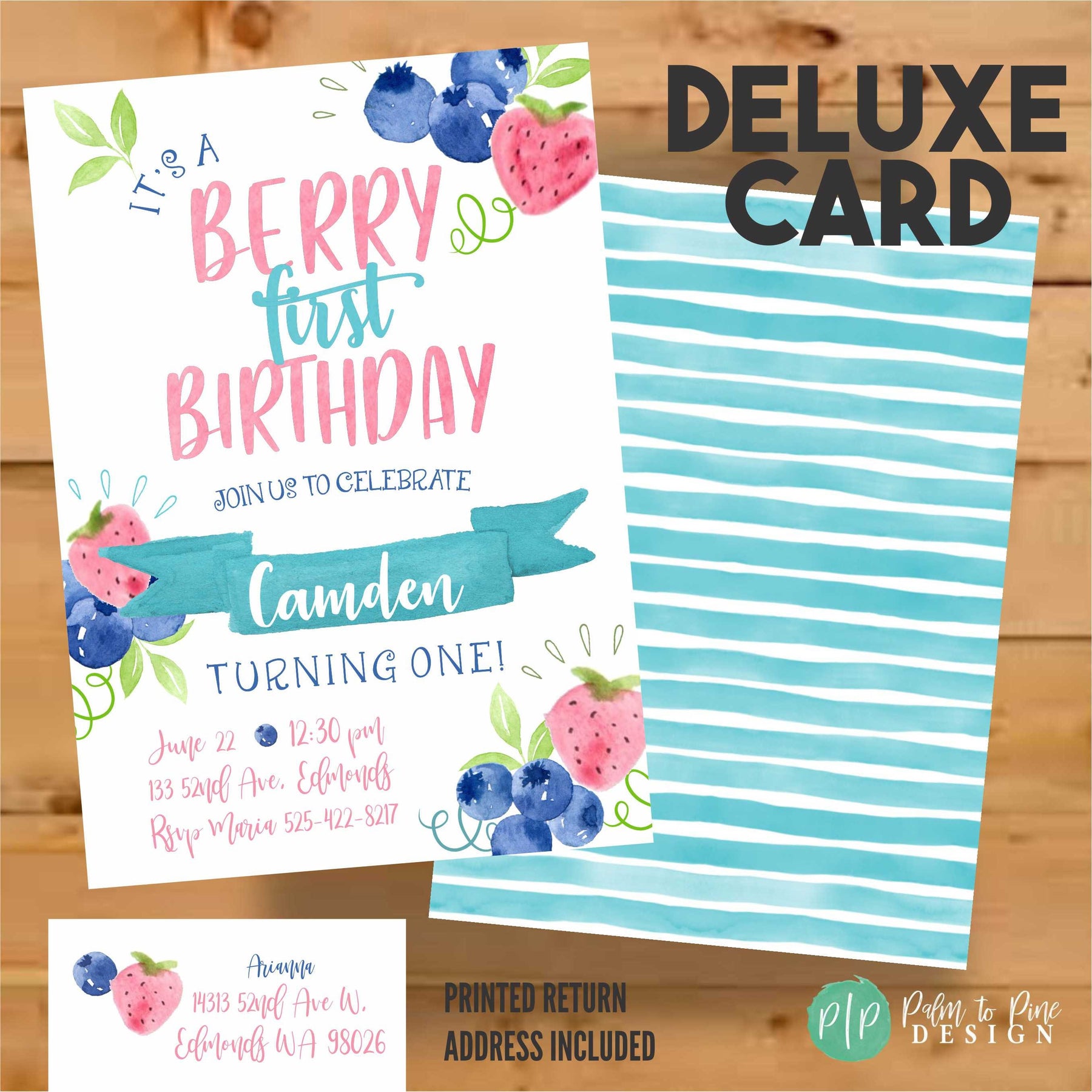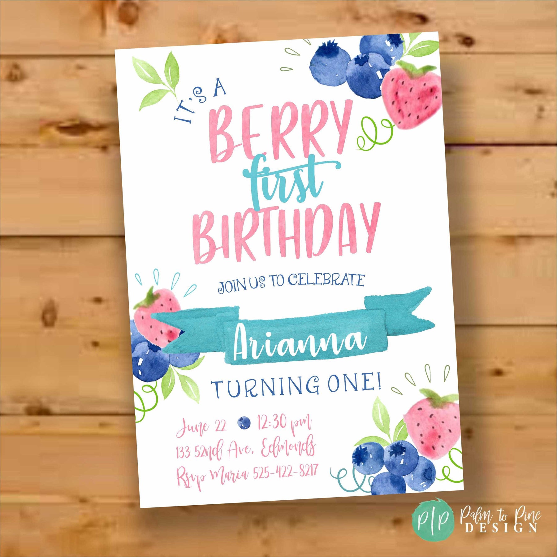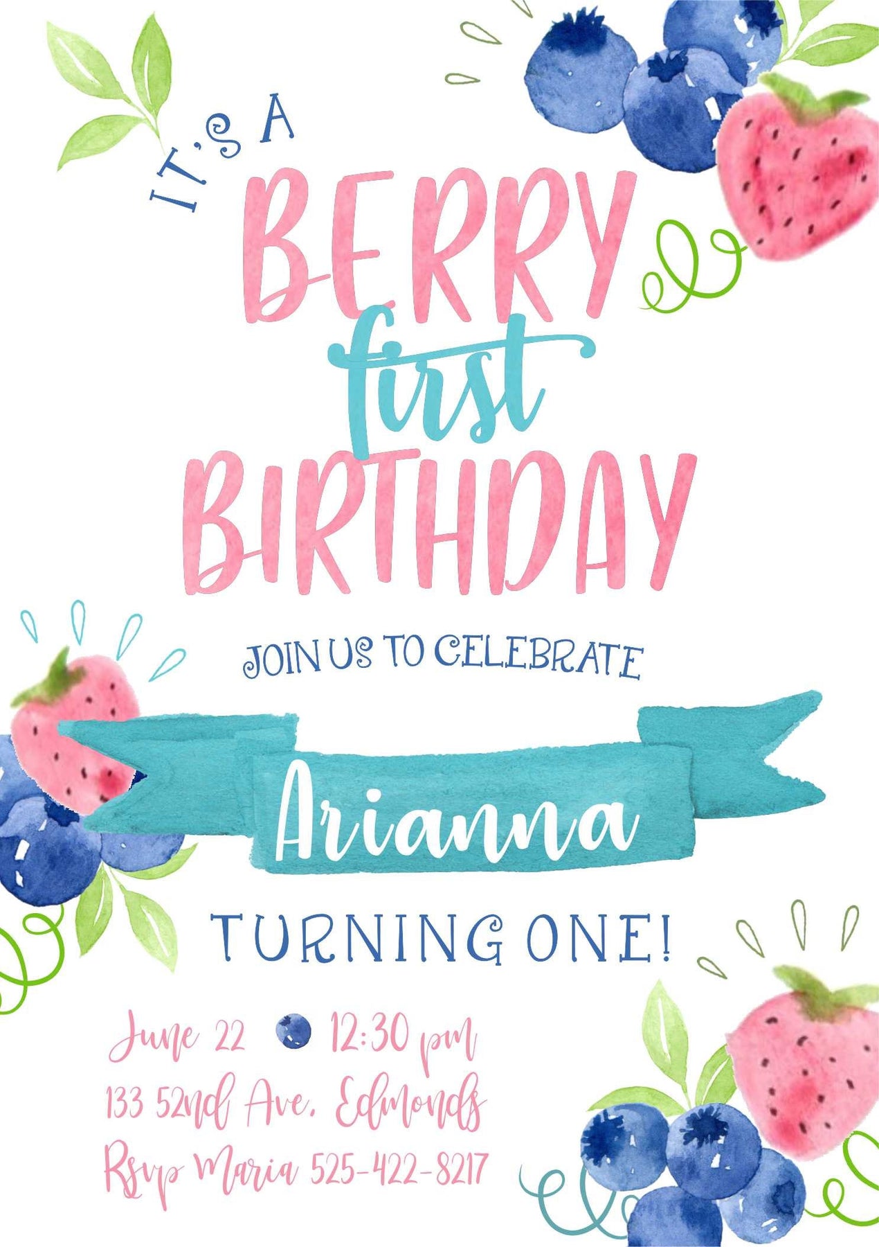 Watercolor Berry First Birthday Invitation, Strawberry, Blueberry (Digital or Printed)