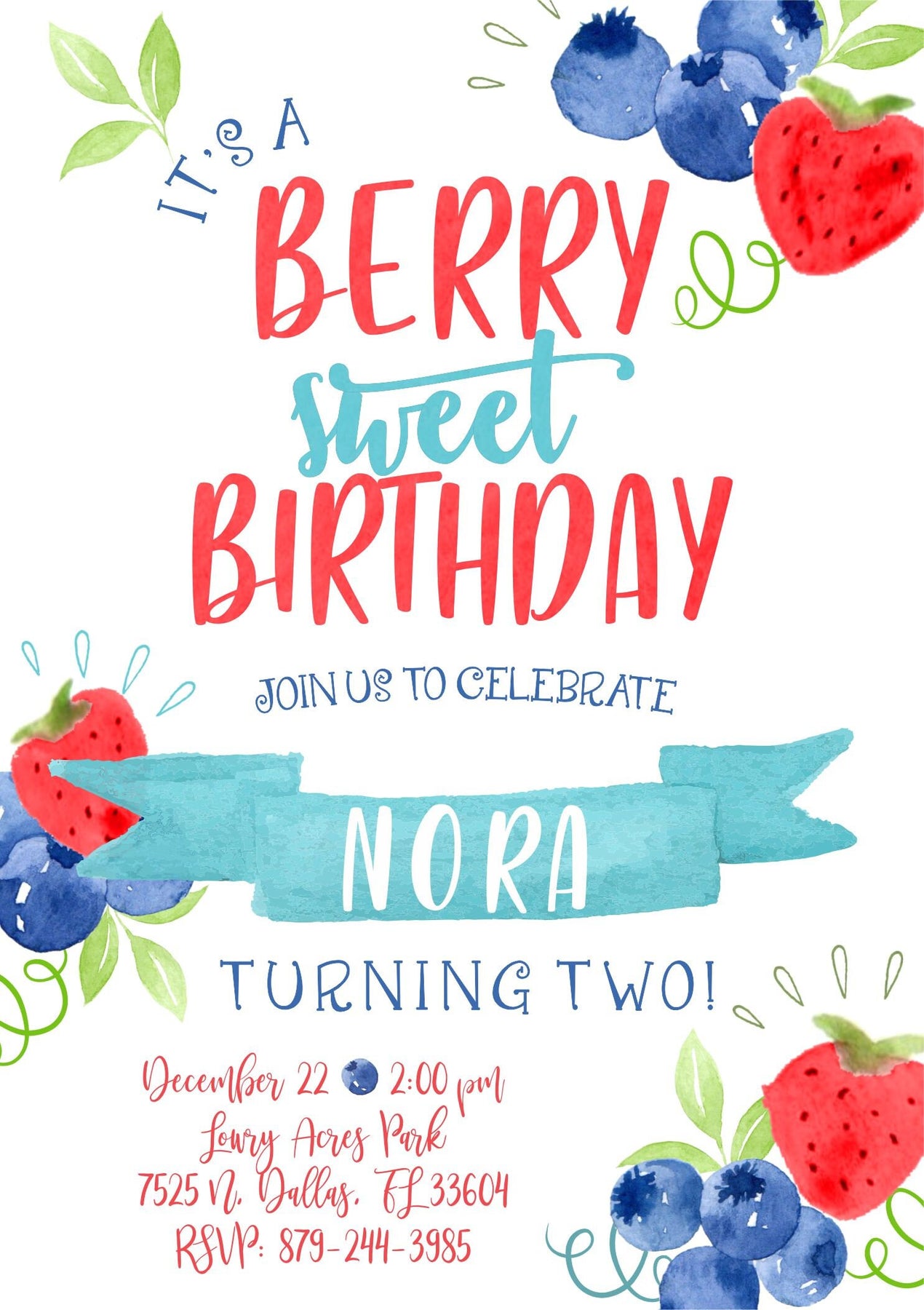 This watercolor berry birthday invite is perfect to celebrate your berry sweet girls birthday party! Perfect for a Berry First Birthday, Two Sweet, Two Tti Frutti or any age girls birthday! The watercolor strawberries and blueberries are perfect for a farmers market, picnic in the park or berry stand birthday theme.