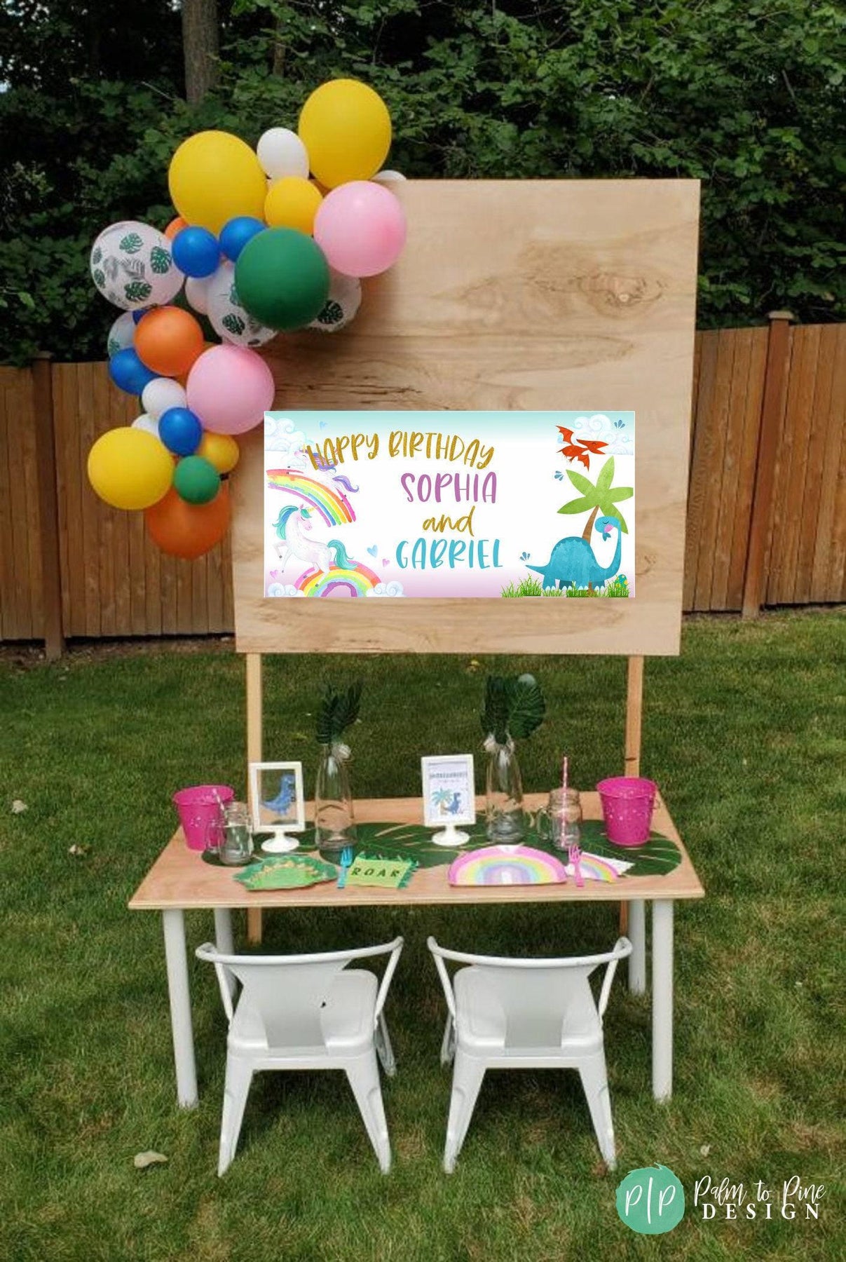 This unicorn dinosaur party banner is perfect for your siblings or twins boy girl birthday party! 🦄 🦕 Your little Unicorn lover and dino obsessed kids will love this joint birthday party theme, or perfect for one kiddo who loves both! The watercolor unicorn and rainbow background plus the dinosaurs and palm trees are the perfect decoration for your Unicorn & Dino birthday party. Use this durable vinyl banner for an outdoor welcome sign or drive by car parade at a Unicorn Dino birthday, as a photo backdrop for pictures or this vinyl banner makes the perfect decoration for behind a dessert table at a Unicorn and Dinosaur party. The dinosaurs, unicorns, rainbows and palm trees are perfect for any boy-girl birthday party and set the perfect tone for any boy-girl birthday party.