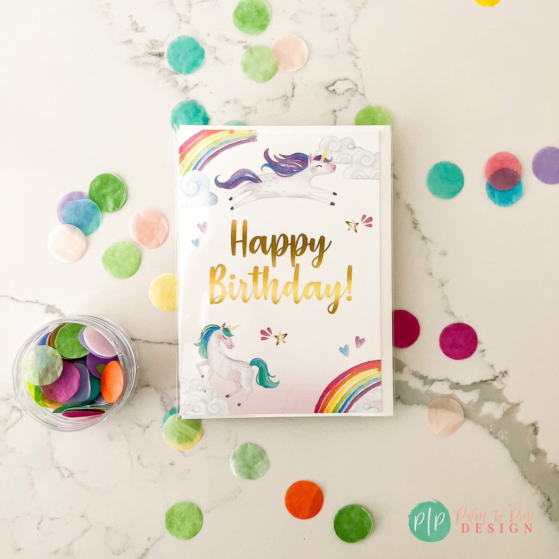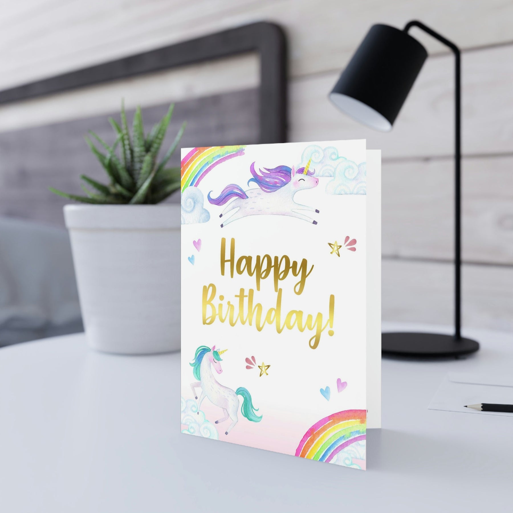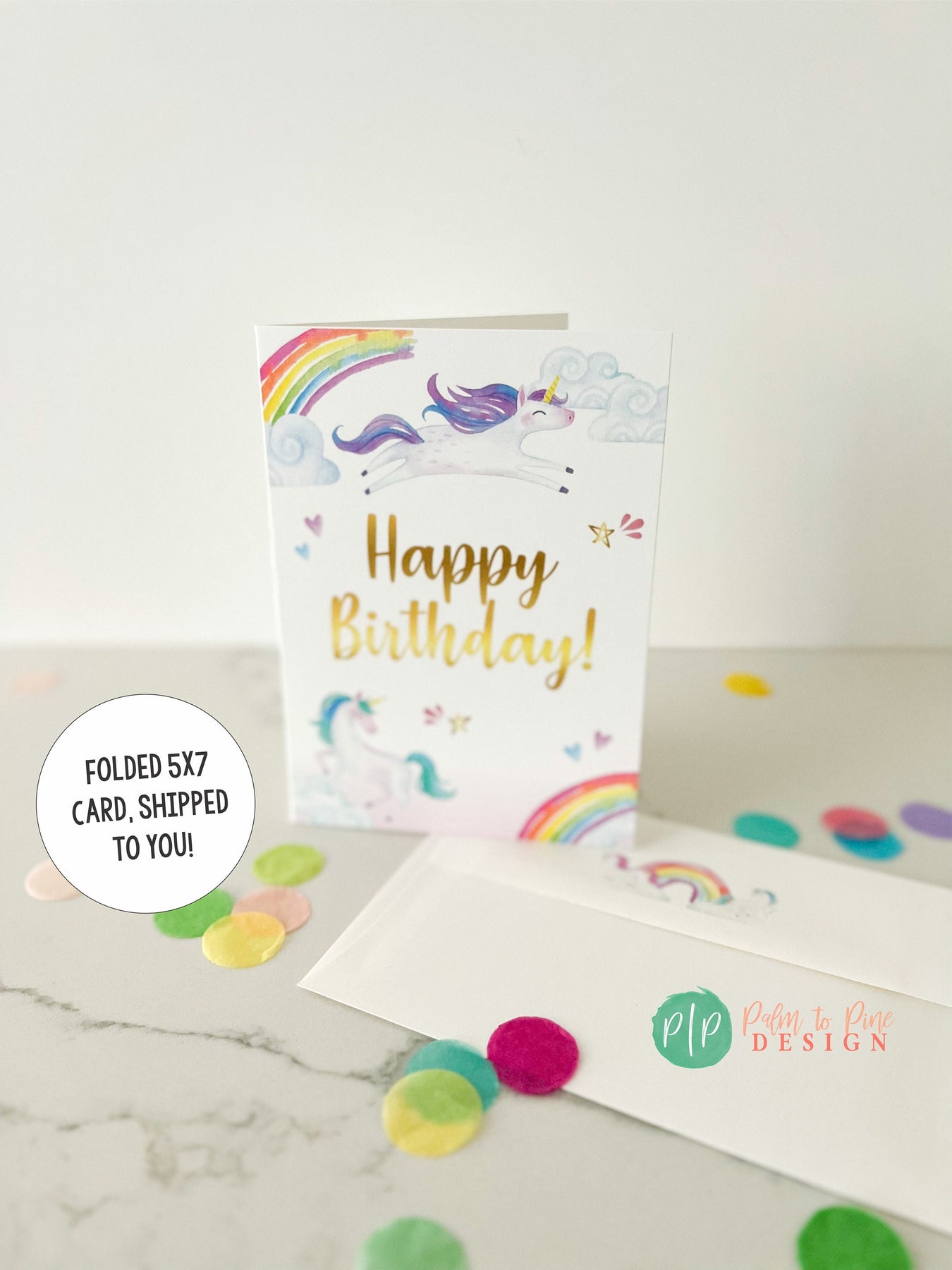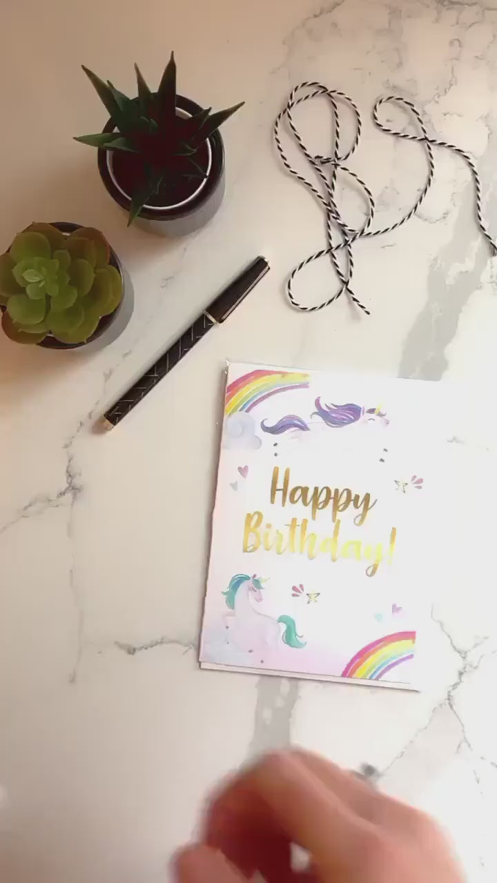 This adorable professionally printed 5x7" folded unicorn greeting card is the perfect way to say Happy Birthday to the unicorn loving girl in your life! This beautiful, high quality girls happy birthday greeting card is printed on ultra thick, 120 lb. cardstock and includes a matching custom printed envelope with watercolor unicorn and rainbow clipart. Your birthday girl will love this thoughtful and cute birthday card.