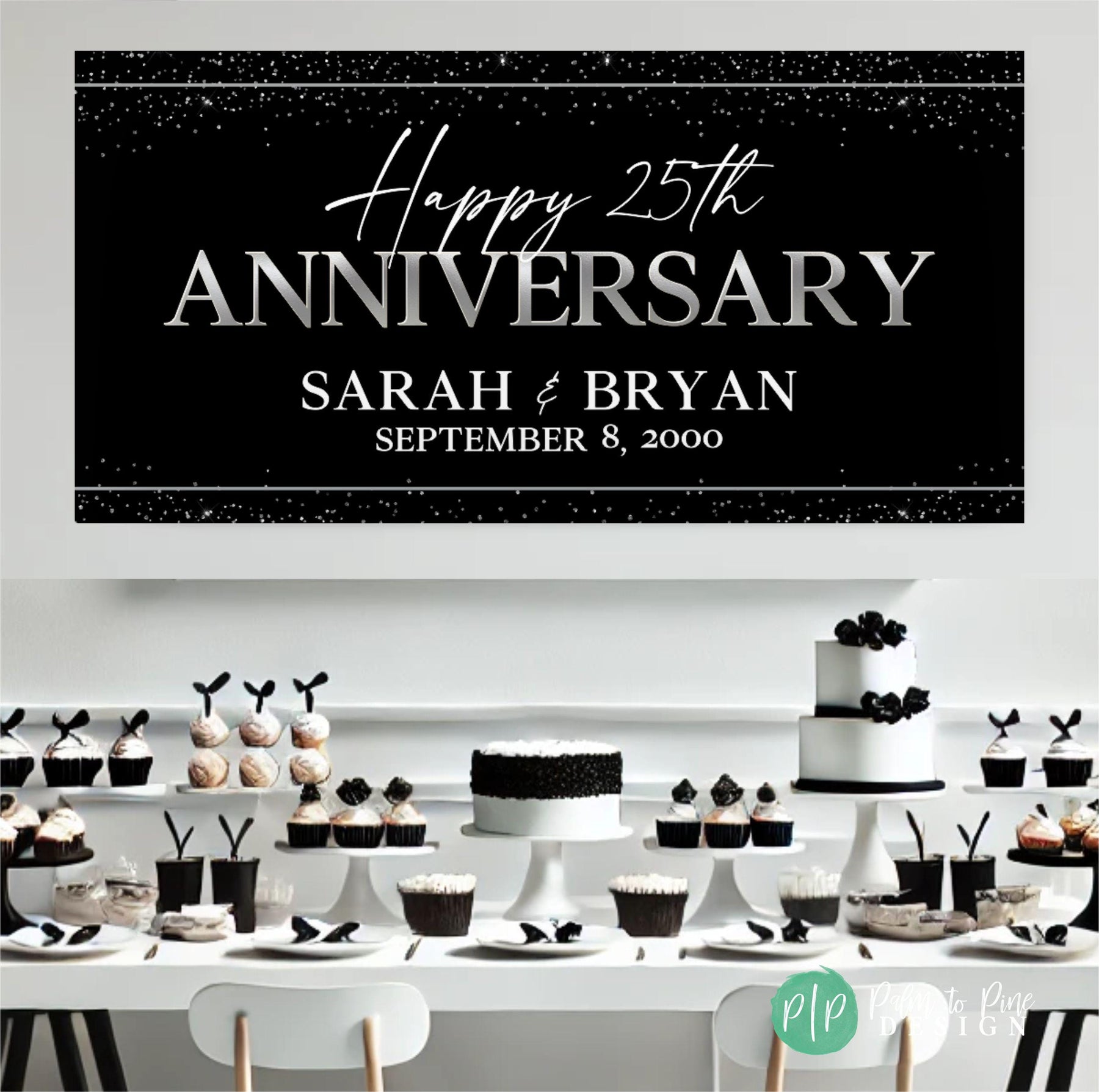 Celebrate an anniversary with an elegant 25th wedding vow renewal banner (or customize this personalized decor for any milestone anniversary!) Designed in a classic silver and black color palette, this banner with couple's names is perfect for honoring your parents, grandparents, or your own silver jubilee party. Hang it behind the dessert table, gift table, or as a stunning photo backdrop to set the scene for an unforgettable celebration.