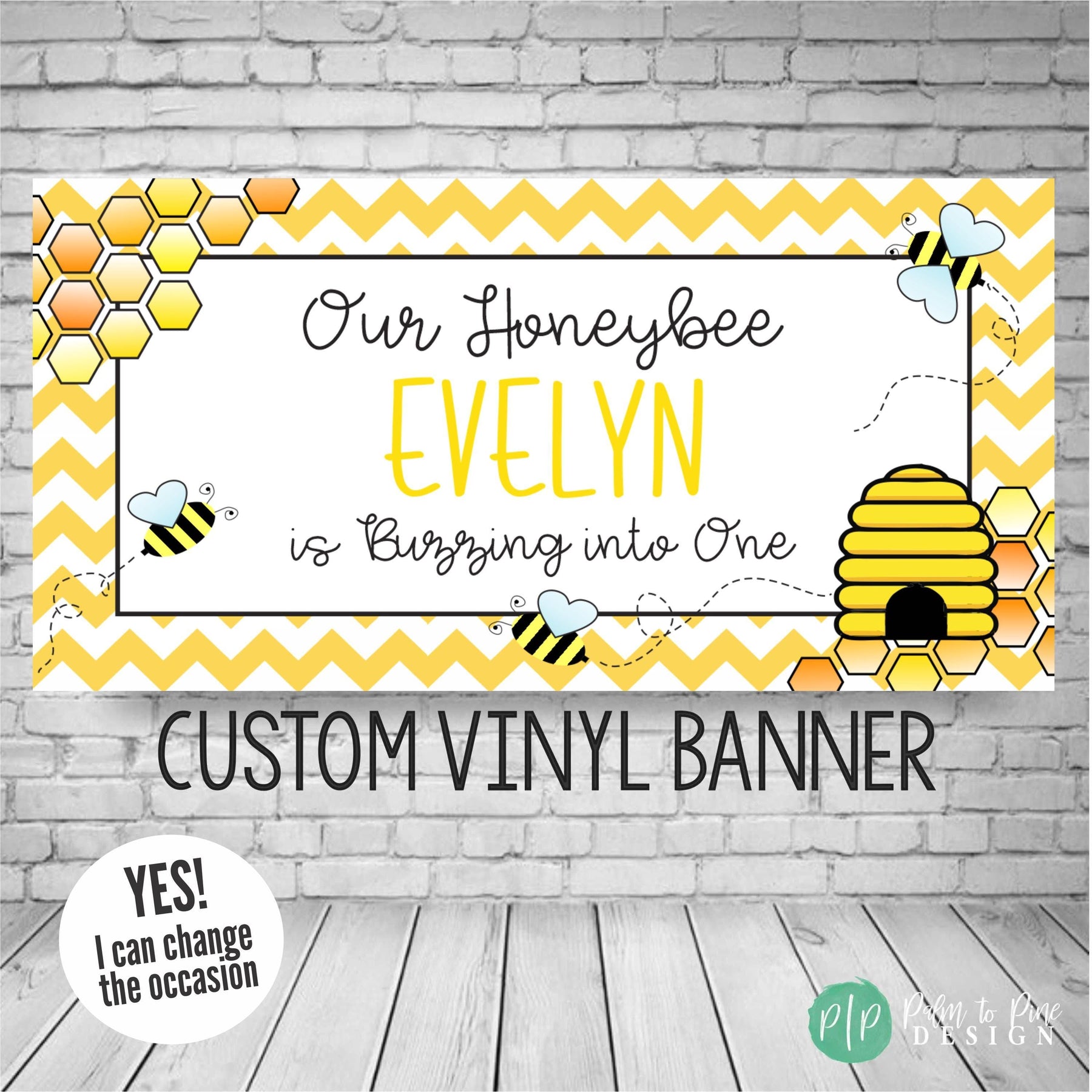 This personalized vinyl photo backdrop banner comes ready to hang, or available as a digital option to print locally and looks darling behind a dessert table, hanging in your front yard or at a park, entryway or at a honey bee party!