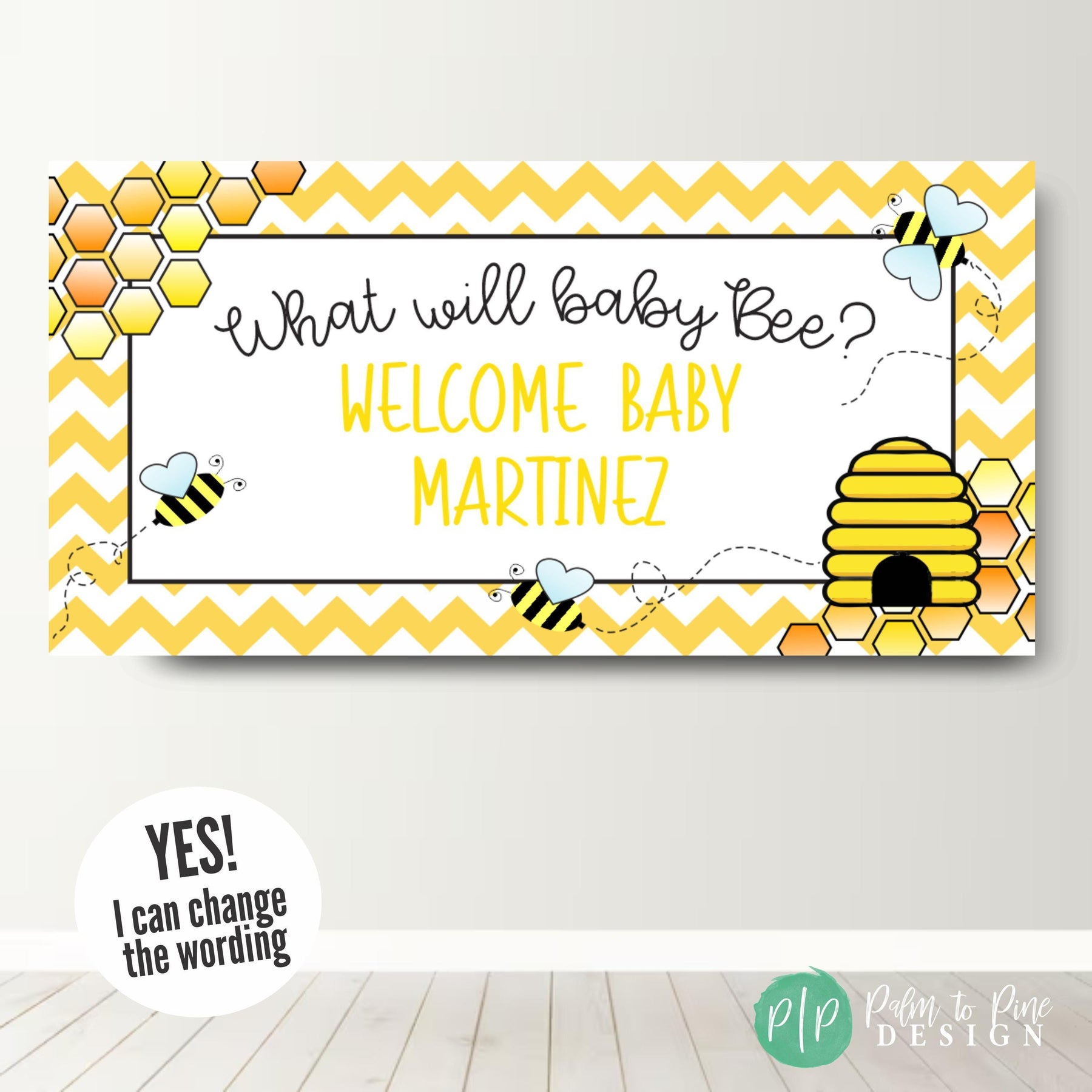 Celebrate your girls birthday, mama to bee baby shower or what will it bee gender reveal with a cute and vibrant bumblebee-themed personalized banner! Perfect for birthdays, baby showers, or gender reveal parties, this banner adds a sweet and whimsical touch to your celebration. Featuring honeycomb, buzzing bees and yellow and black writing with customizable text, it's sure to create a buzz among your guests! 🐝