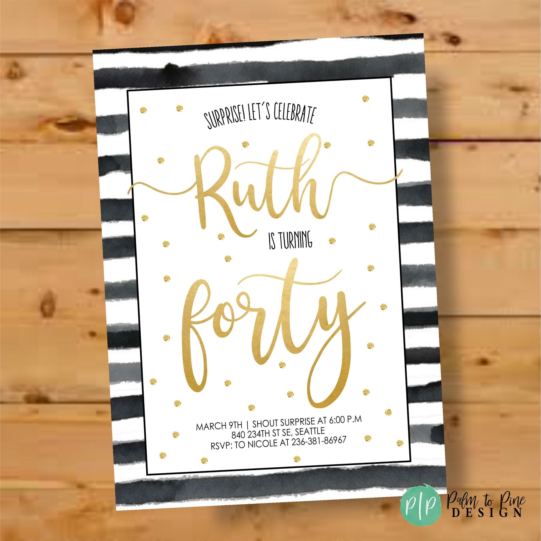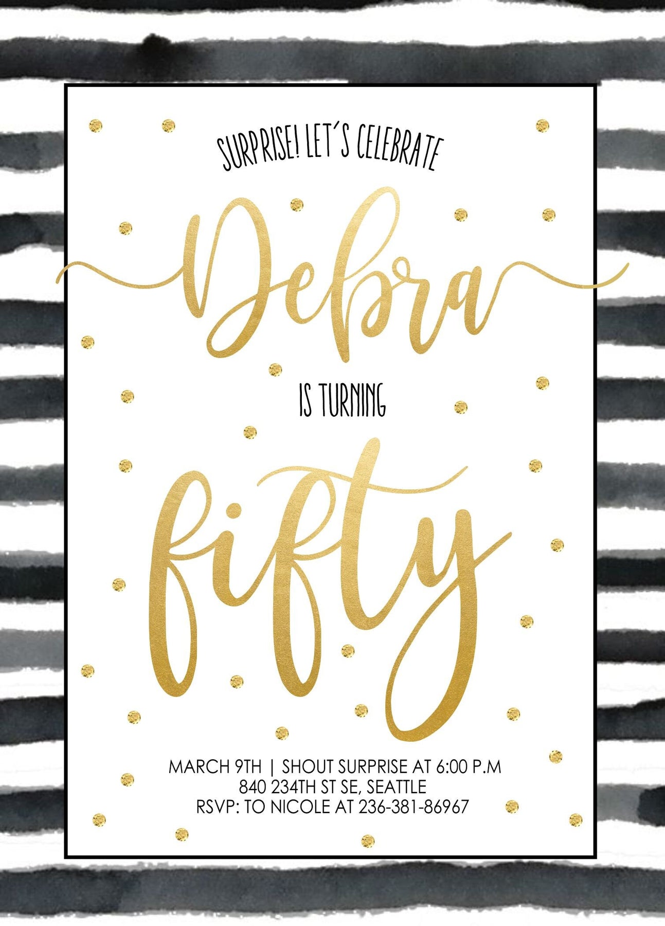 This black and white watercolor stripe with faux gold polka dots is the perfect modern, classic and fun birthday invitation for an adult birthday. This black and gold birthday invite is perfect for any age party, Sweet 16, 21, 30, 40, 50 and beyond! The wording on this black and white striped invitation can be changed for any type of party too, a surprise birthday, cocktail party, dinner out or more.