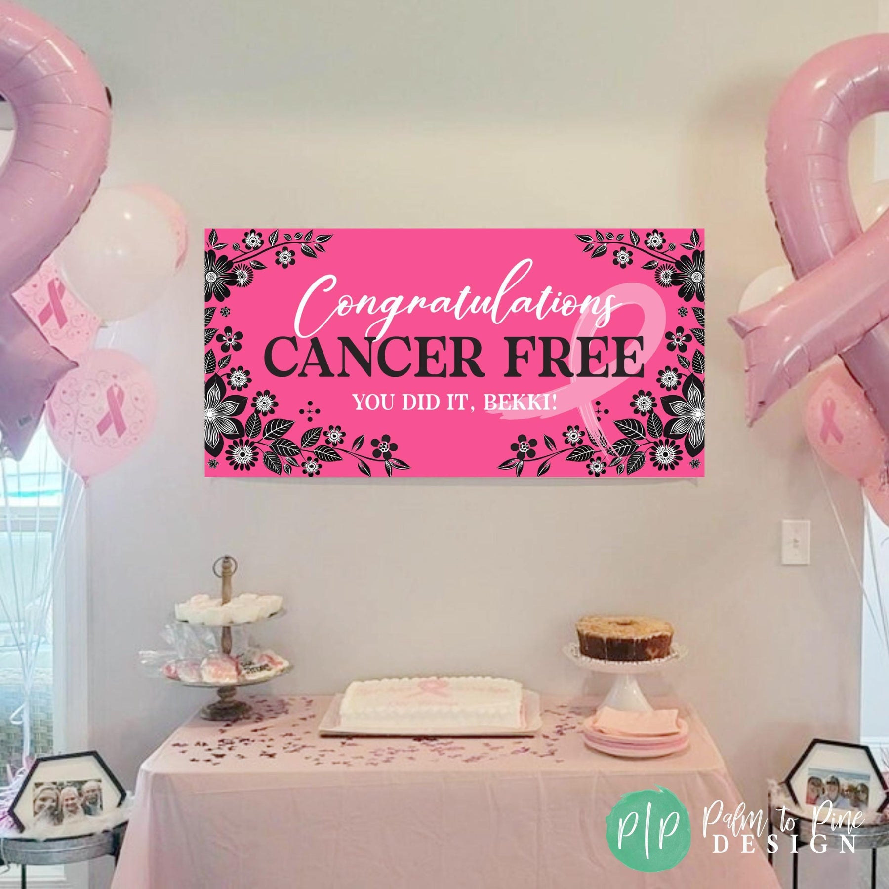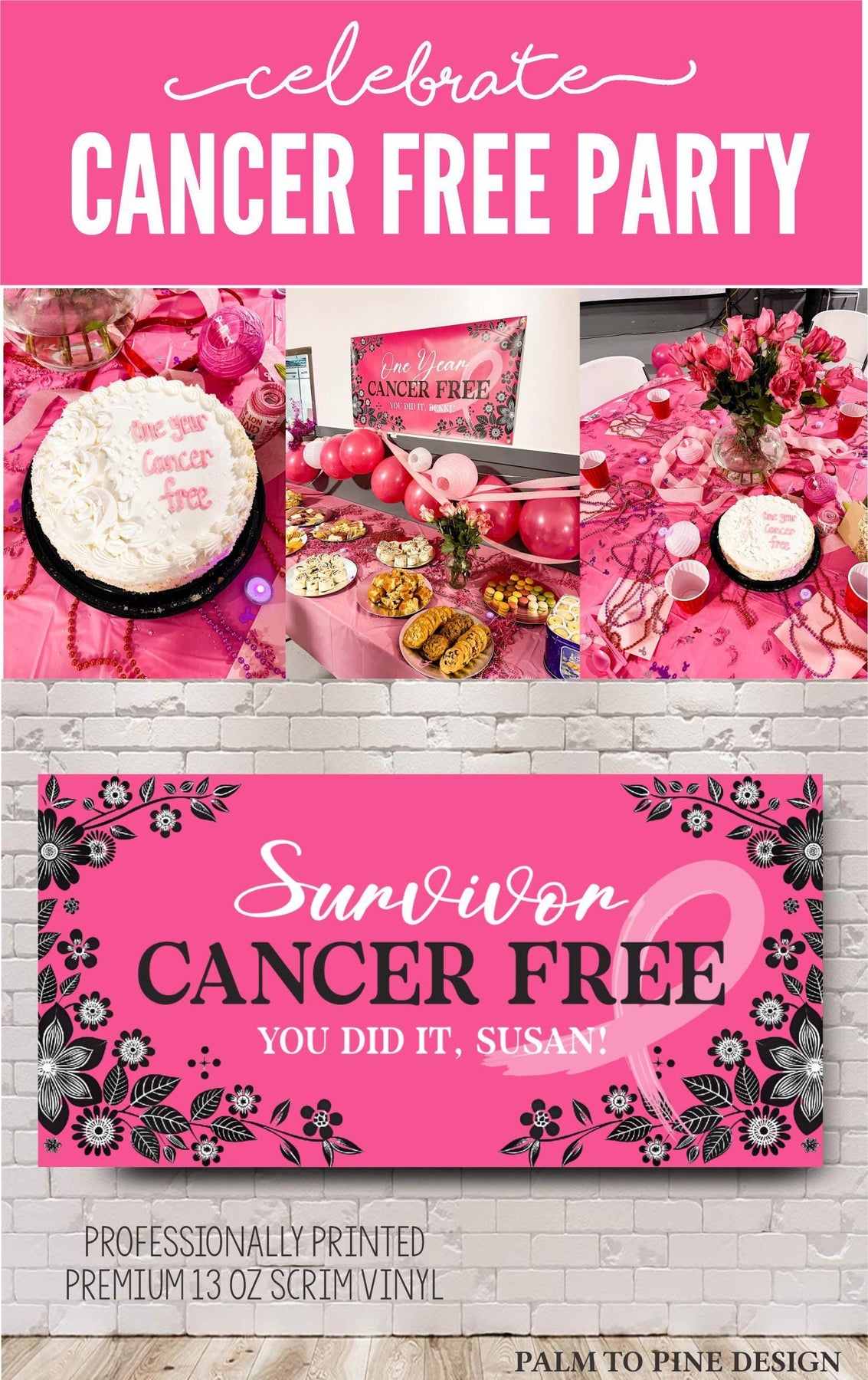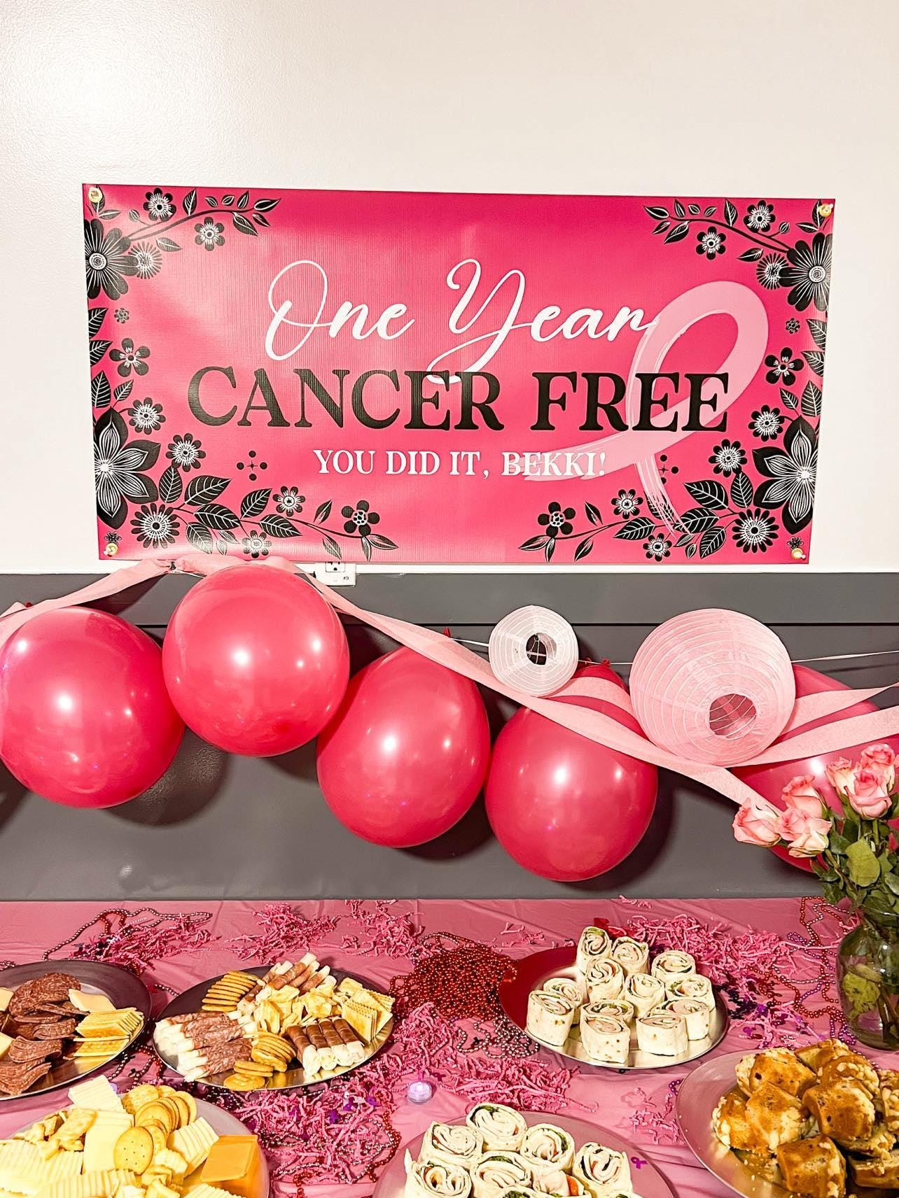 Celebrate the incredible milestone of being breast cancer free with our personalized party banner! This custom Cancer survivor party decor features a beautiful pink ribbon design, perfect for honoring strength, courage, and resilience. This cancer survivor banner can also be made in any color to honor the specific type of cancer. Whether you're hosting a small gathering or a larger celebration, this banner adds a meaningful and festive touch to your special day. This supportive banner for cancer warriors is can be customized with any wording of encouragement for any stage of a cancer battle while facing chemo, radiation or any stage of a cancer journey.