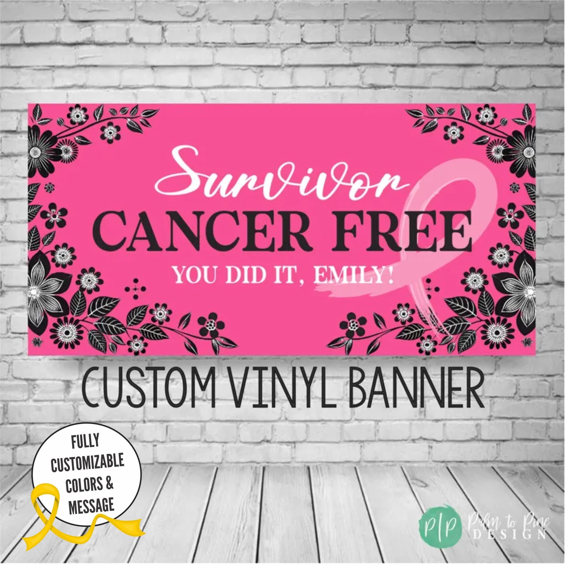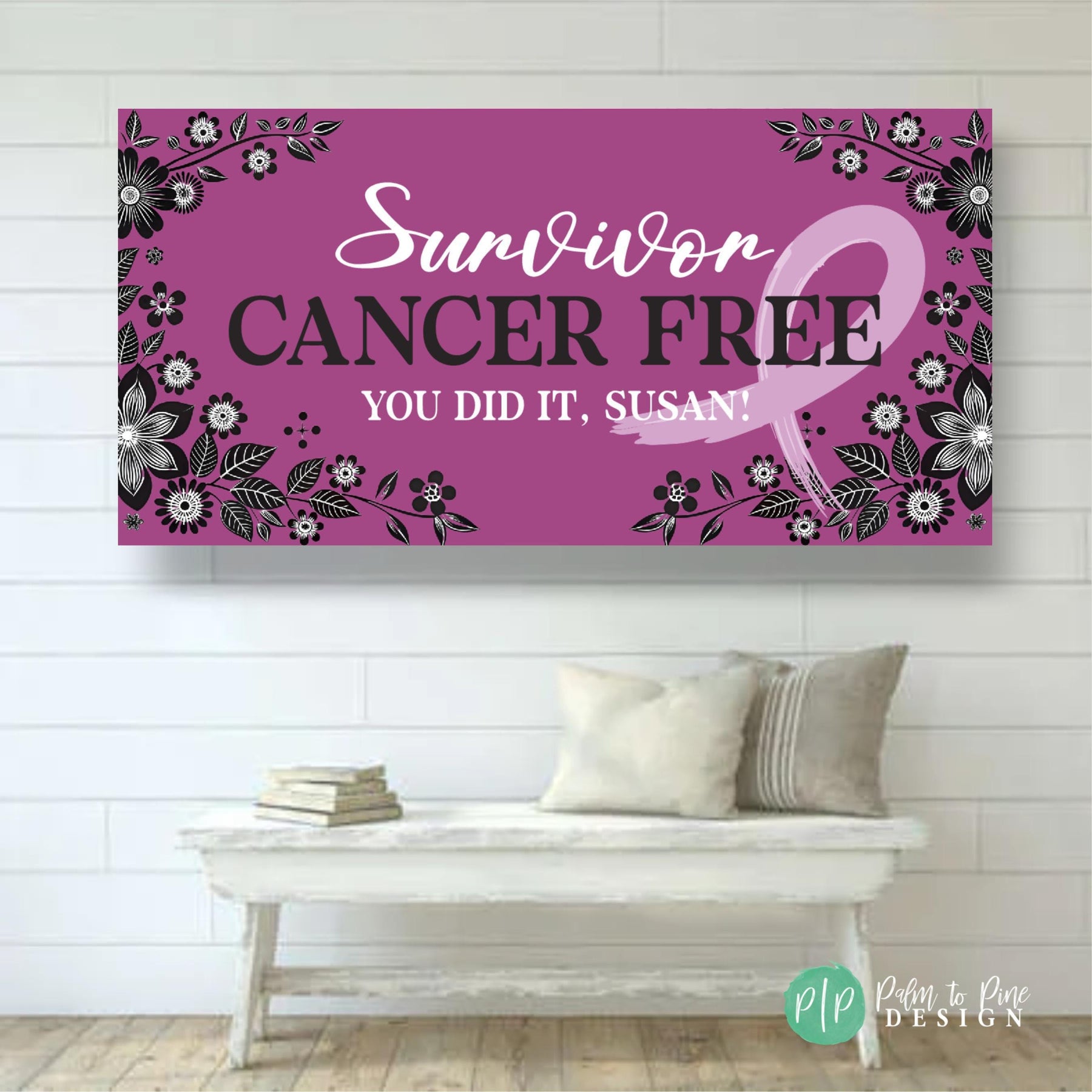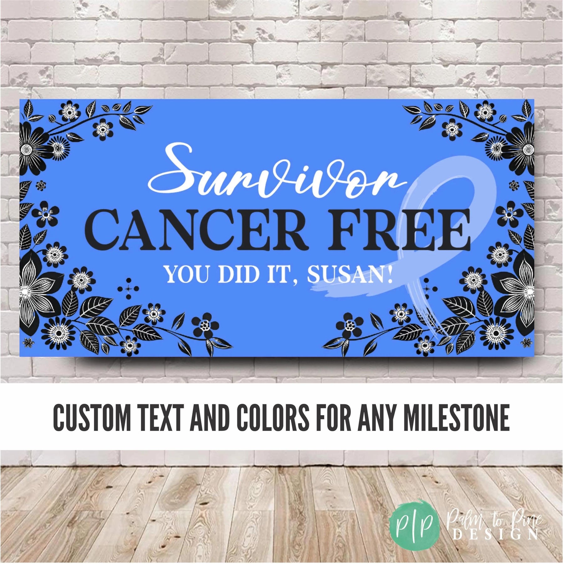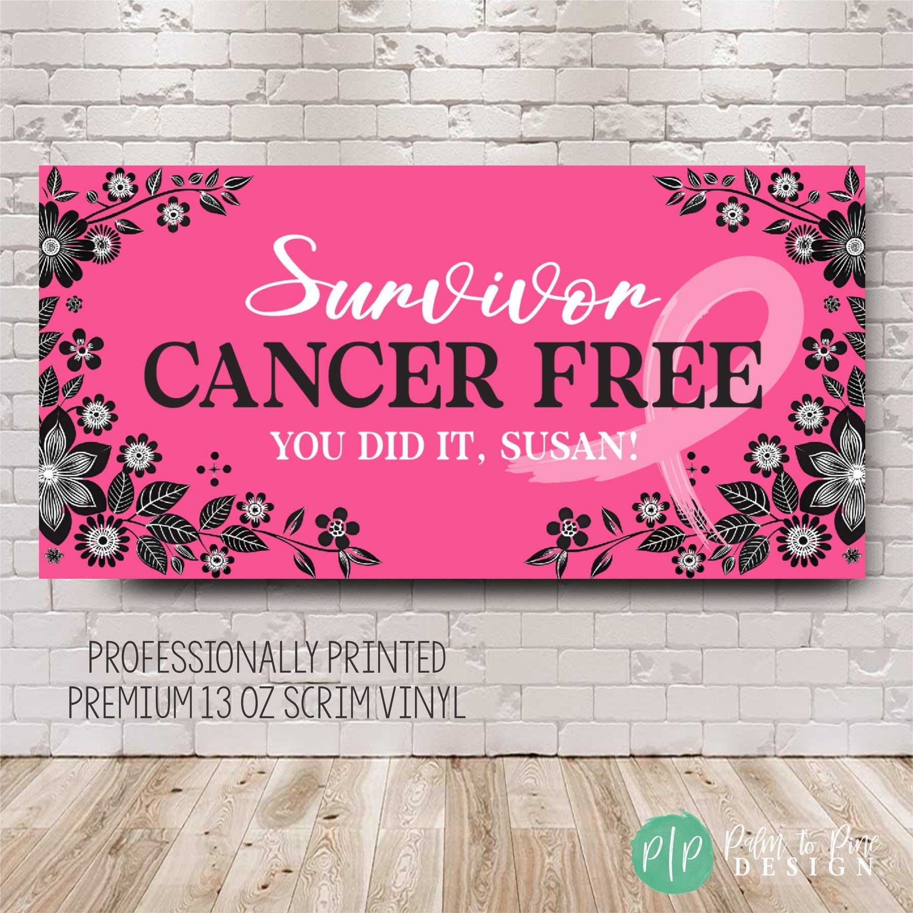 Celebrate the incredible milestone of being breast cancer free with our personalized party banner! This custom Cancer survivor party decor features a beautiful pink ribbon design, perfect for honoring strength, courage, and resilience. This cancer survivor banner can also be made in any color to honor the specific type of cancer. Whether you're hosting a small gathering or a larger celebration, this banner adds a meaningful and festive touch to your special day. This supportive banner for cancer warriors is can be customized with any wording of encouragement for any stage of a cancer battle while facing chemo, radiation or any stage of a cancer journey.