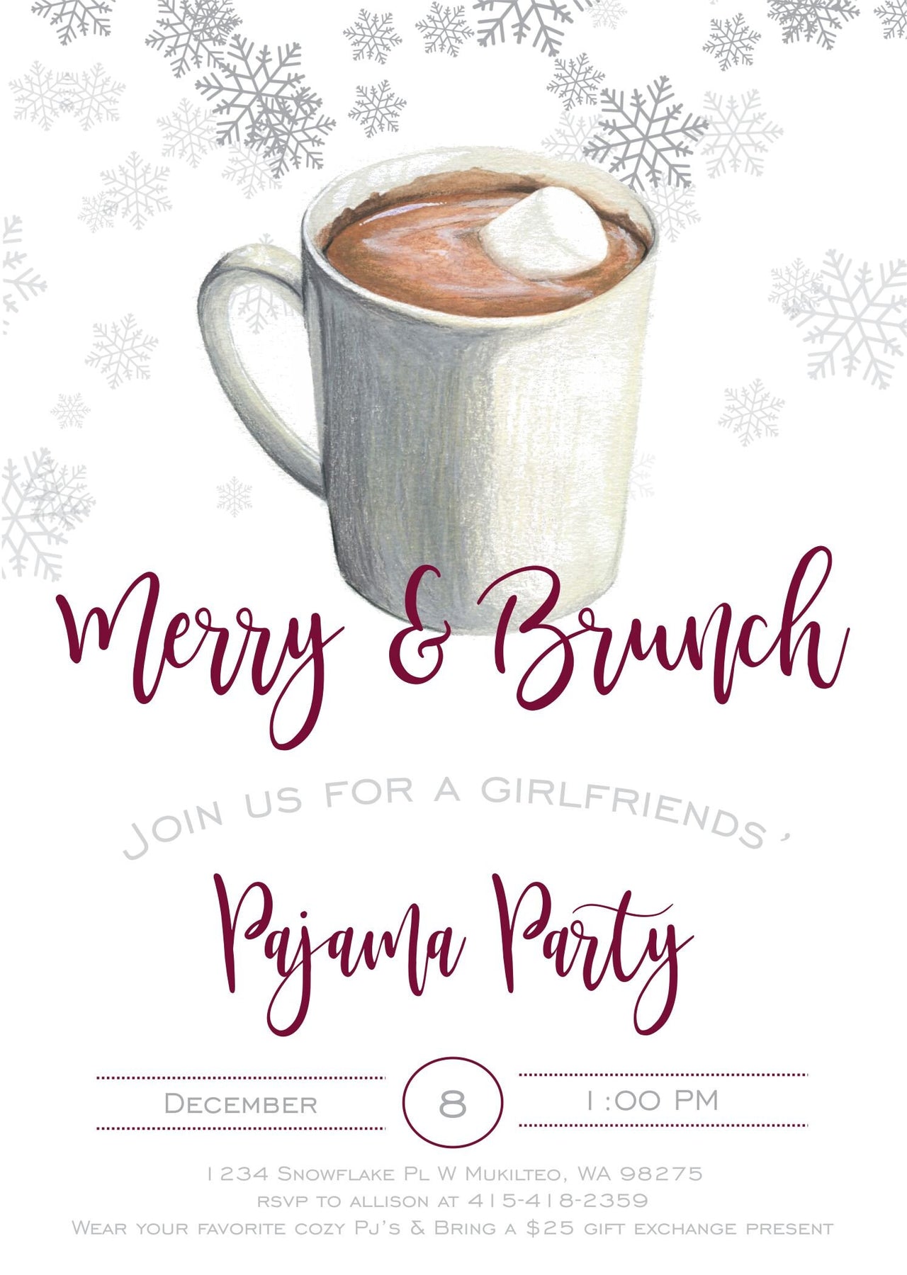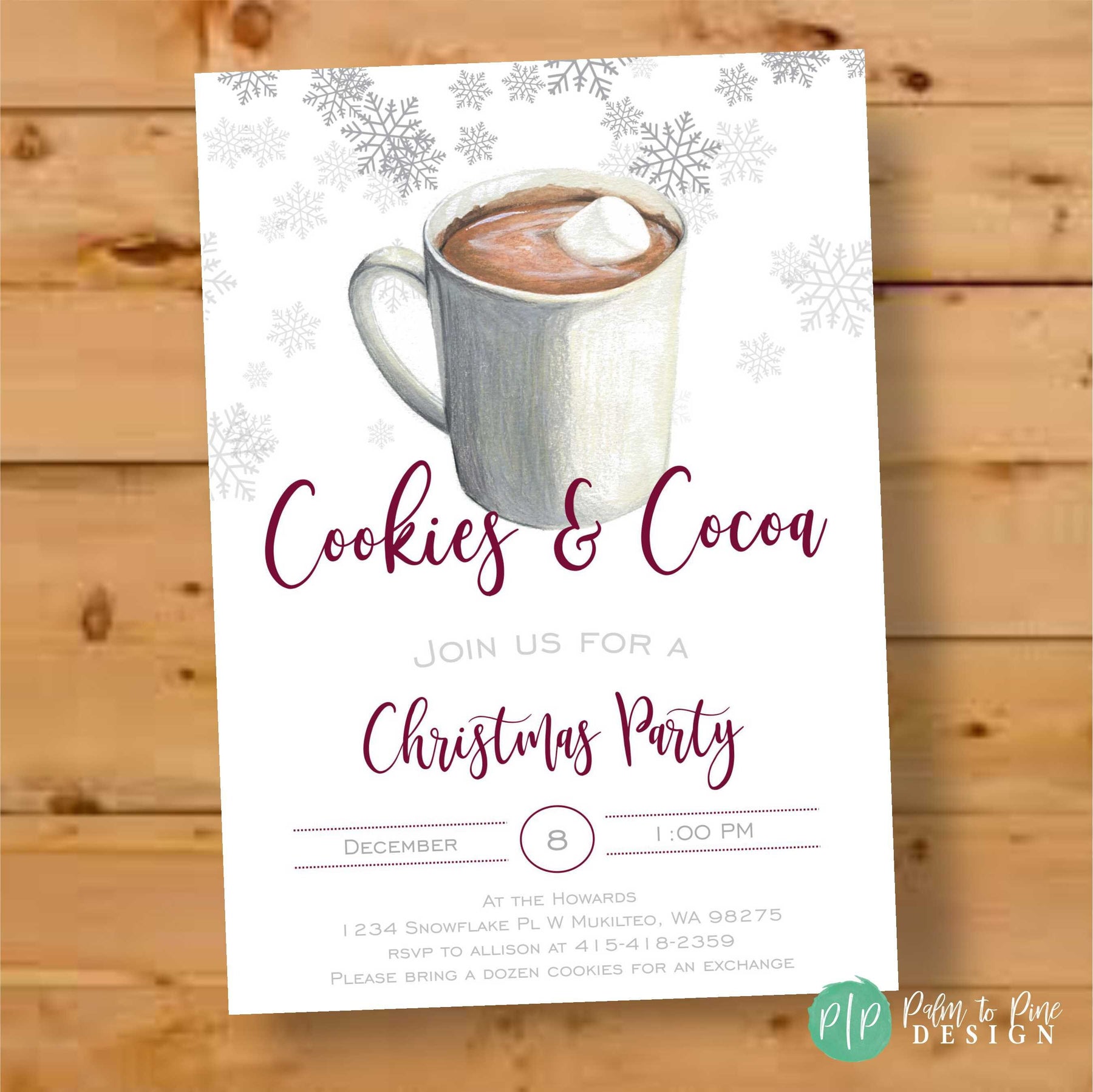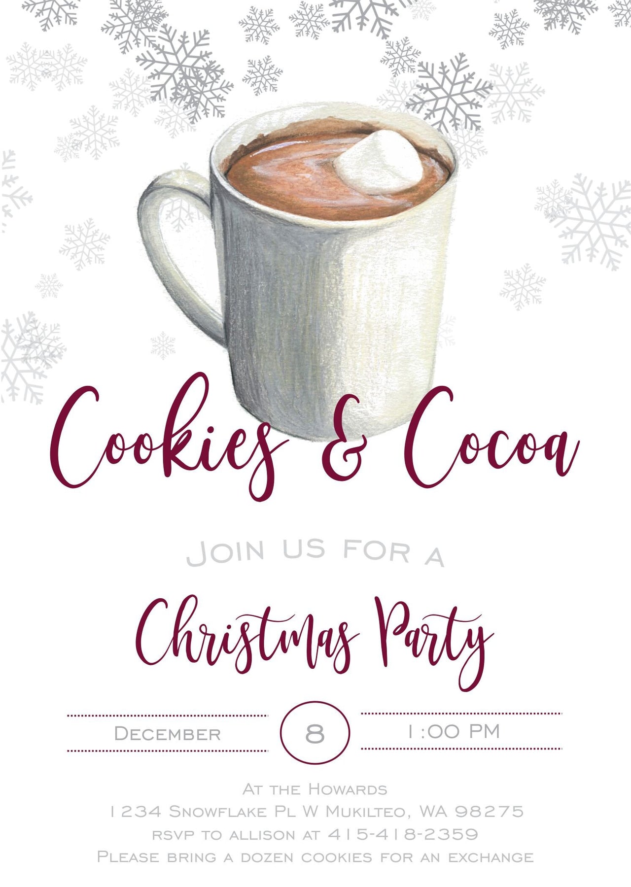 (If you would like a title other than cookies & cocoa, a "Hosted By" line, request to bring cookies, gifts or any other wording just leave your request in with the party notes)