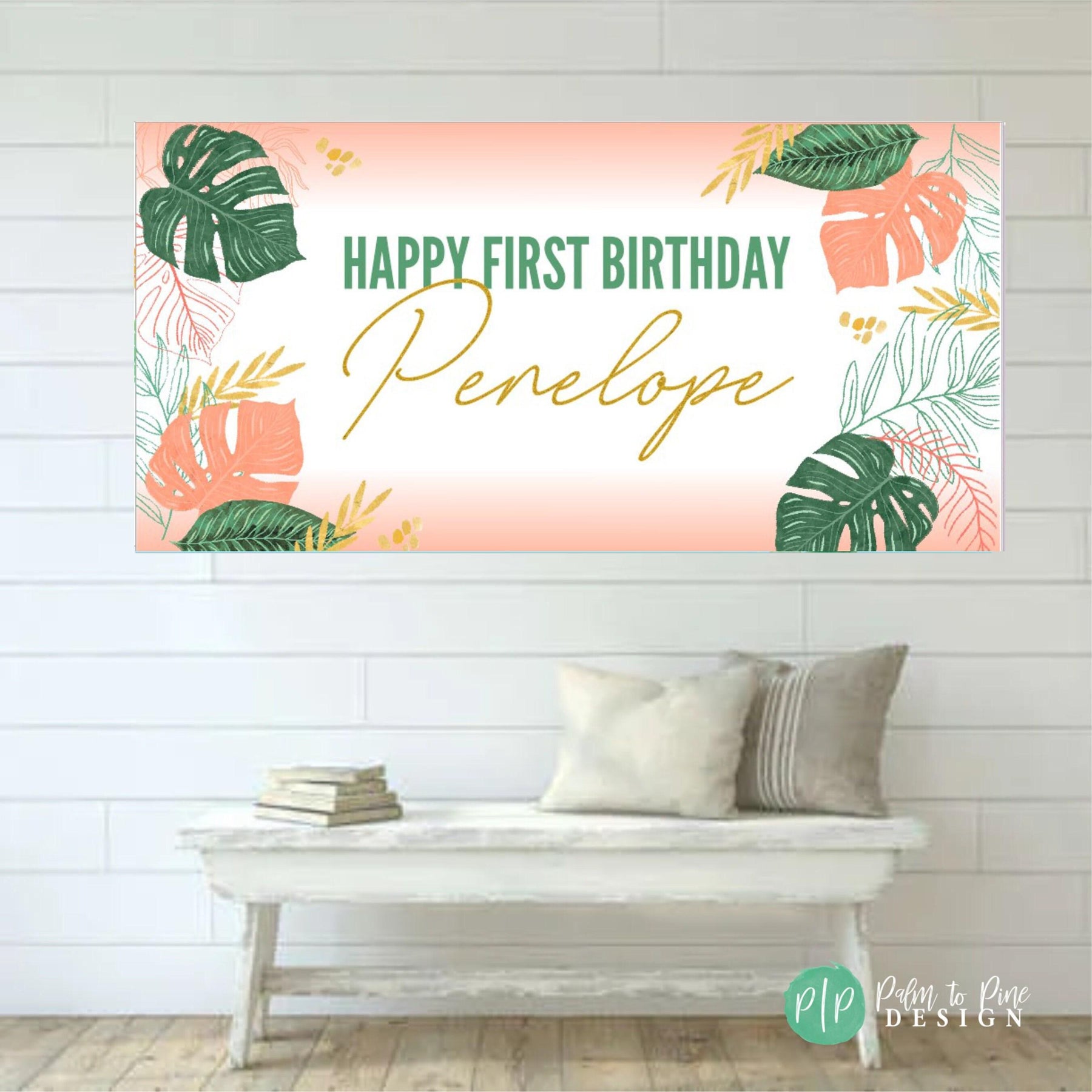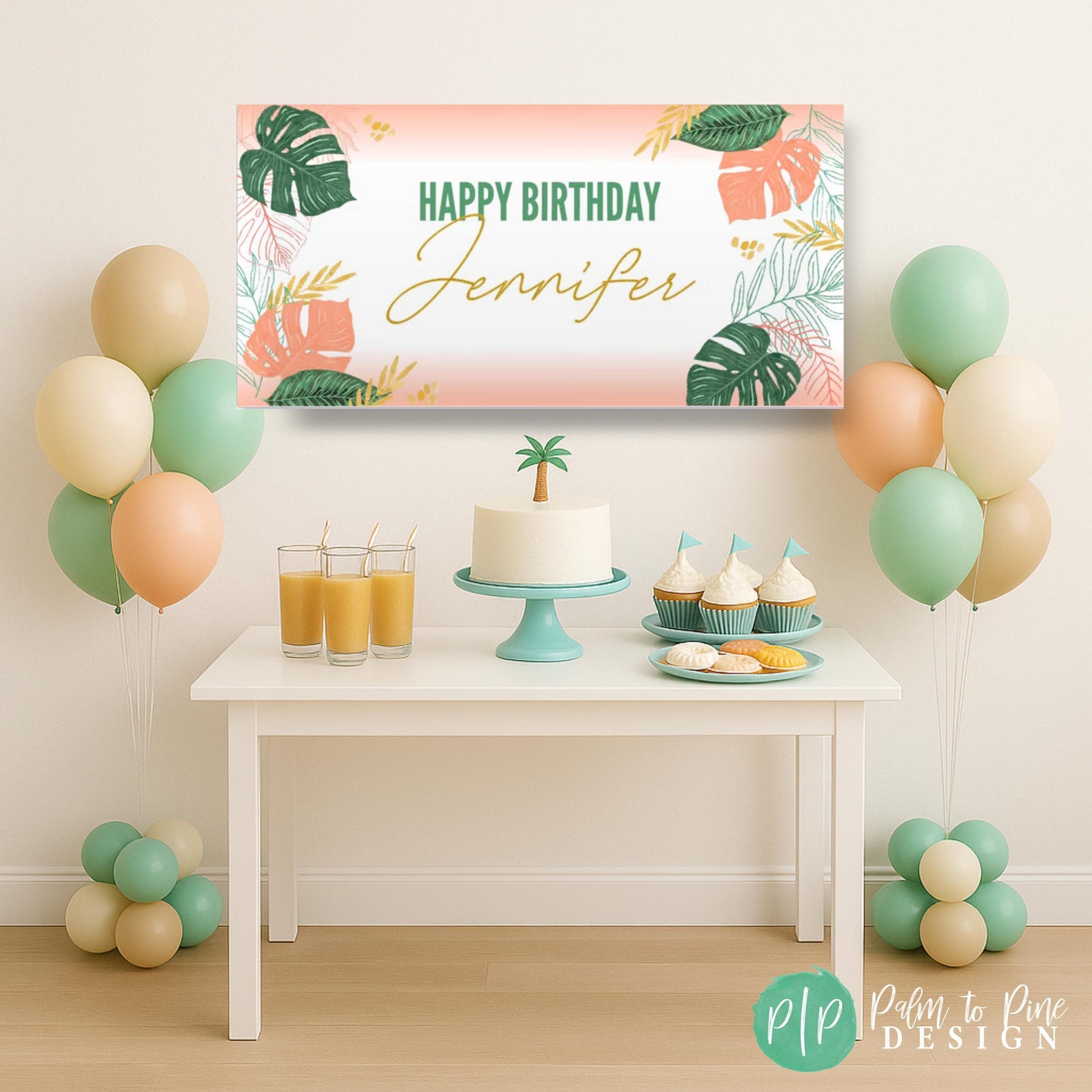 This Palm birthday banner is perfect for your summer tropical birthday party. The feminine pink with the green palms is the perfect decoration for your tropical birthday party. Use this durable vinyl banner for a outdoor welcome sign at a Luau party, as a photo backdrop for pictures or this vinyl banner makes the perfect decoration for behind a dessert table! The colors won't fade in the sun.