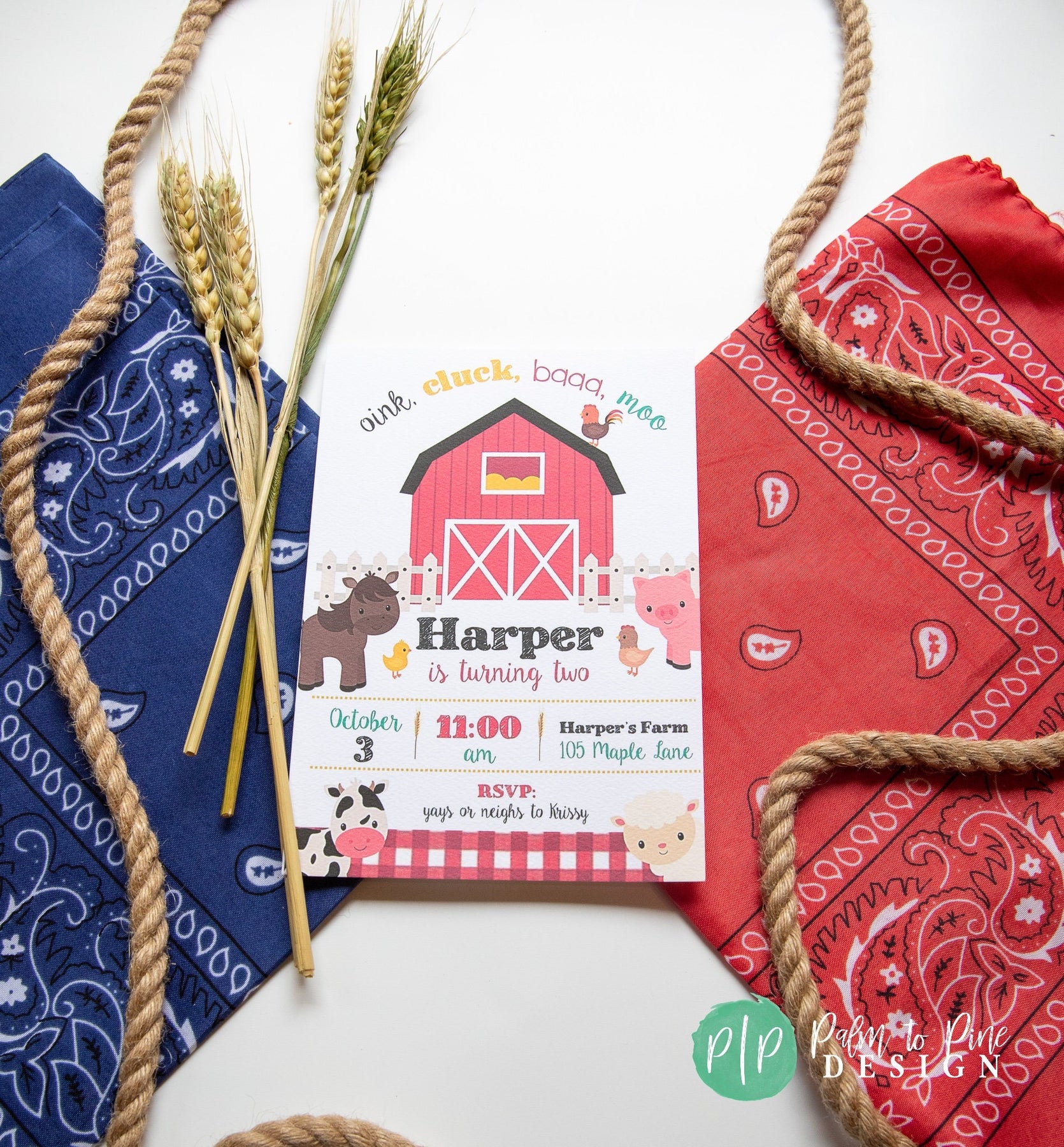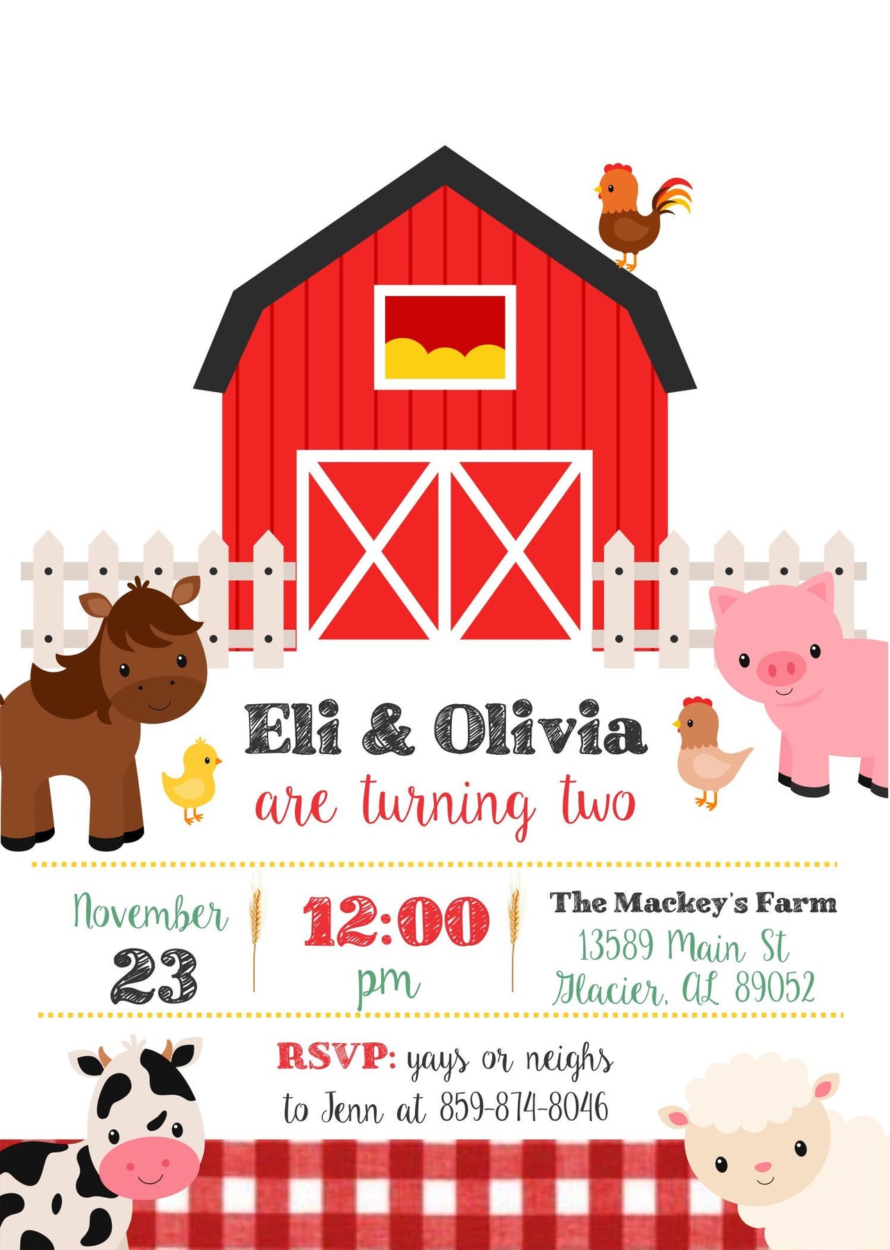 This Farm Birthday Invitation is perfect for your son or daughters barnyard birthday party, the wording can also be customized to accommodate any age kids birthday like "Join in the Barnyard Fun, Harper is turning ONE" or "Join us for a barnyard party, Jason is turning THREE". This farm birthday invite can be customized for siblings or twins too!