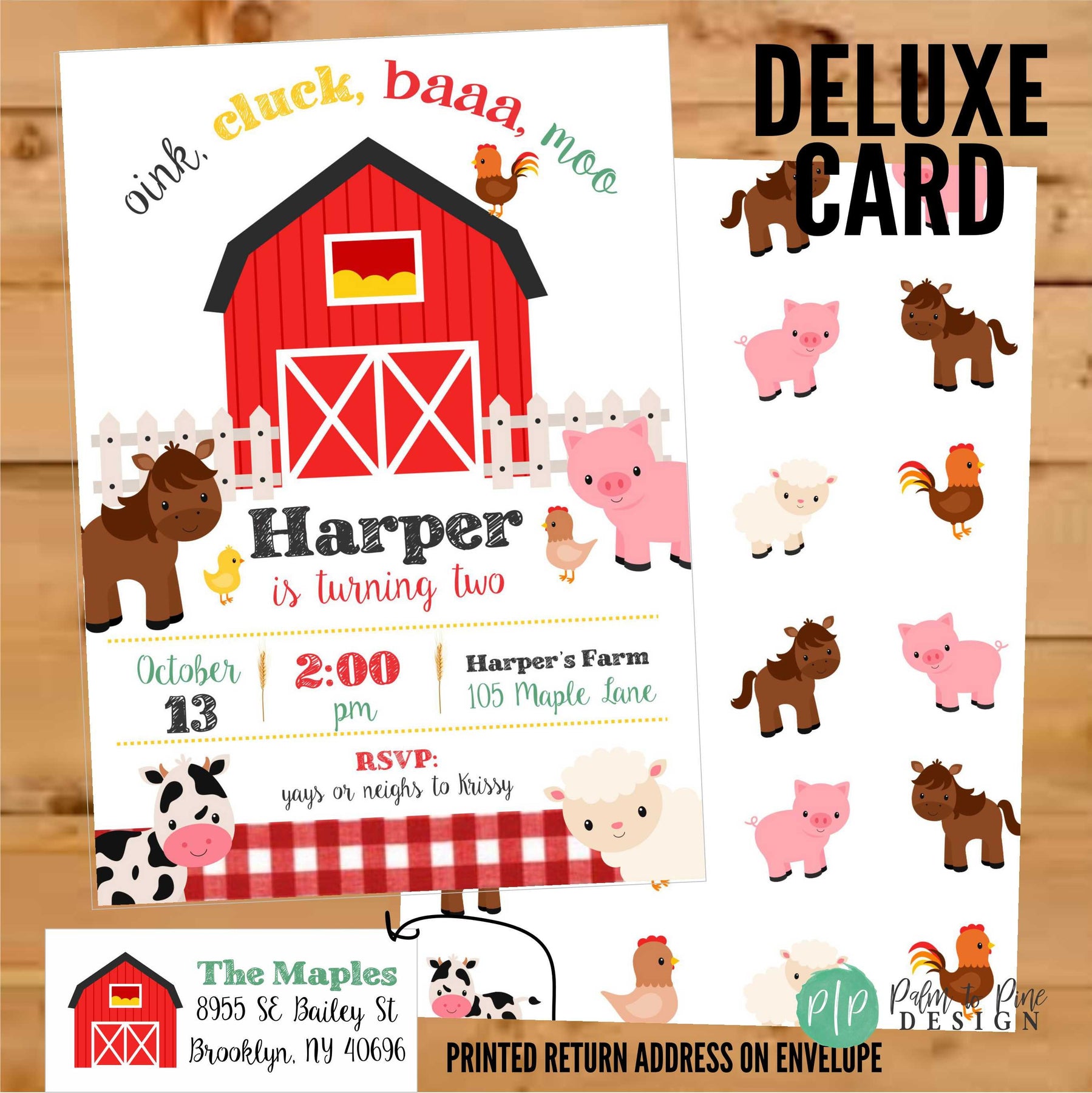 The farm animal clipart, red barn and red gingham set the perfect theme for your matching farm birthday party decor.