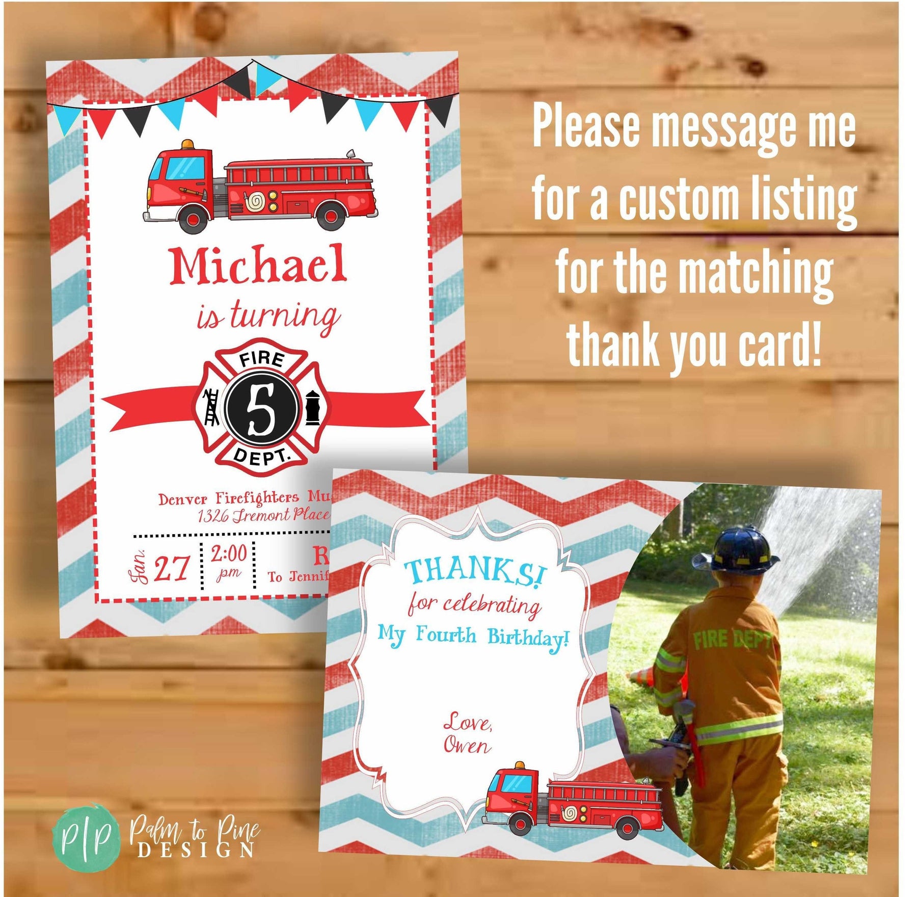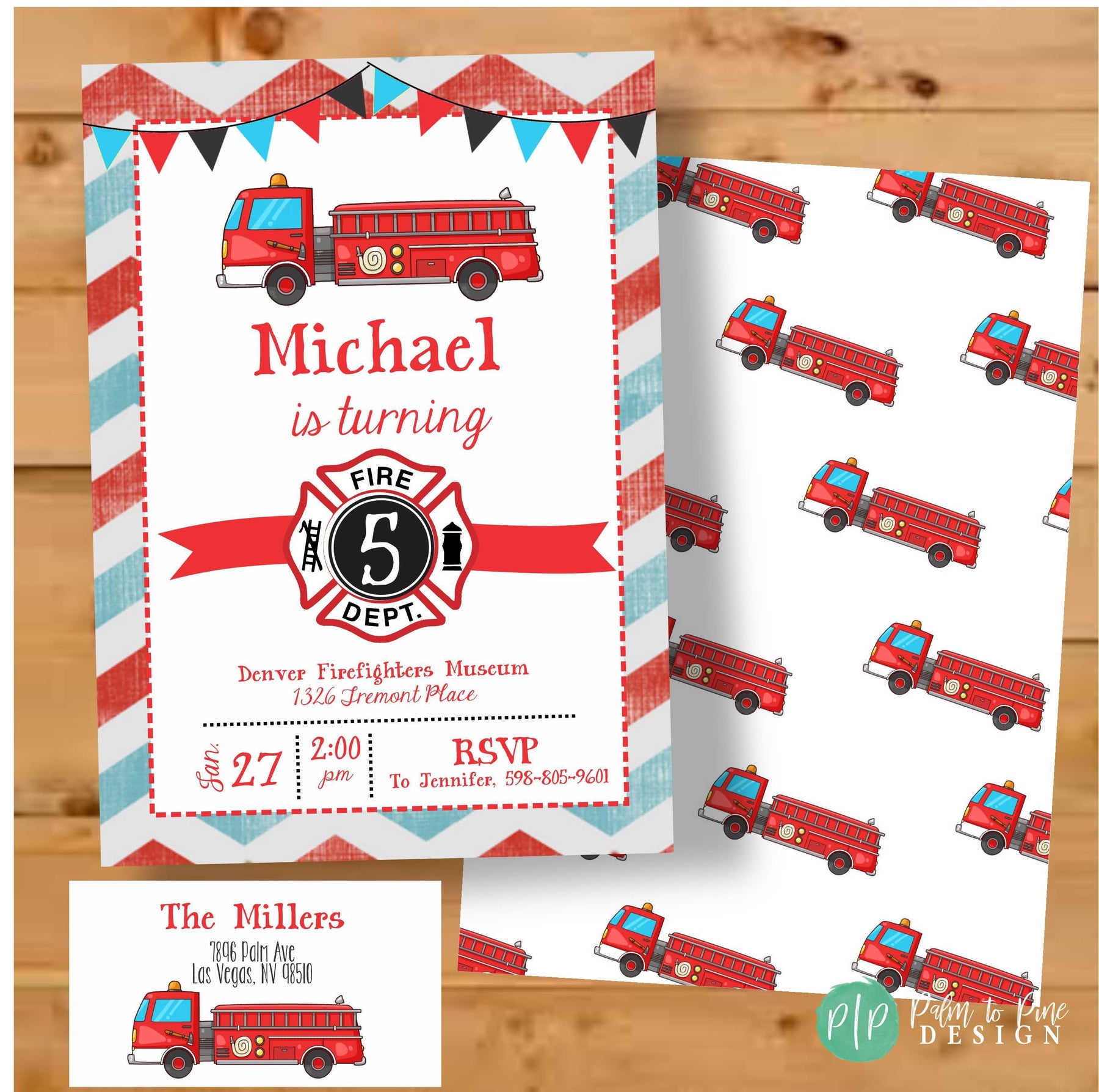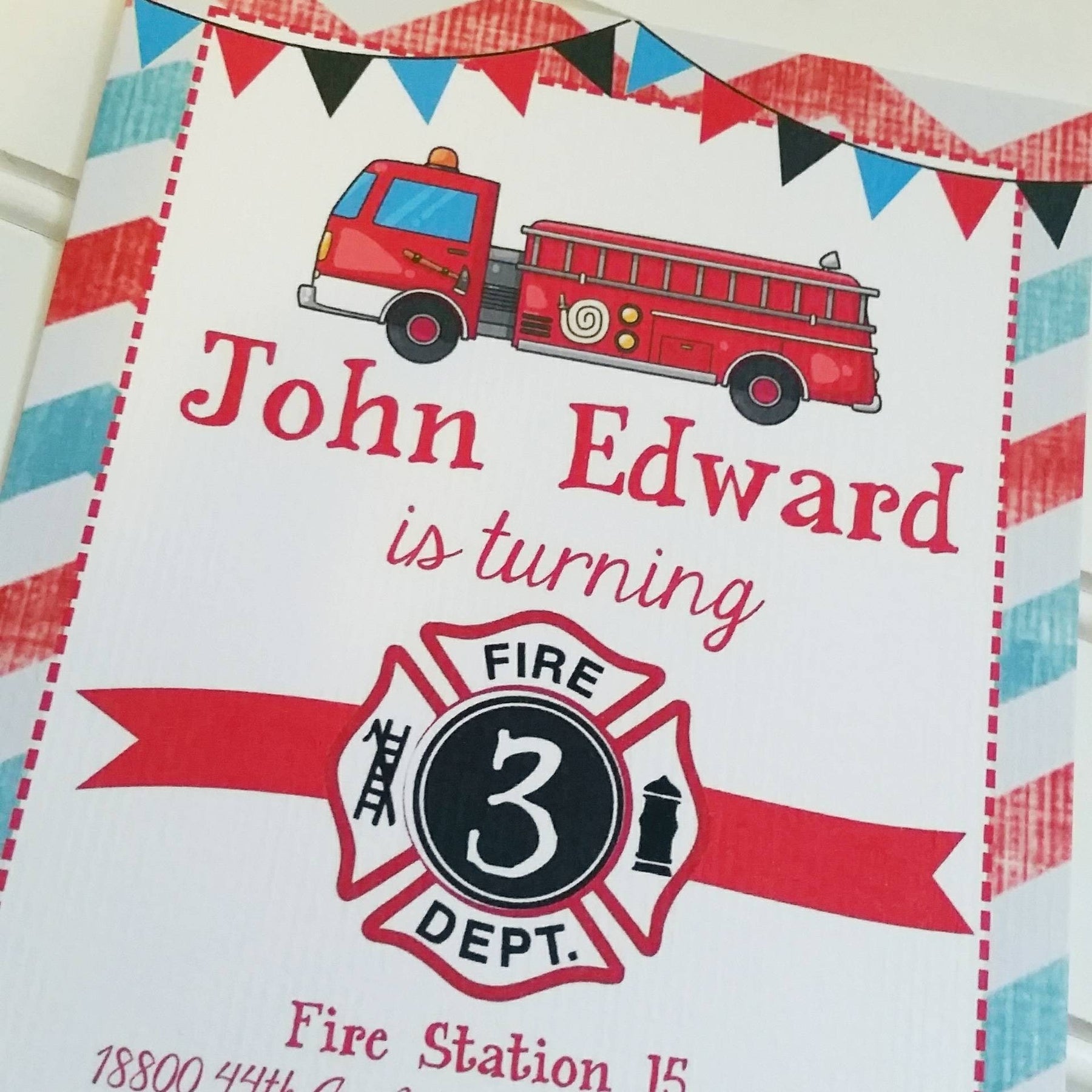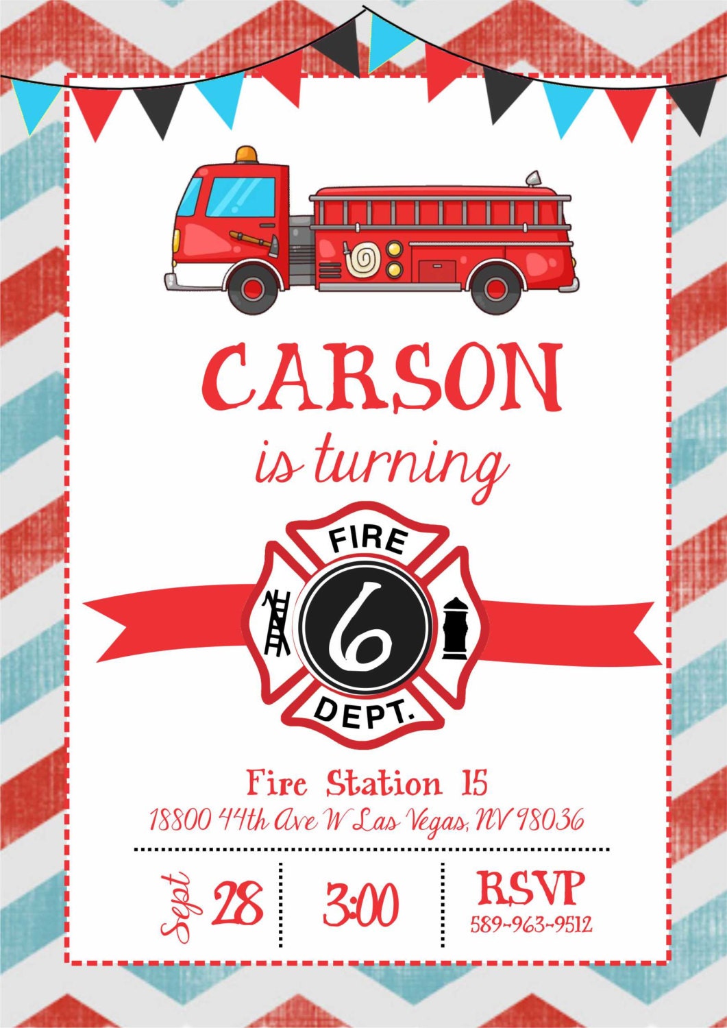 This vintage yet modern Firefighter birthday invitation is perfect for your little boy or girls birthday party, at home or at a fire station. The vintage watercolor red and blue chevron background match perfectly with the fire fighter clip art and red, blue and black bunting; great for a firetruck themed party. The wording on this invite can be customized for your party and any age child, and is even great for a firefighter baby shower!