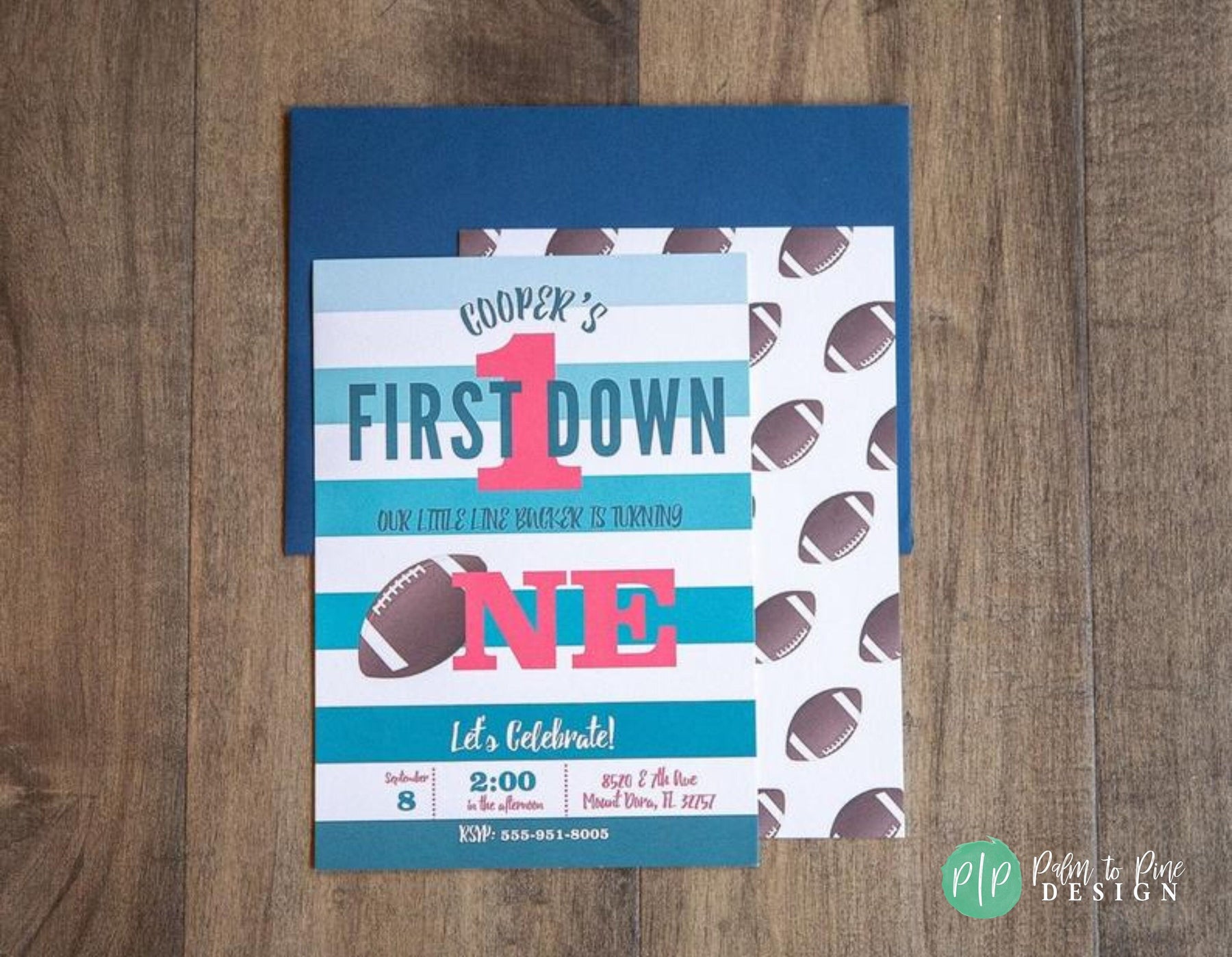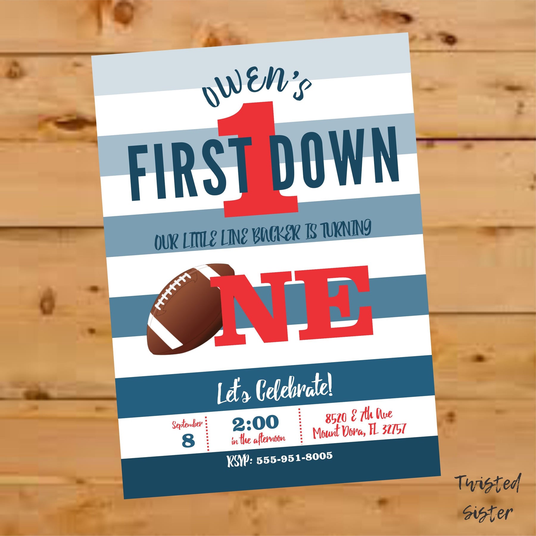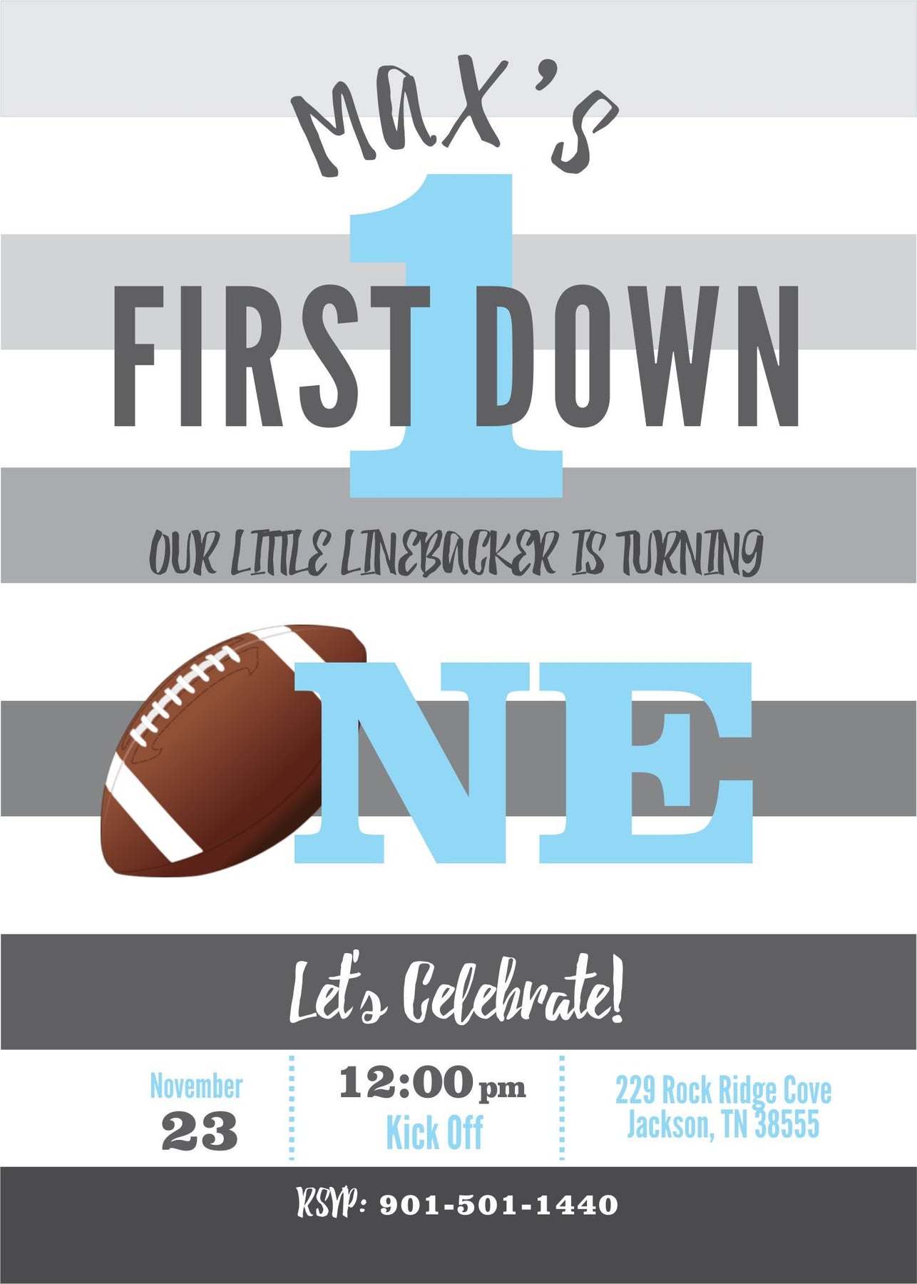 This blue striped football invite is perfect for your sons first birthday, second birthday or can be customized for any age child! The striped blue background can also be changed to match your party or team colors!