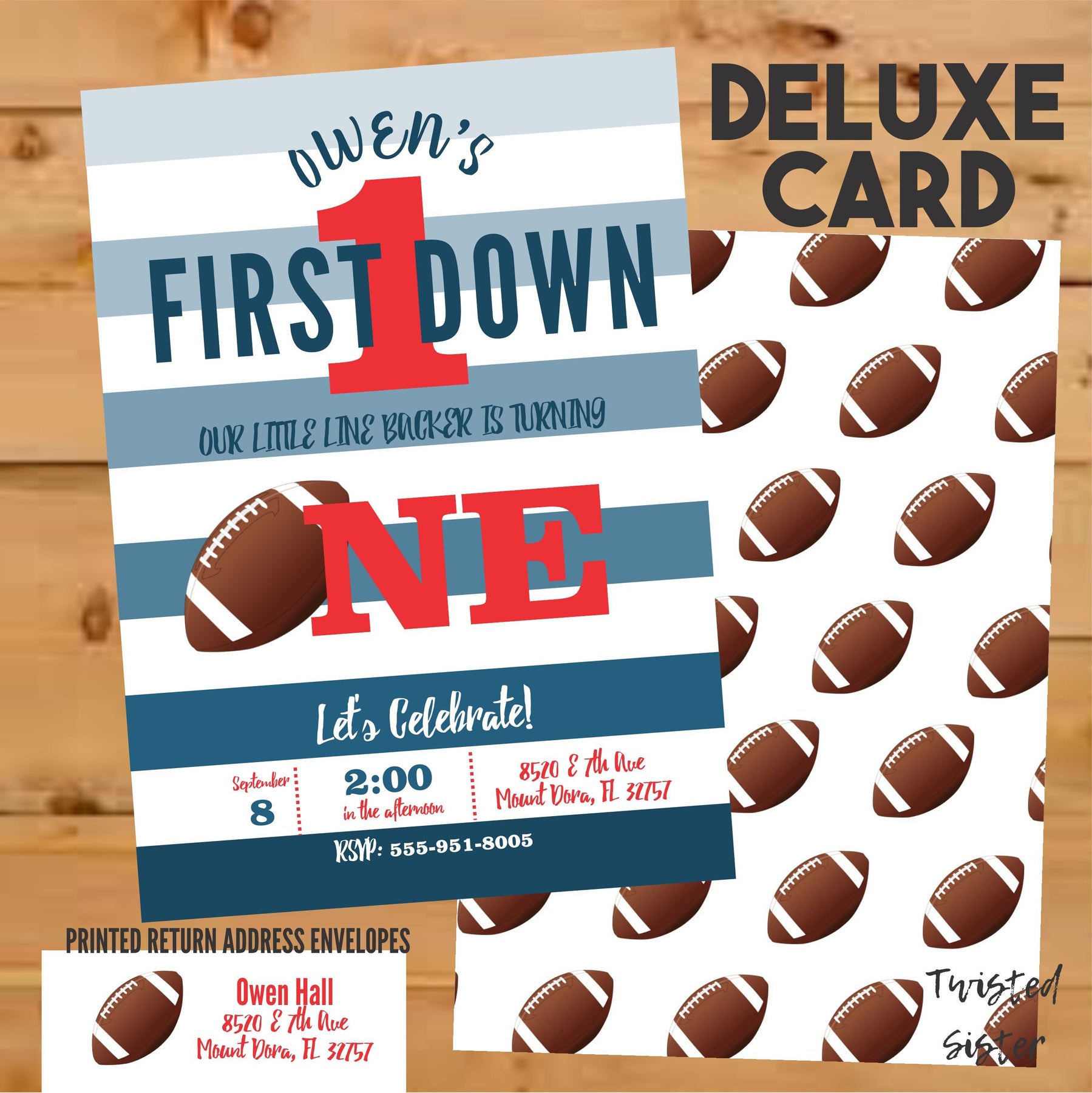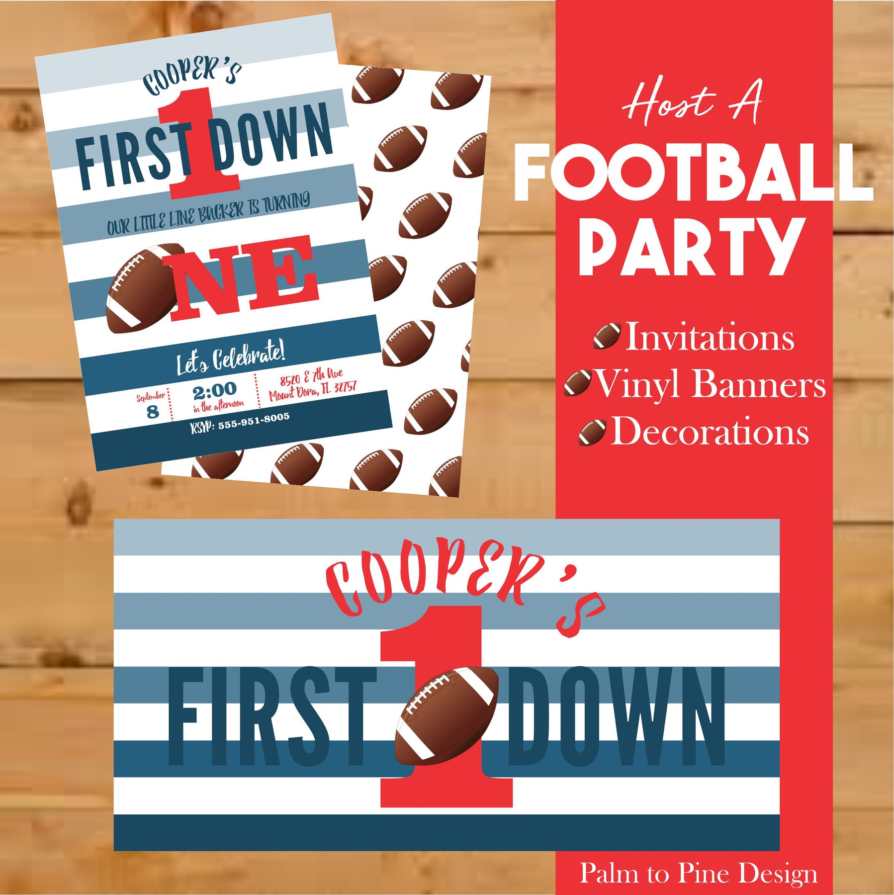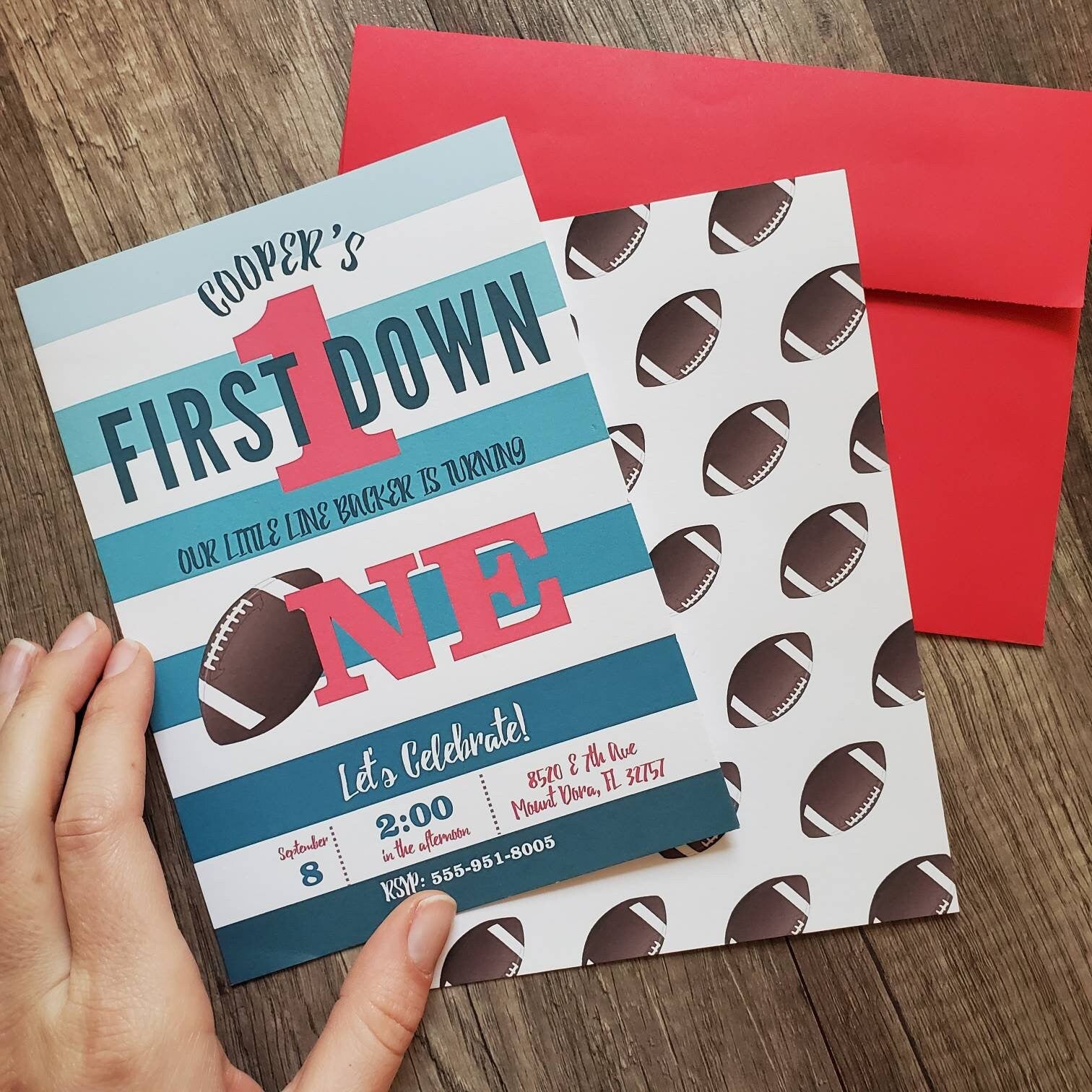 This blue striped football invite is perfect for your sons first birthday, second birthday or can be customized for any age child! The striped blue background can also be changed to match your party or team colors!