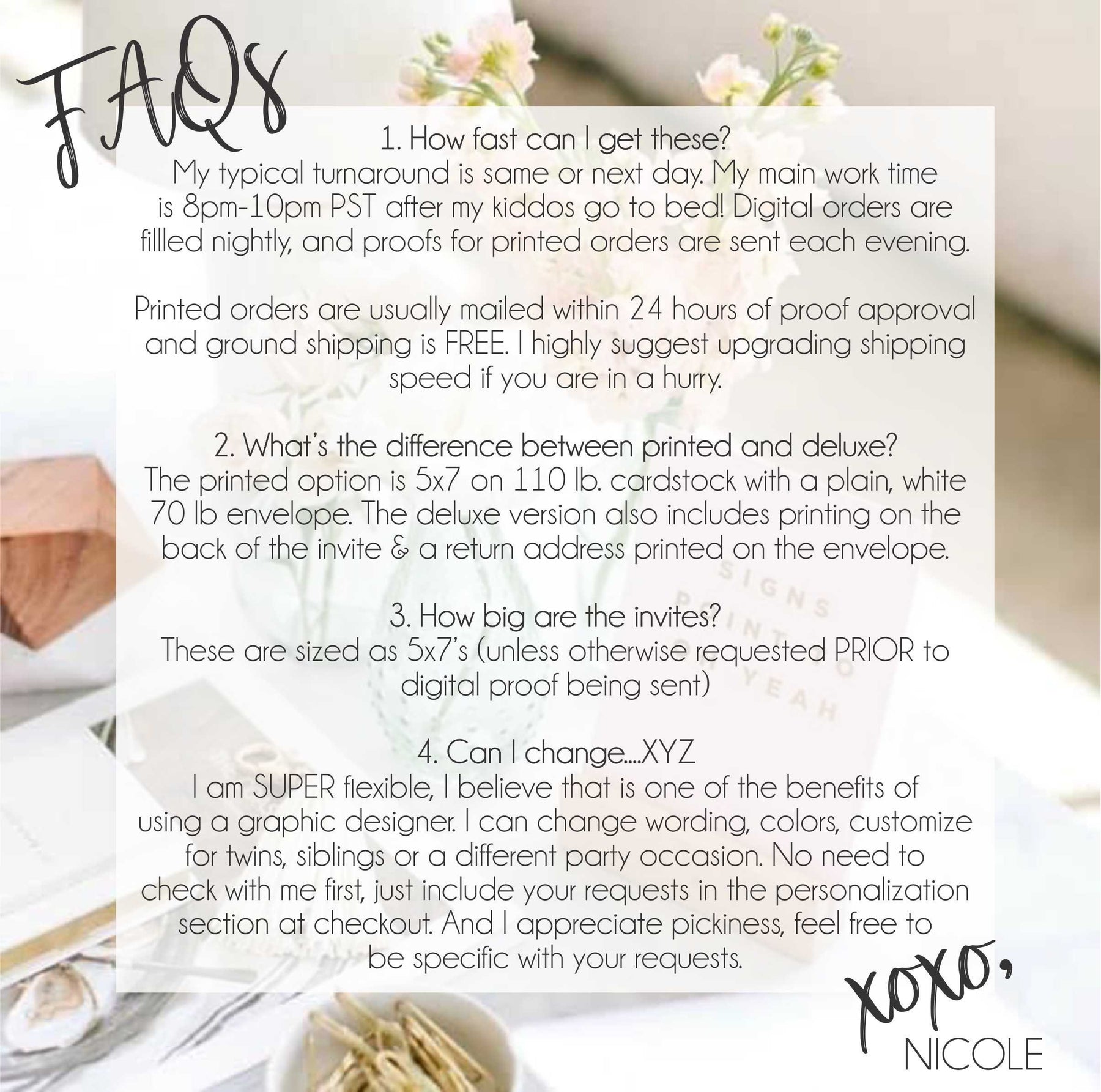 Invitations: Digital proofs are sent via email within 1 business day, after proof approval, invitations are mailed typically next business day via USPS.