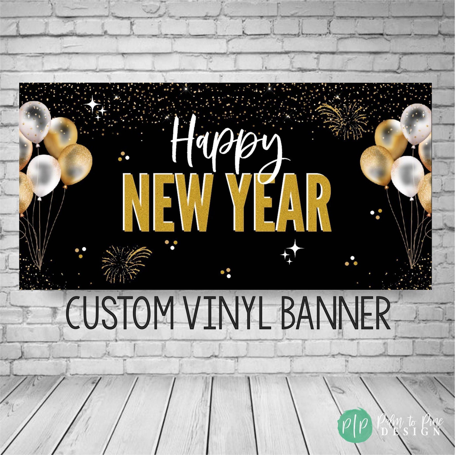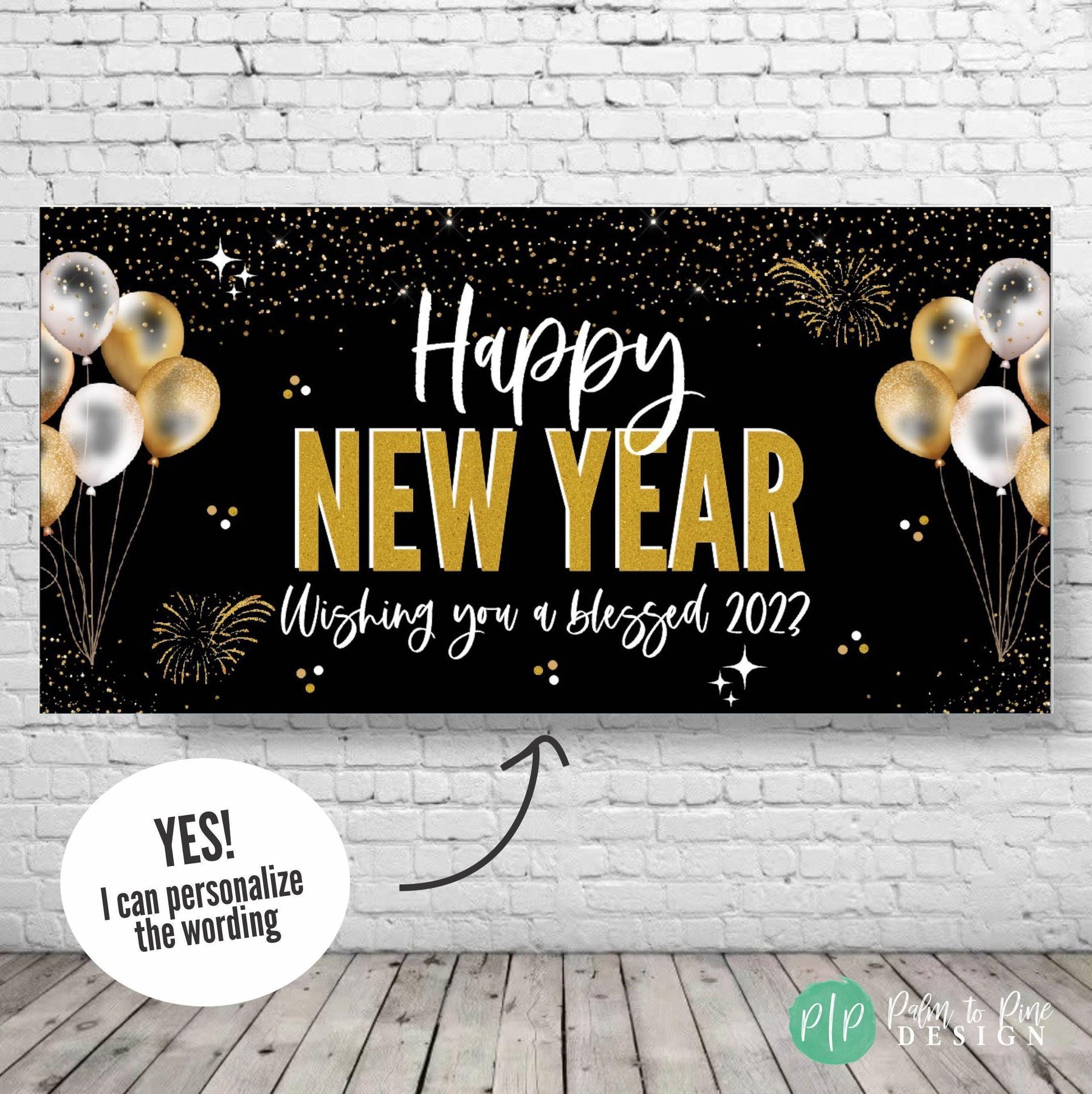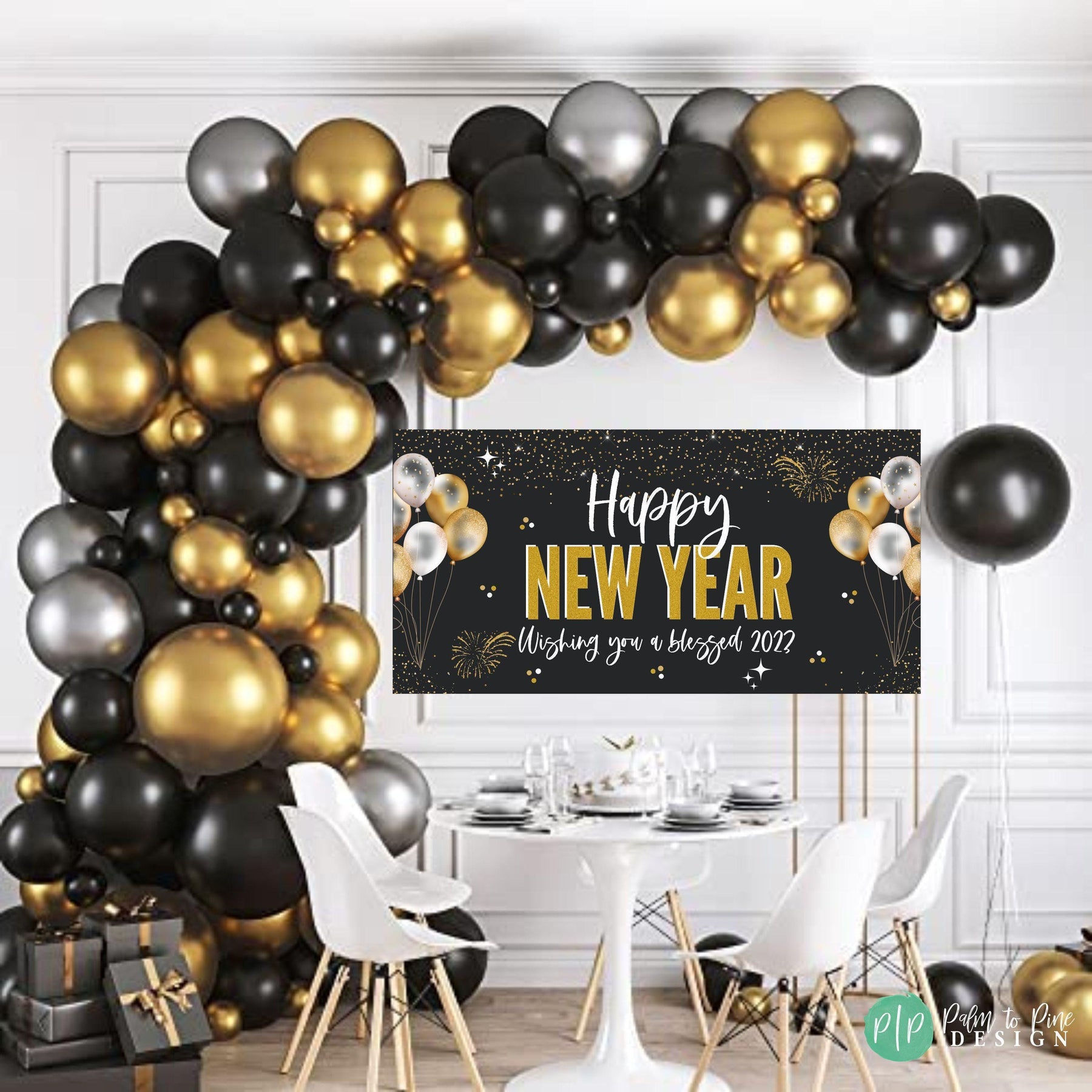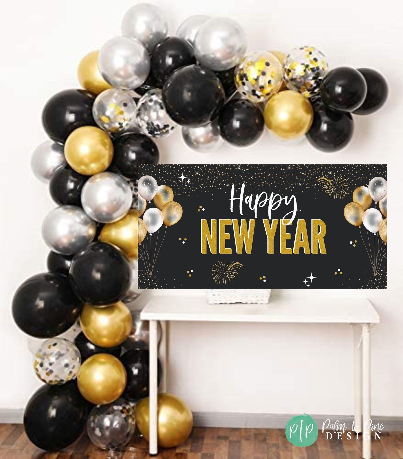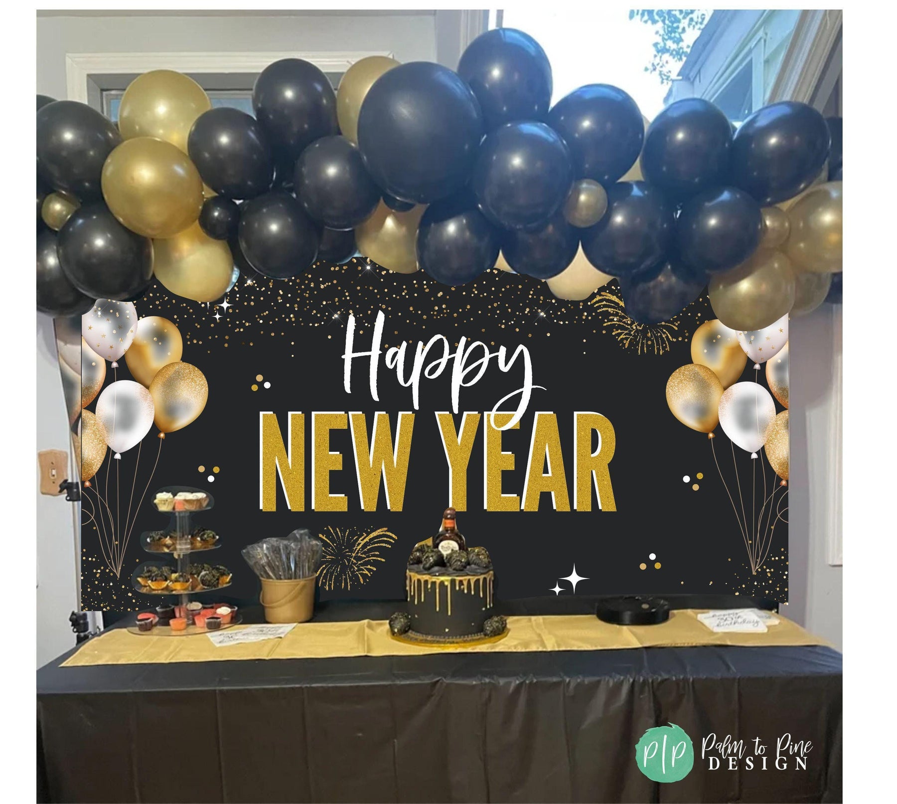 This personalized black and gold New Year Banner is the perfect piece of decor to ring in the new year with! This New Year Banner will look perfect behind a dessert table, in the entryway of your party or be the perfect backdrop for your New Year kiss at midnight! Use this banner for a low key pajama party at home with your family, dress it up for a fancy celebration or use this at an event or business place to welcome in the New Year!