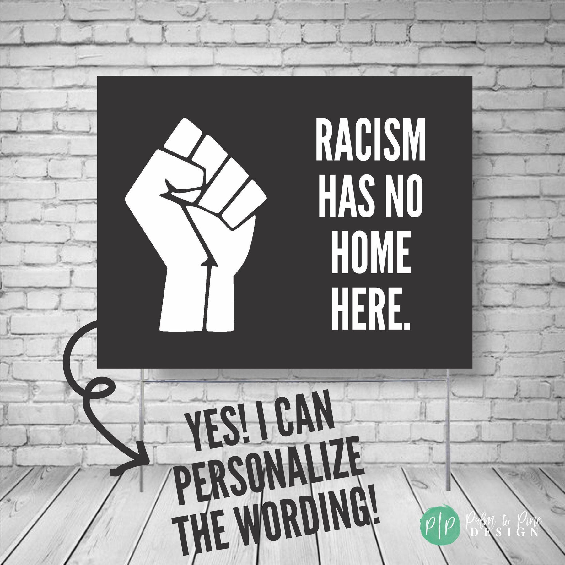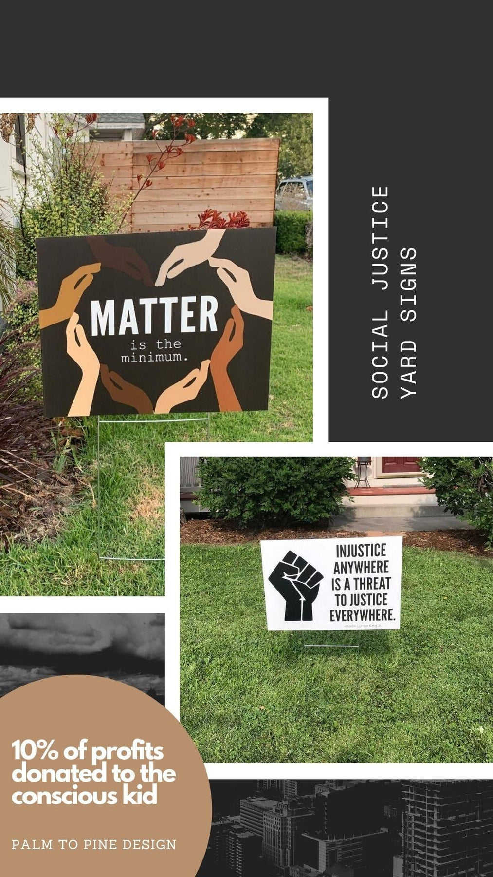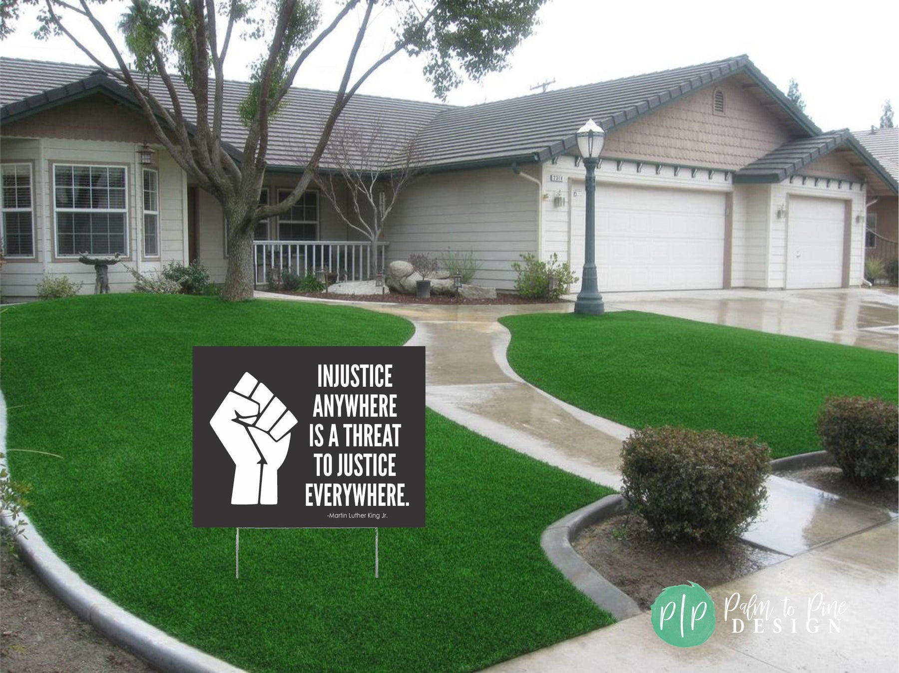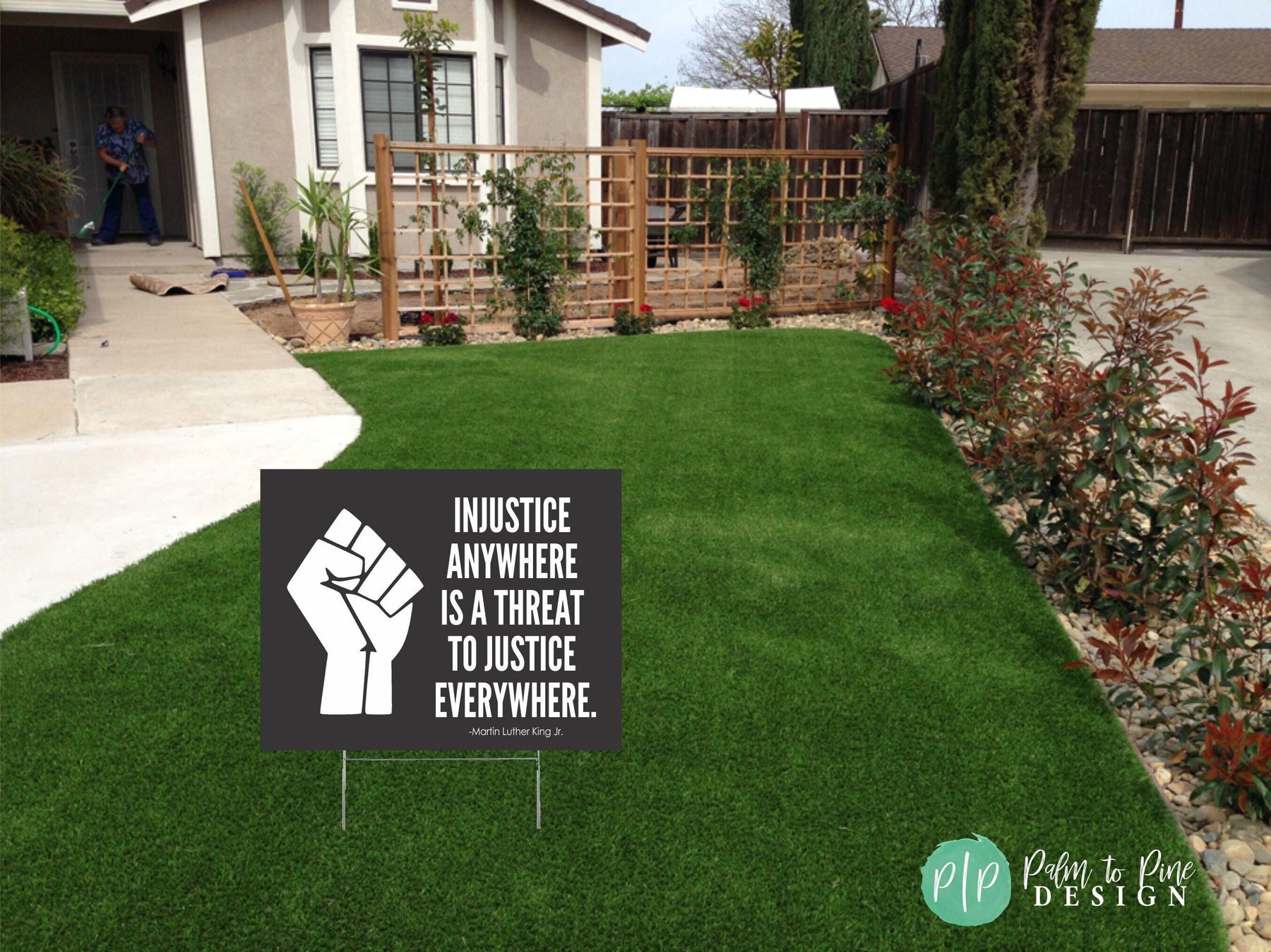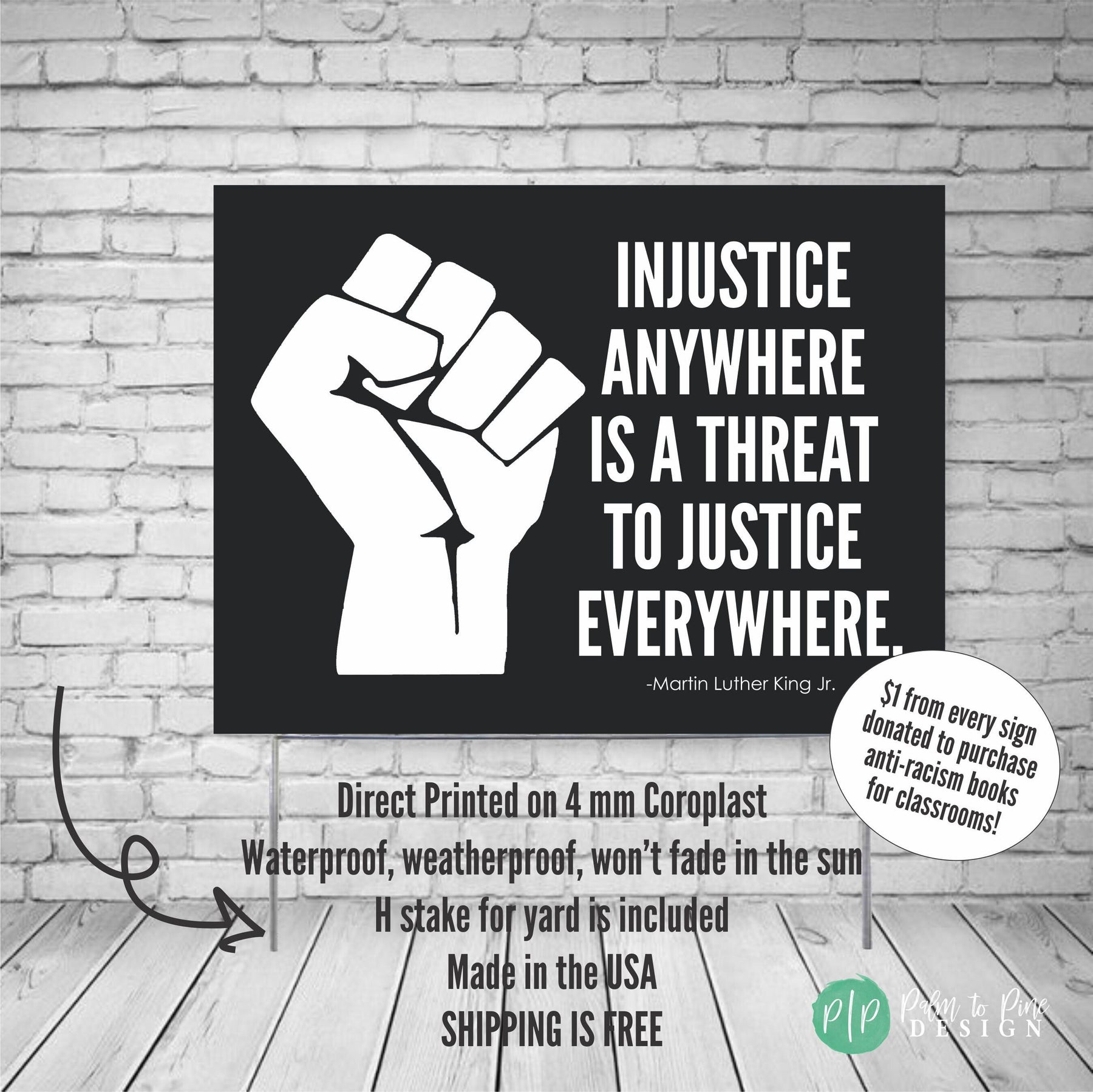 This Black Lives Matter "Injustice Anywhere" yard sign featuring Martin Luther King Jr's. powerful quote can be displayed outdoors or indoors to show your support and voice for the Black Lives Matter Movement. The wording on this sign can be customized with any wording you would like to raise awareness and demand justice and equality. This social justice, peaceful protest sign can be displayed outdoors in the yard, carried at rallies, protests or BLM marches, hung from cars or storefronts. The 4 mm coroplast is printed directly onto the material, so it will not fade in the sun and is 100% waterproof.