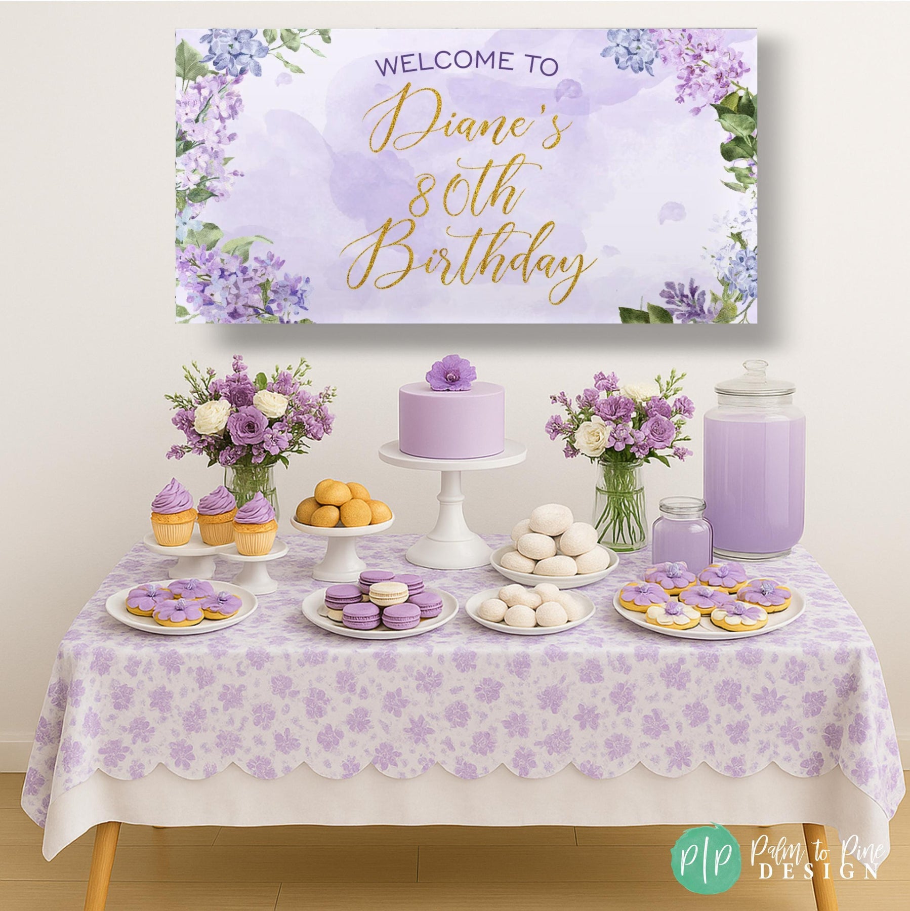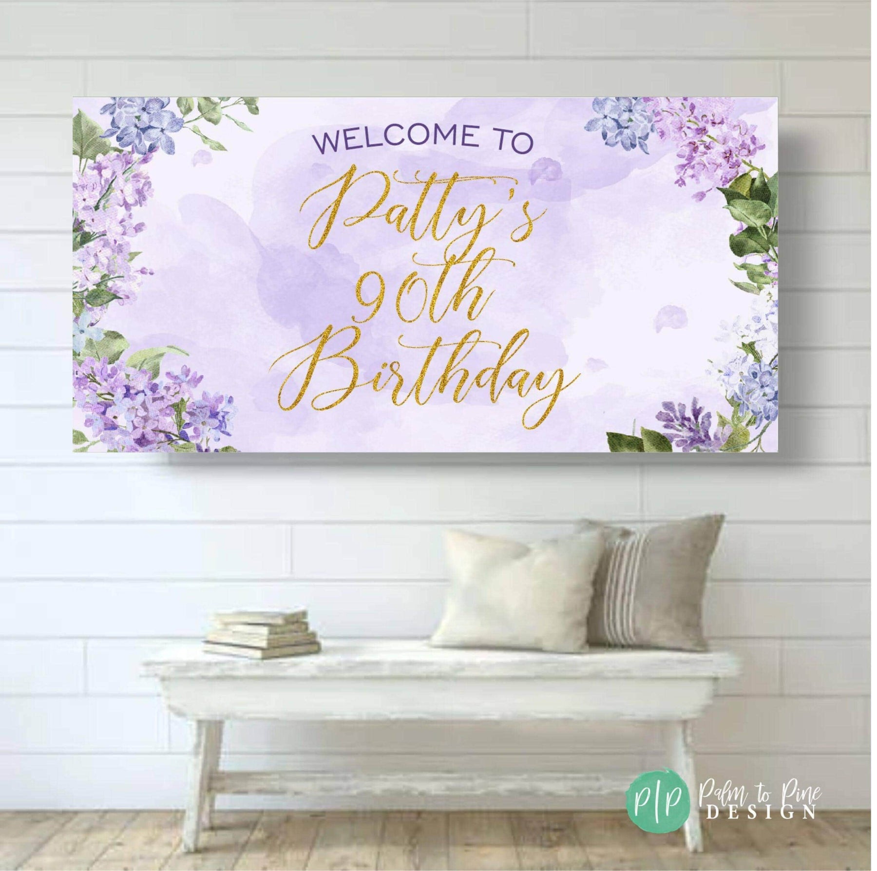 This lilac happy birthday banner in purple and gold watercolor is perfect for celebrating a birthday, baby shower or bridal shower! This feminine purple and gold lilac Happy Birthday Banner is the perfect way to use behind a dessert table, in your entryway or yard! I can personalize this banner for any event!