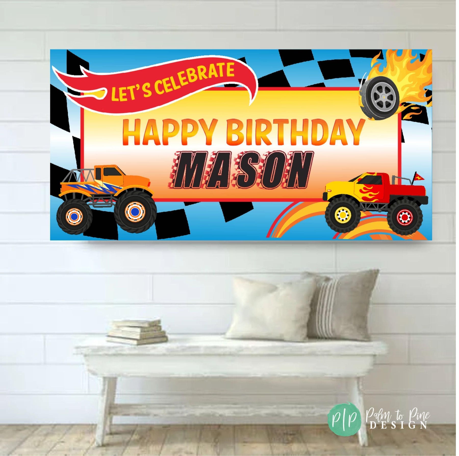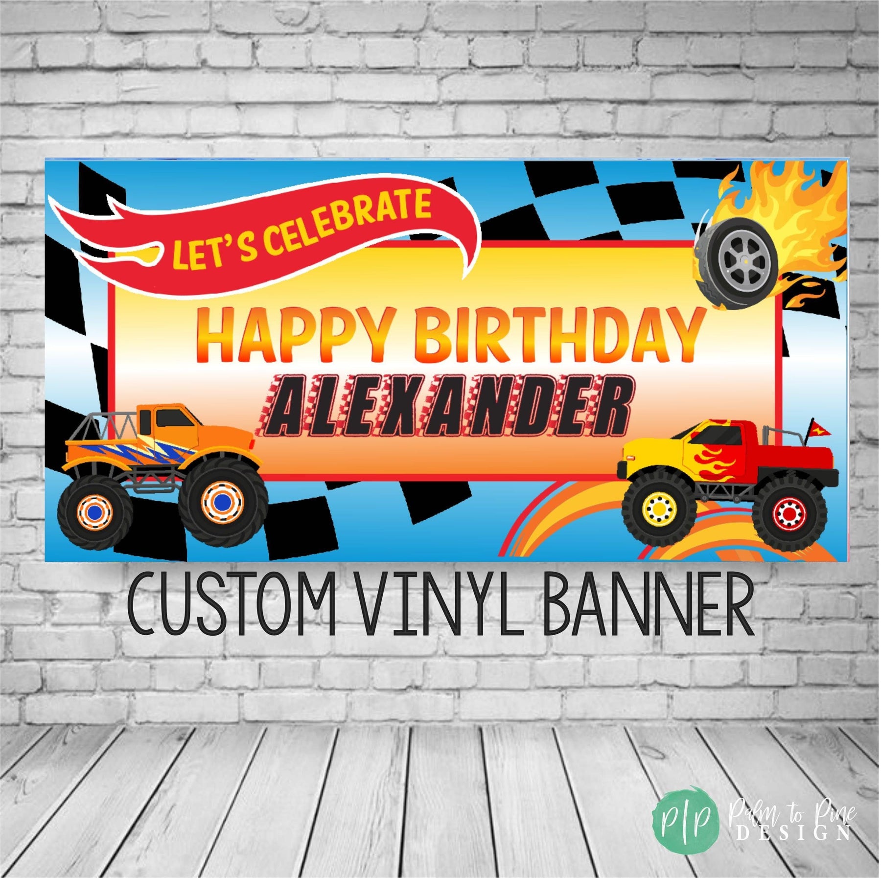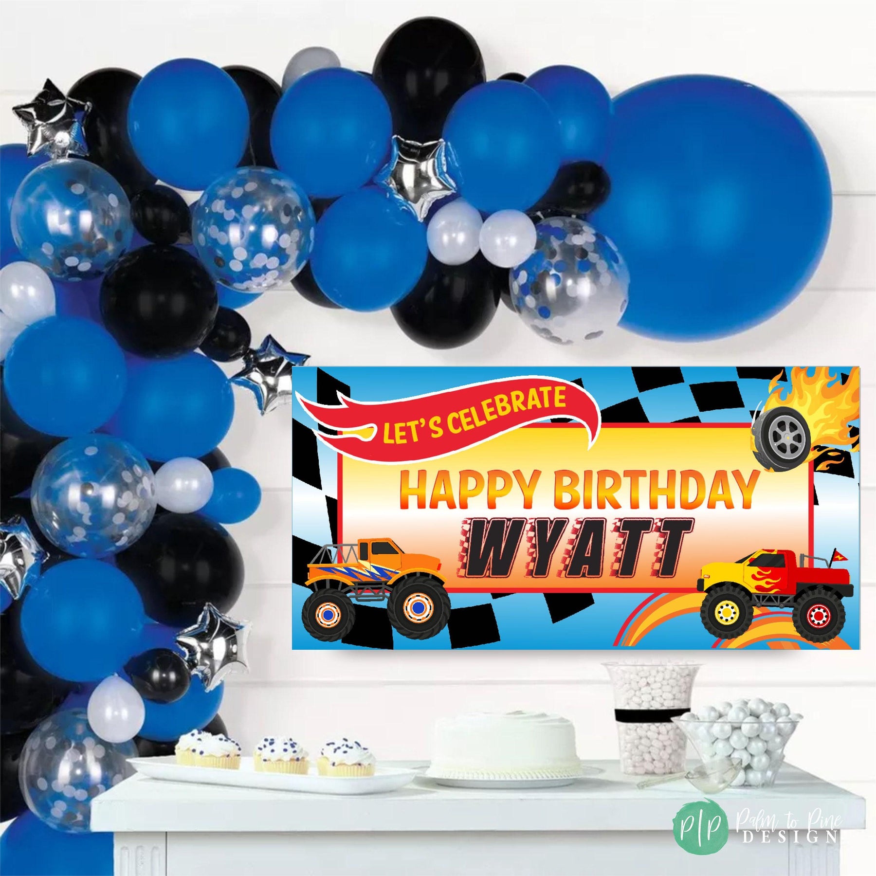 Rev up your little one's birthday party with our Monster Truck Extravaganza Birthday Banner! This premium banner brings the thrills and excitement of a monster truck rally right to your backyard. Made from robust and weather-resistant vinyl, it's perfect for both indoor and outdoor celebrations. Its vibrant colors and high-definition graphics will surely catch all the little racers' attention. Each banner is carefully crafted to ensure it stands out as the centerpiece of the party decorations. It incorporates a dynamic monster truck design that boys absolutely adore. With its superb quality and eye-catching design, it's a tire-screeching, engine-roaring addition to your child's monster truck-themed birthday party.