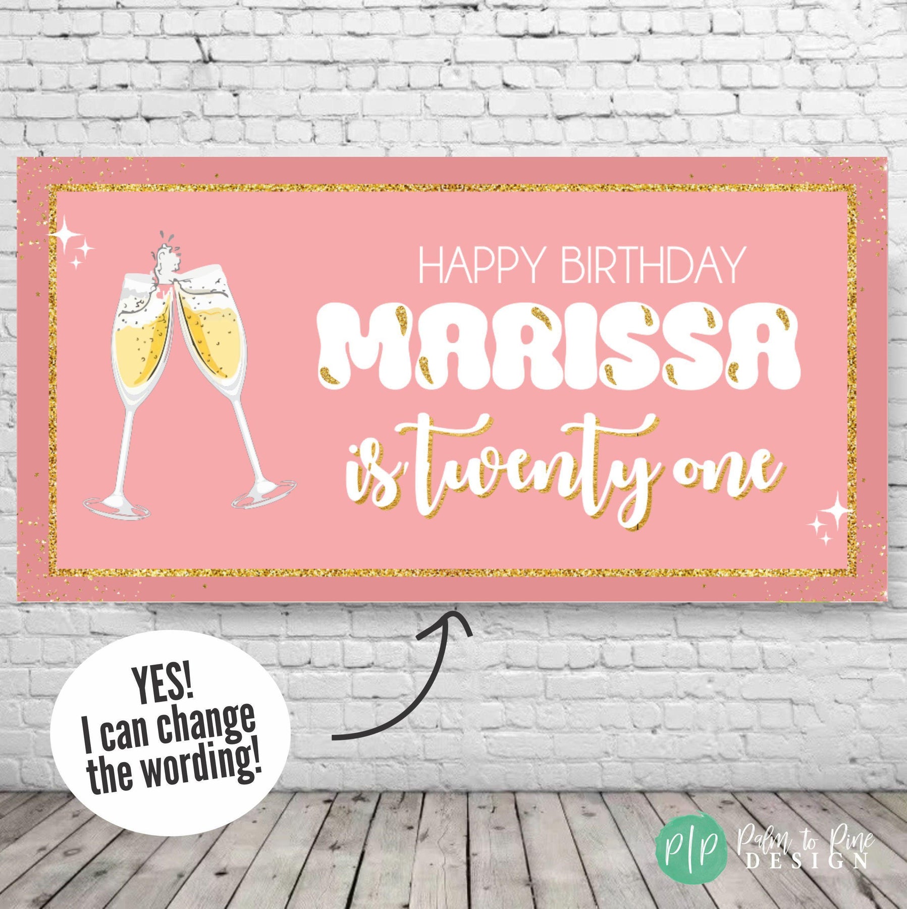 21st birthday personalized banner in pink and gold with champagne glass cheers
