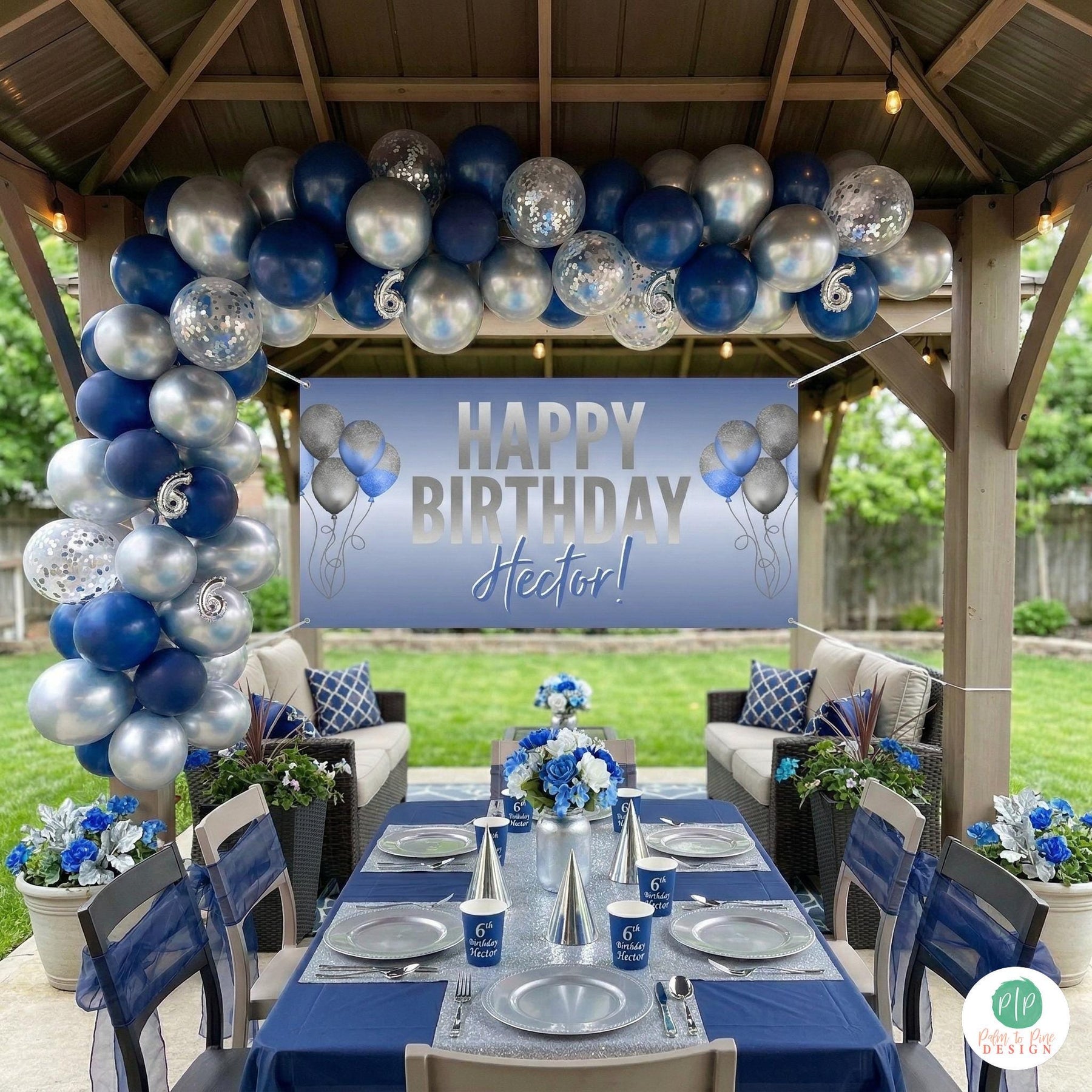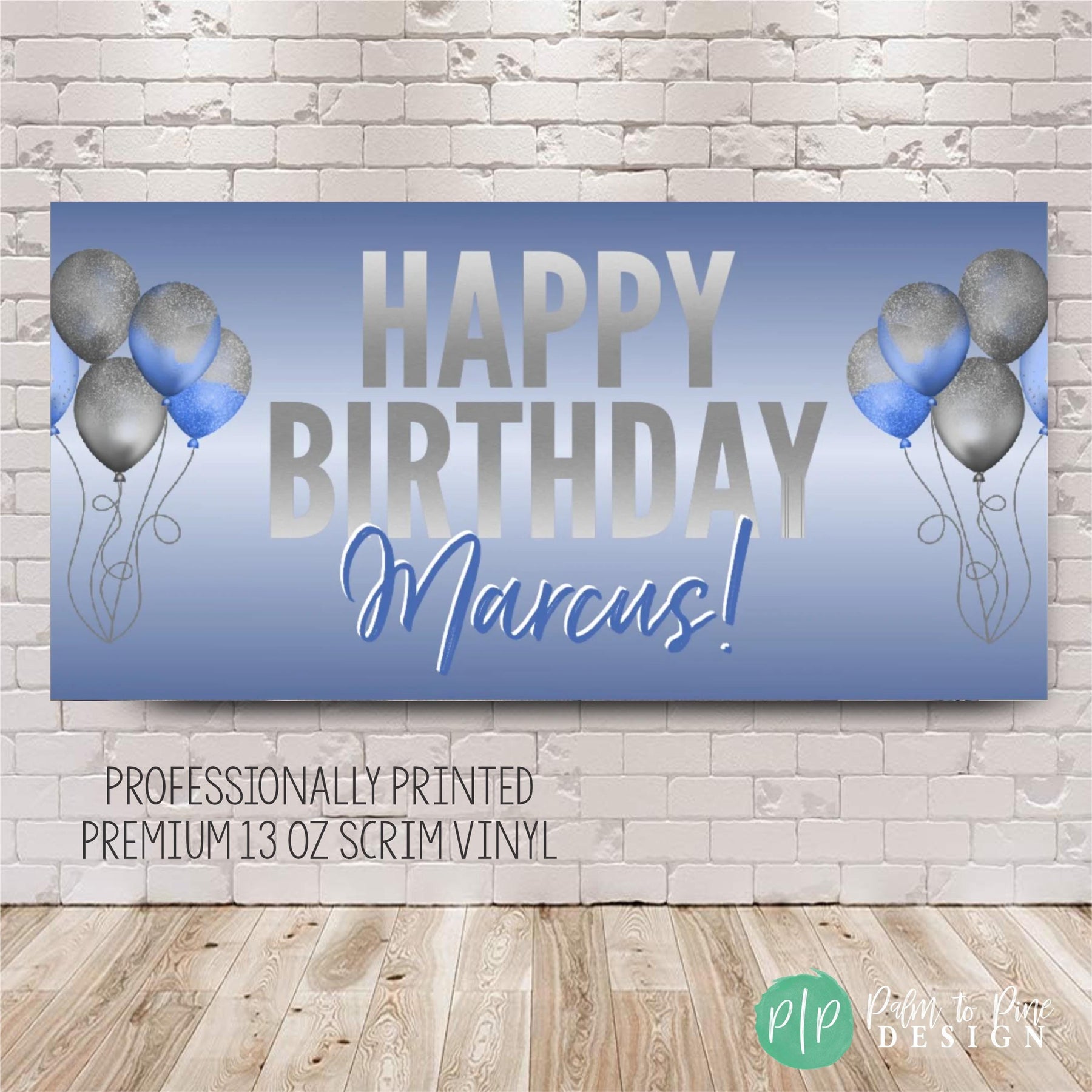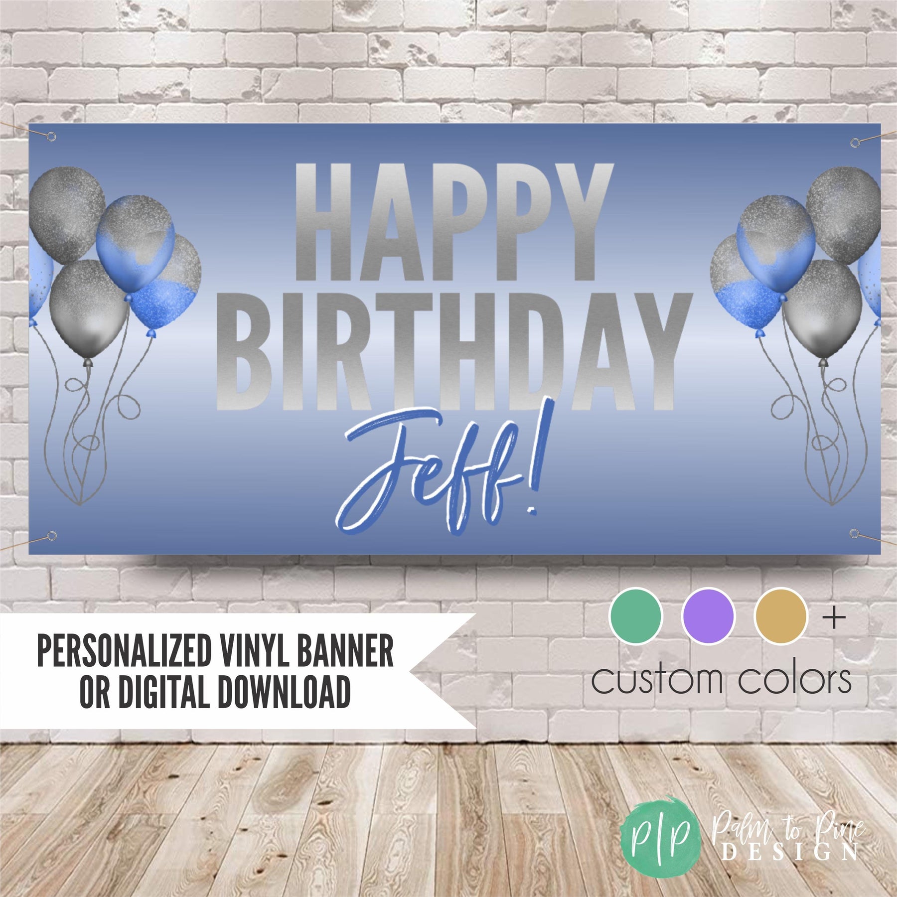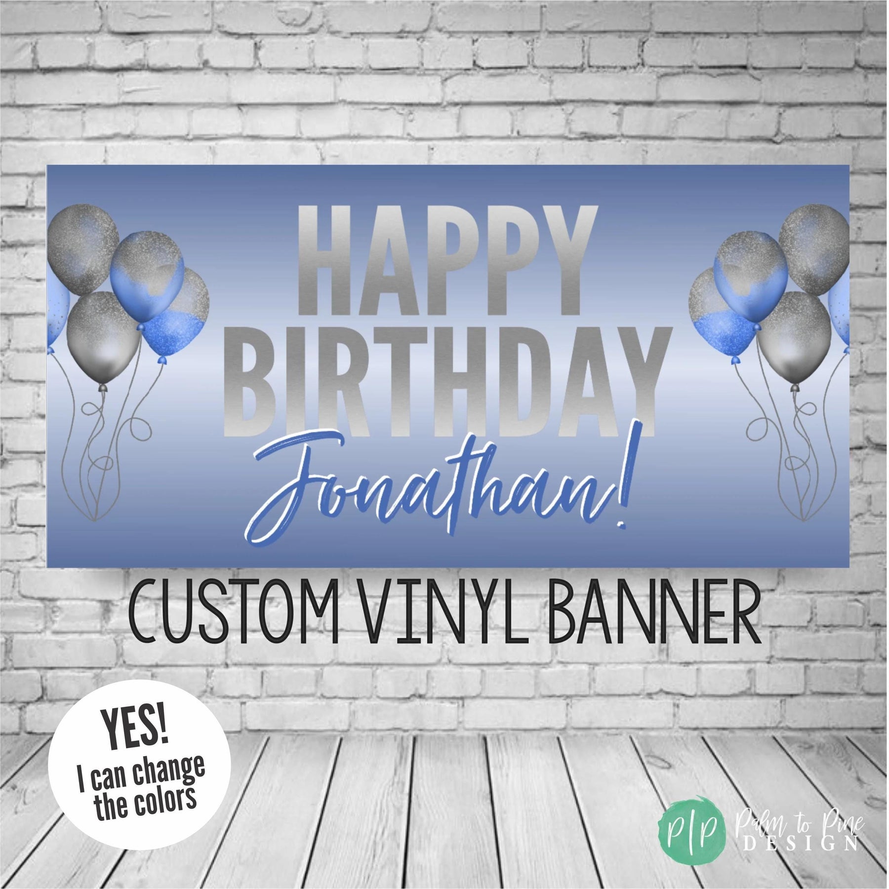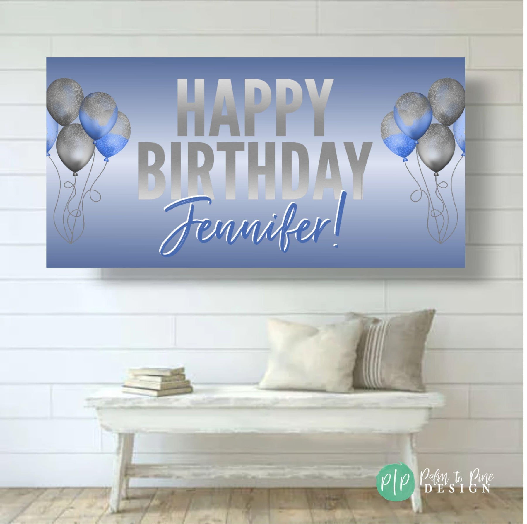 Celebrate a Happy Birthday with this personalized blue and silver party backdrop, or change the colors or message to match any party theme or gender! This custom birthday banner is a fantastic way to celebrate any age and can be reused year after year as a fun birthday tradition. Professionally printed on high quality vinyl, this blue and silver banner is sure to stand out at your celebration, or is available as a digital download. The 'Happy Birthday' message and custom name is sure to become the focal point of your special occasion.