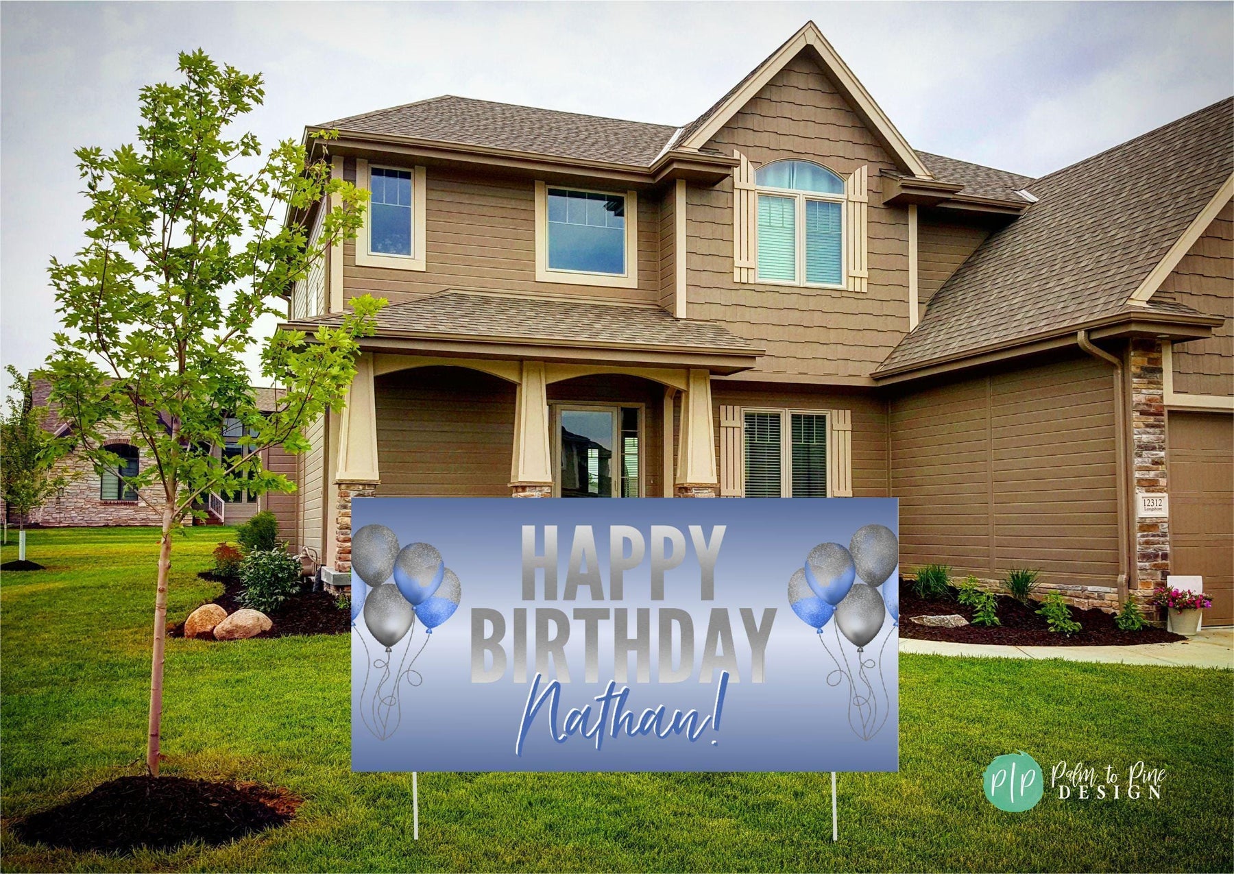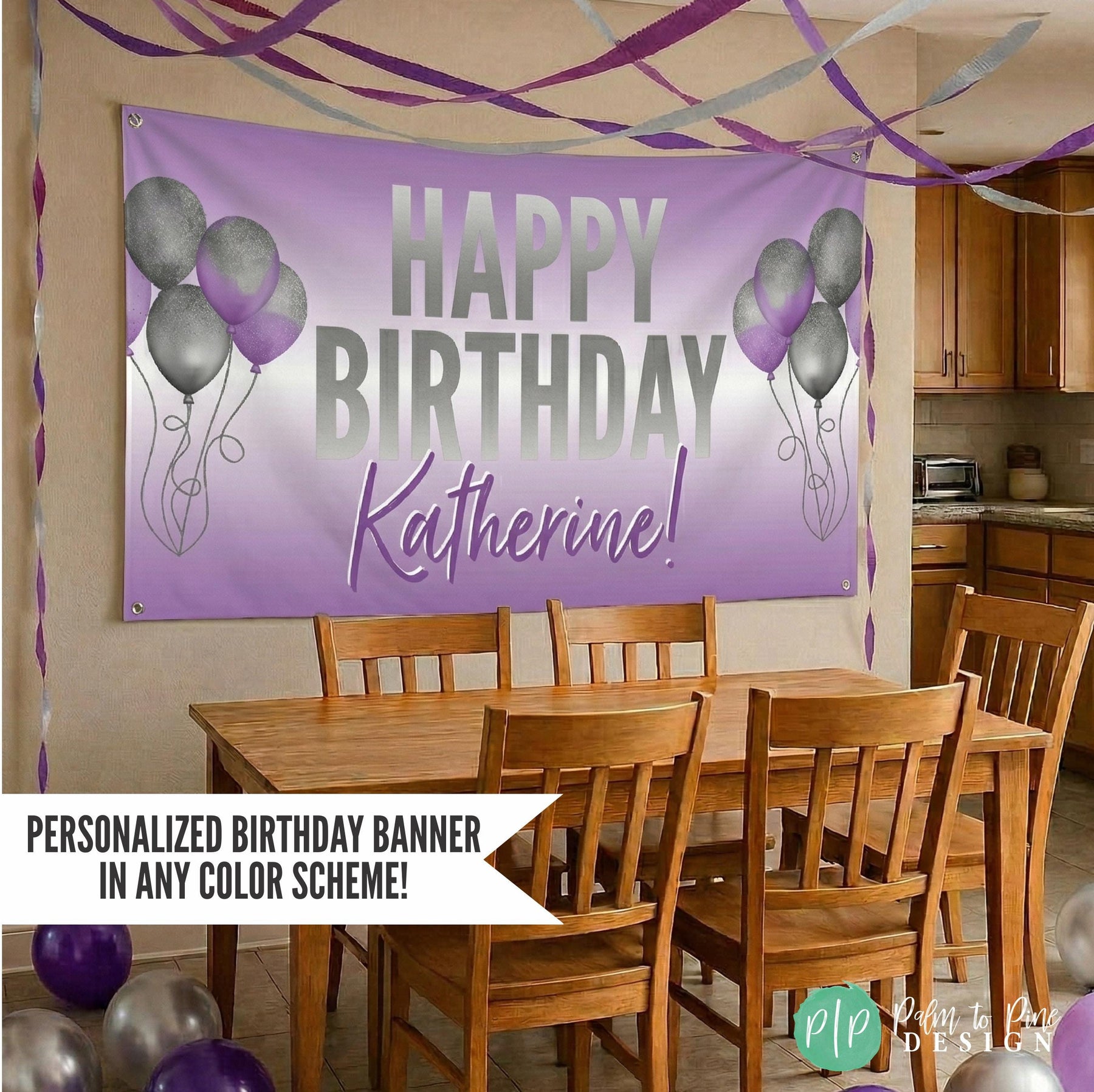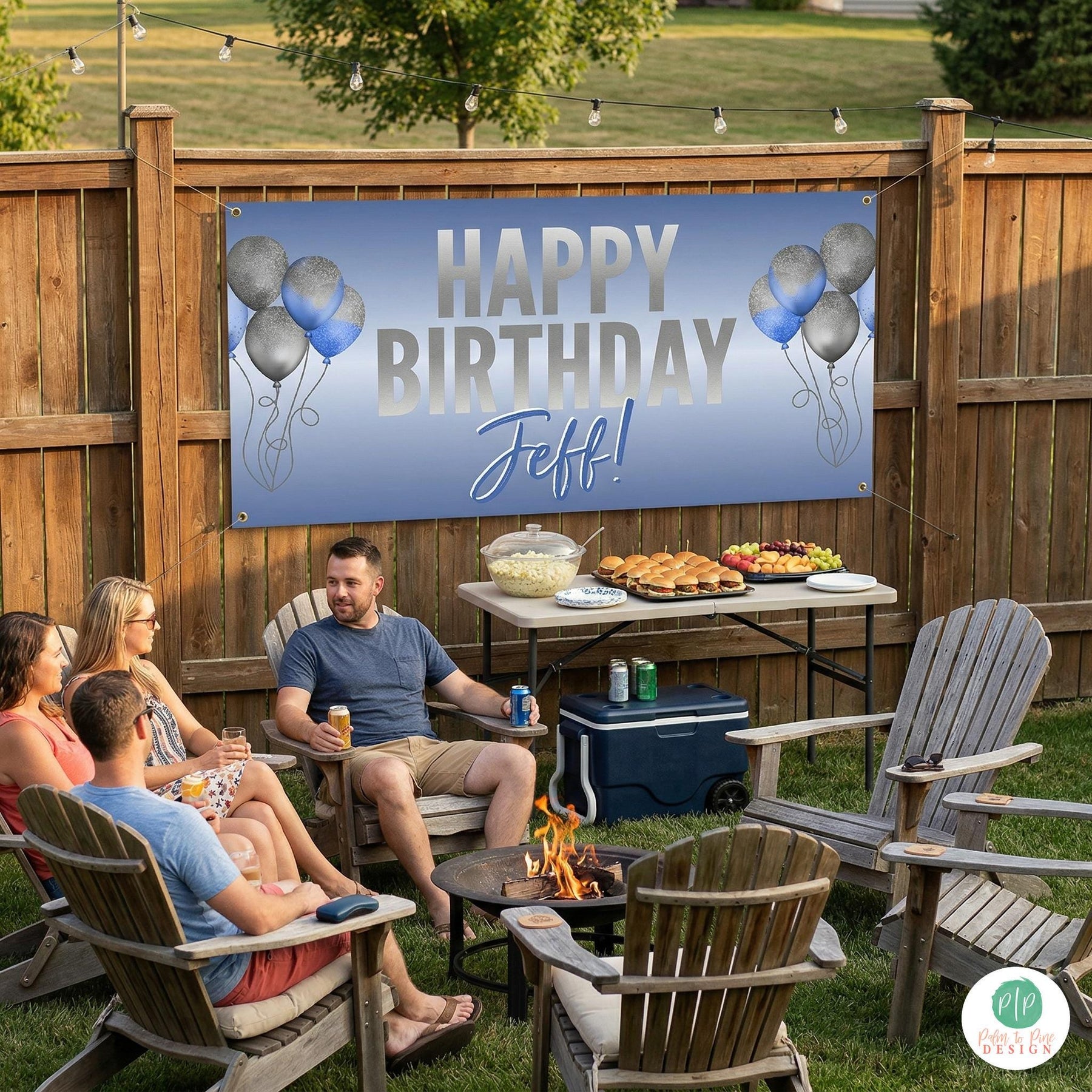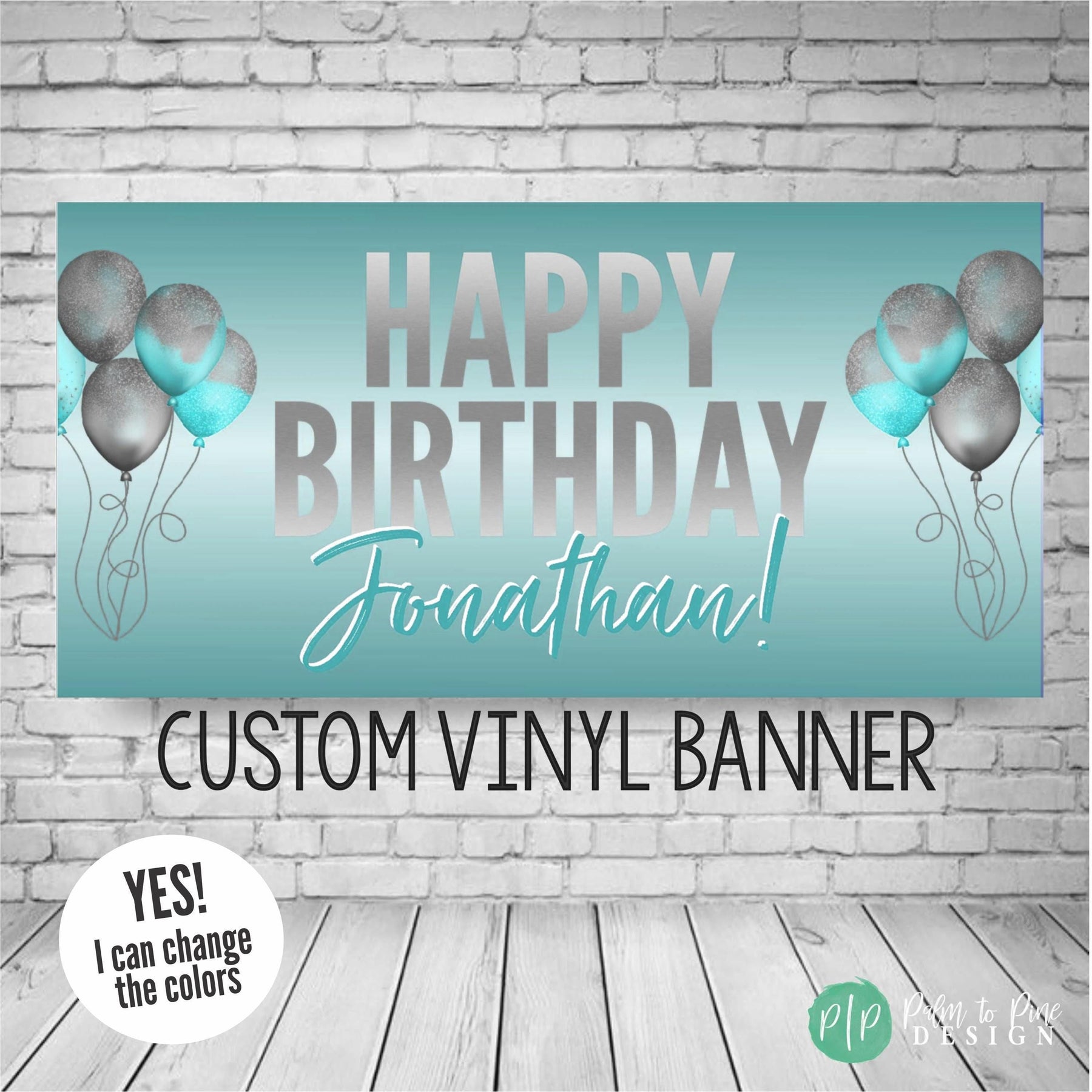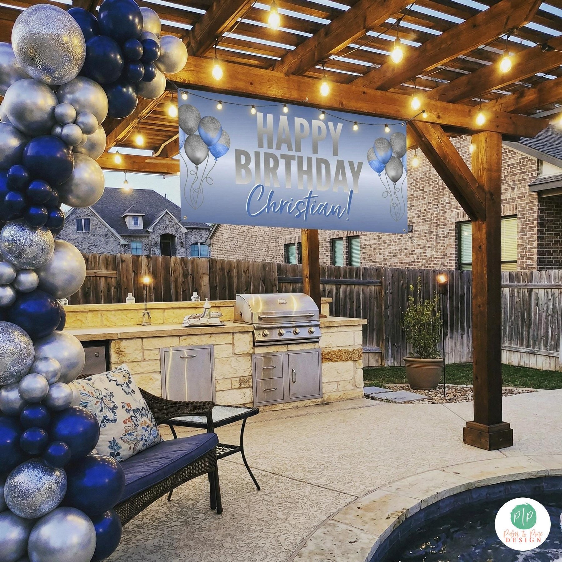 Celebrate a Happy Birthday with this personalized blue and silver party backdrop, or change the colors or message to match any party theme or gender! This custom birthday banner is a fantastic way to celebrate any age and can be reused year after year as a fun birthday tradition. Professionally printed on high quality vinyl, this blue and silver banner is sure to stand out at your celebration, or is available as a digital download. The 'Happy Birthday' message and custom name is sure to become the focal point of your special occasion.