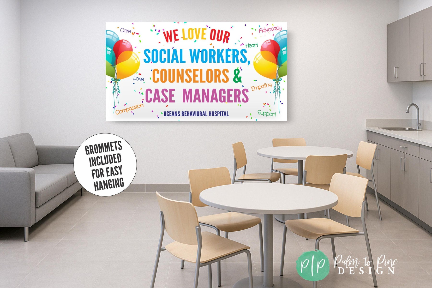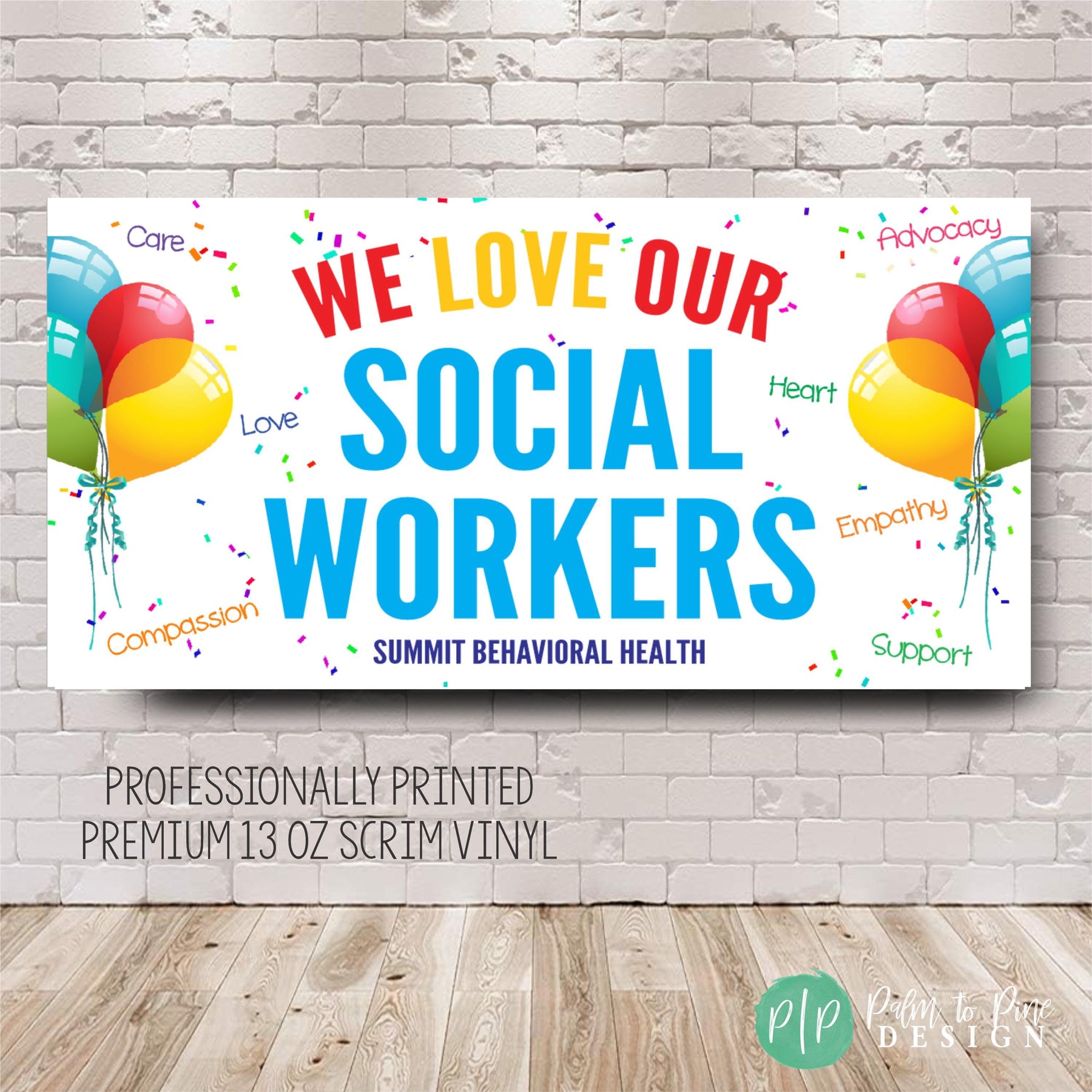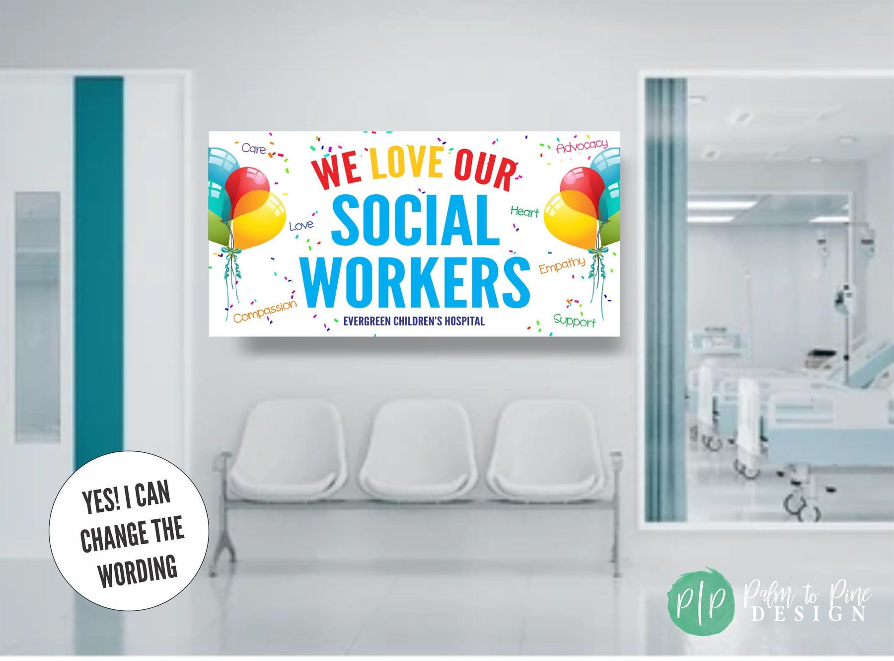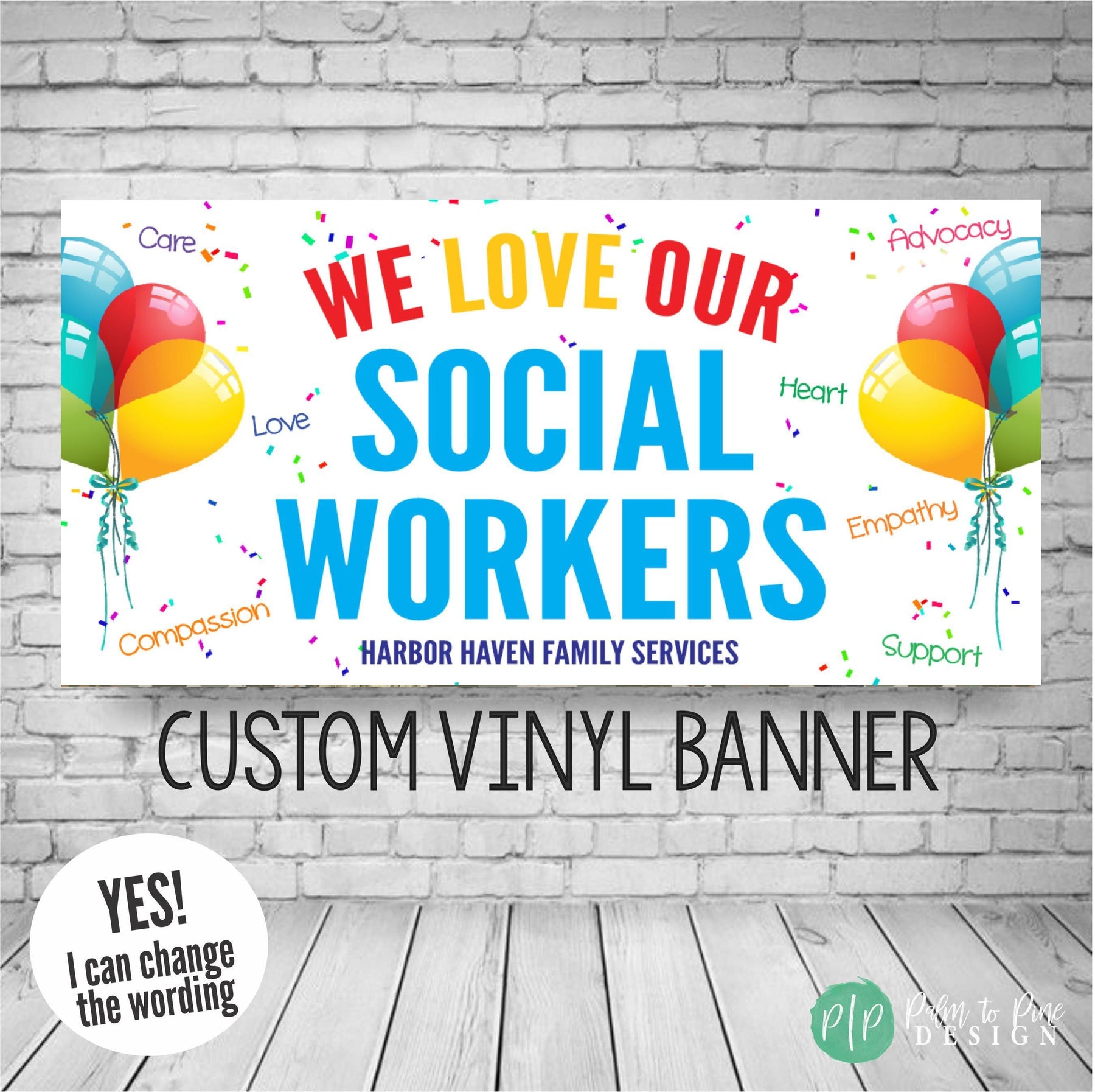 We love our social workers banner with words of compassion, advocacy, care, love, empathy and support personalized with business name