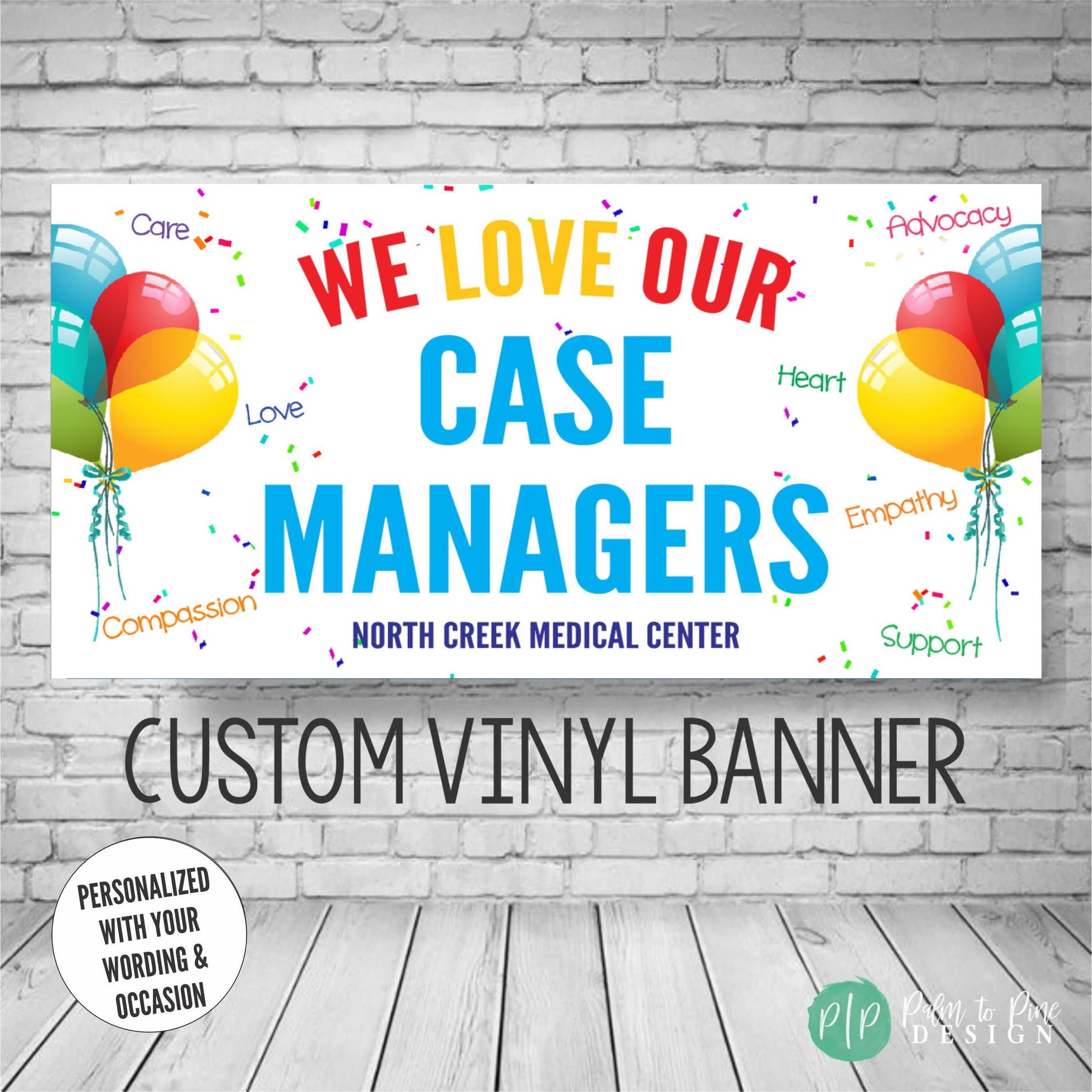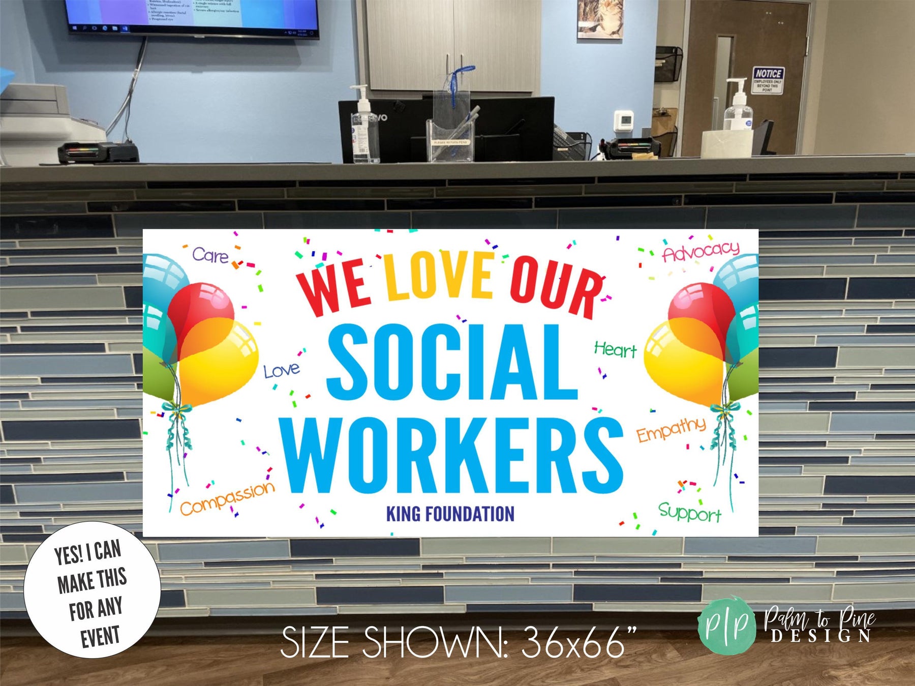 This personalized appreciation banner professionally printed on durable vinyl and easy to hang both indoors or outdoors and can be personalized for any appreciation holiday or staff recognition event. The high quality banner and can be used year after year and the wording on this social worker appreciation banner can be customized with your business name too for an extra personal touch.