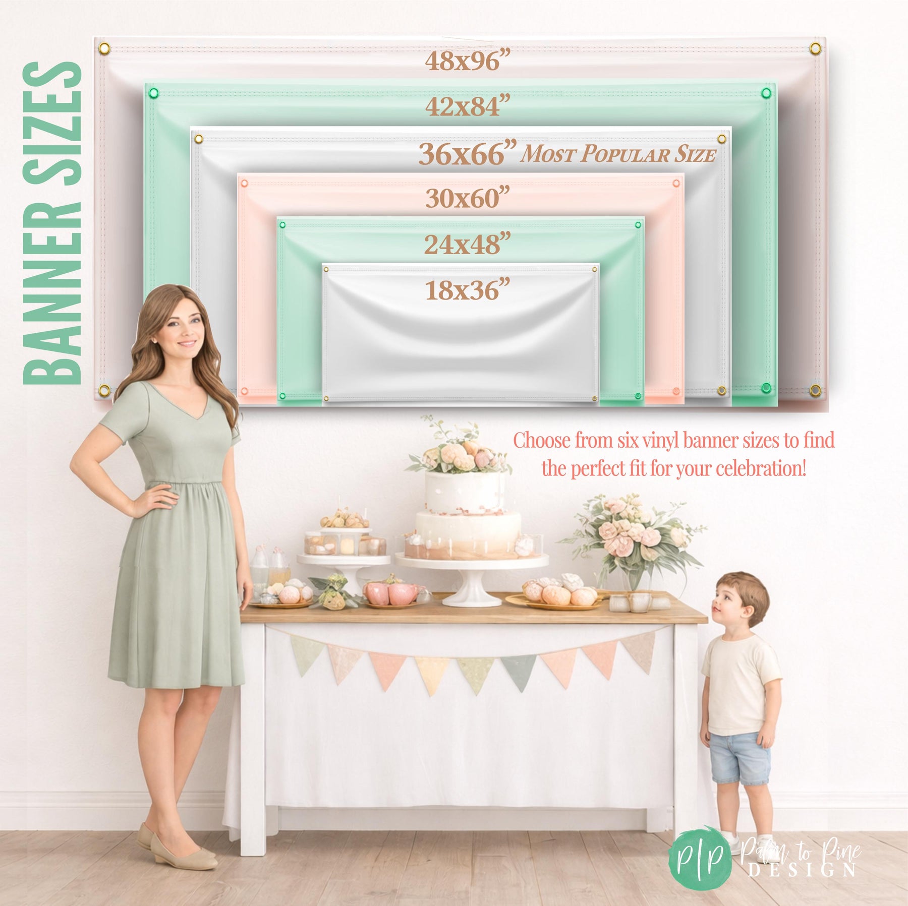 A woman and a young boy stand in front of a table with a cake and other decorations, with a sign indicating banner sizes above them.