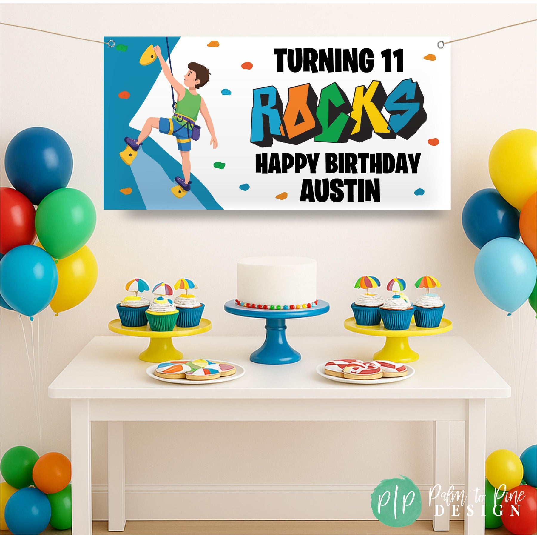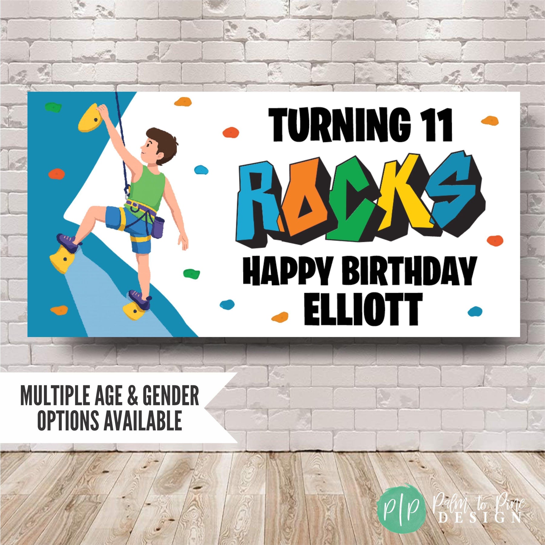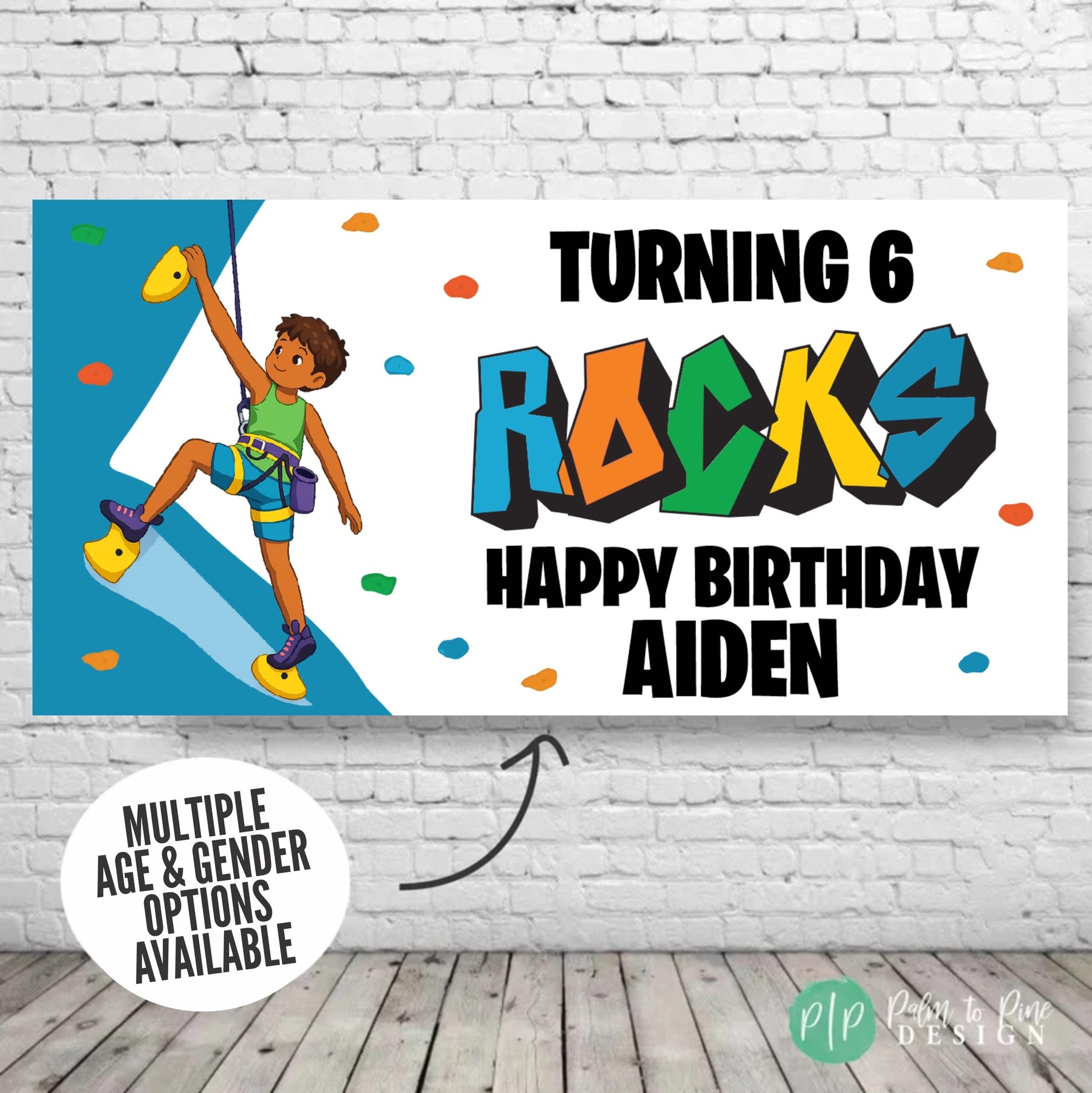 This personalized rock climbing birthday banner is the perfect way to celebrate kids who love to climb, explore, and stay active. Whether your party is at an indoor climbing gym, outdoor adventure venue or home, this custom climbers banner is perfect for any age or gender to celebrate. This birthday banner is fully customizable and the image of the rock climber can be personalized for your boy, girl, tween or teen of any race or gender, making this a one of a kind party decoration! The bright colors, climbing wall design and personal touch instantly set the tone for an energetic birthday party for any age.