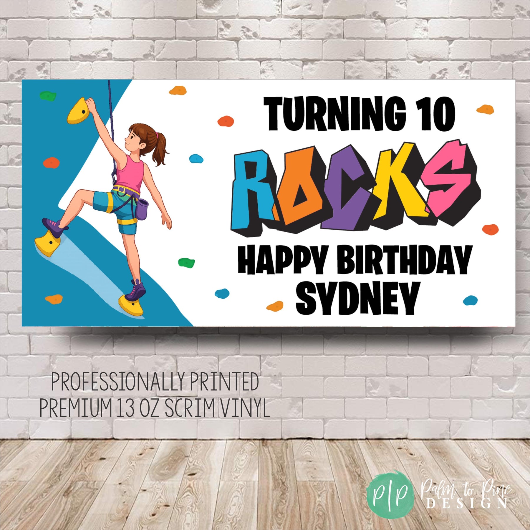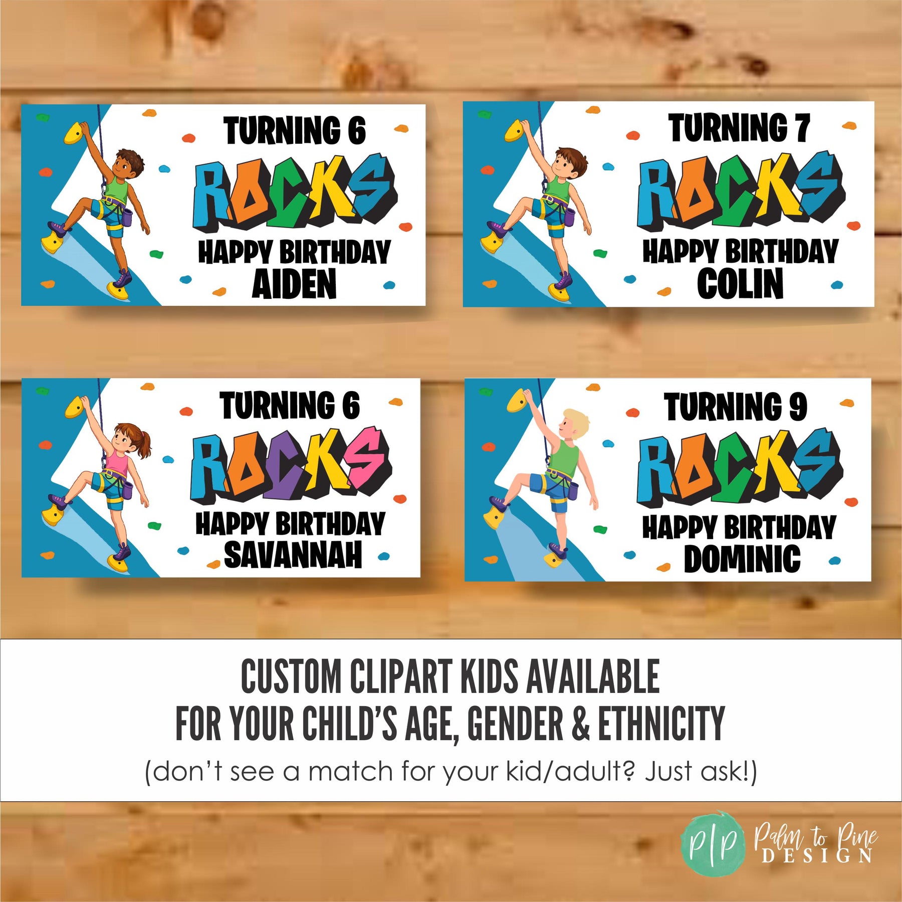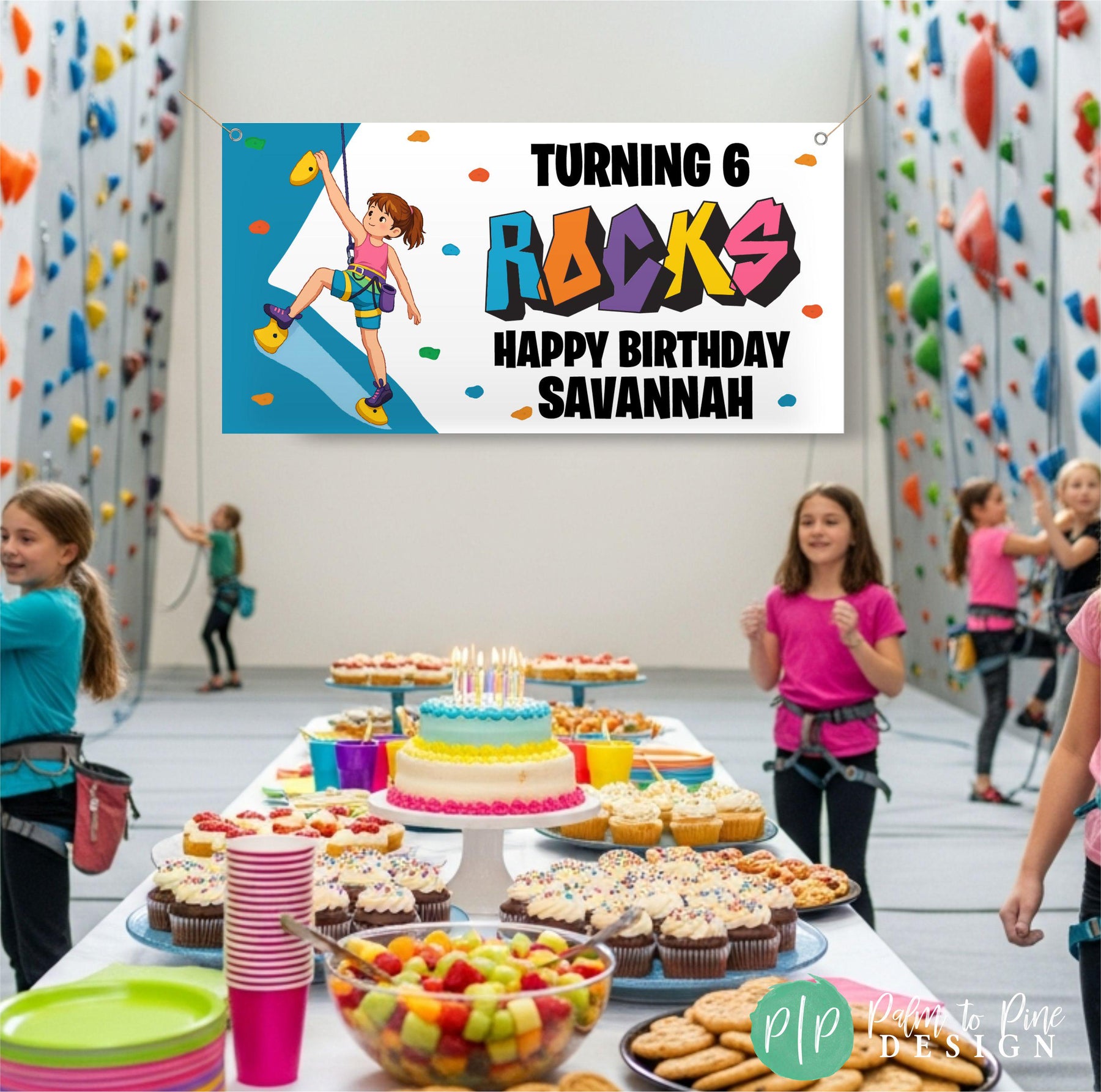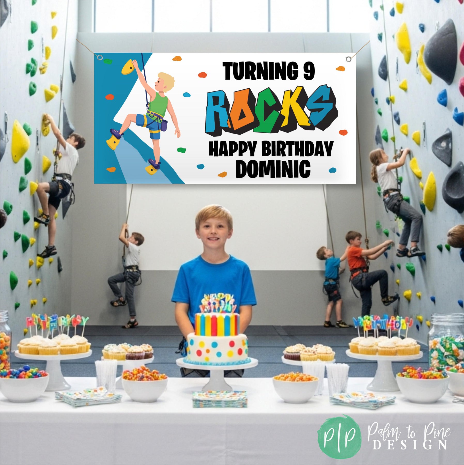 This personalized rock climbing birthday banner is the perfect way to celebrate kids who love to climb, explore, and stay active. Whether your party is at an indoor climbing gym, outdoor adventure venue or home, this custom climbers banner is perfect for any age or gender to celebrate. This birthday banner is fully customizable and the image of the rock climber can be personalized for your boy, girl, tween or teen of any race or gender, making this a one of a kind party decoration! The bright colors, climbing wall design and personal touch instantly set the tone for an energetic birthday party for any age.