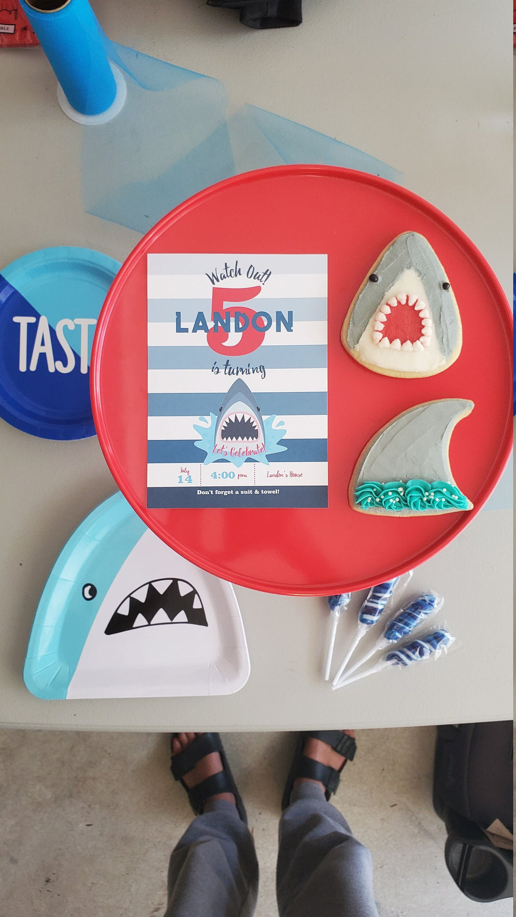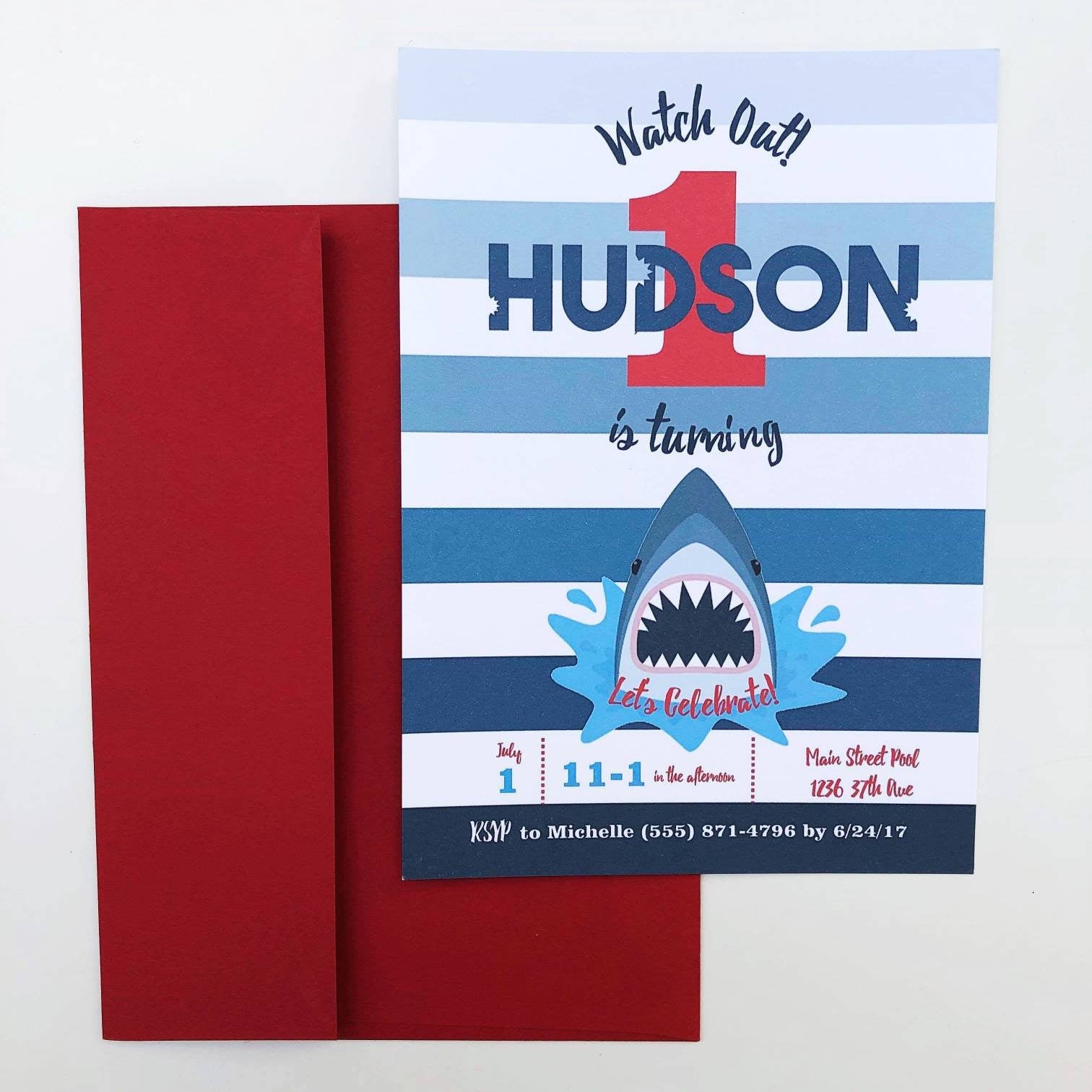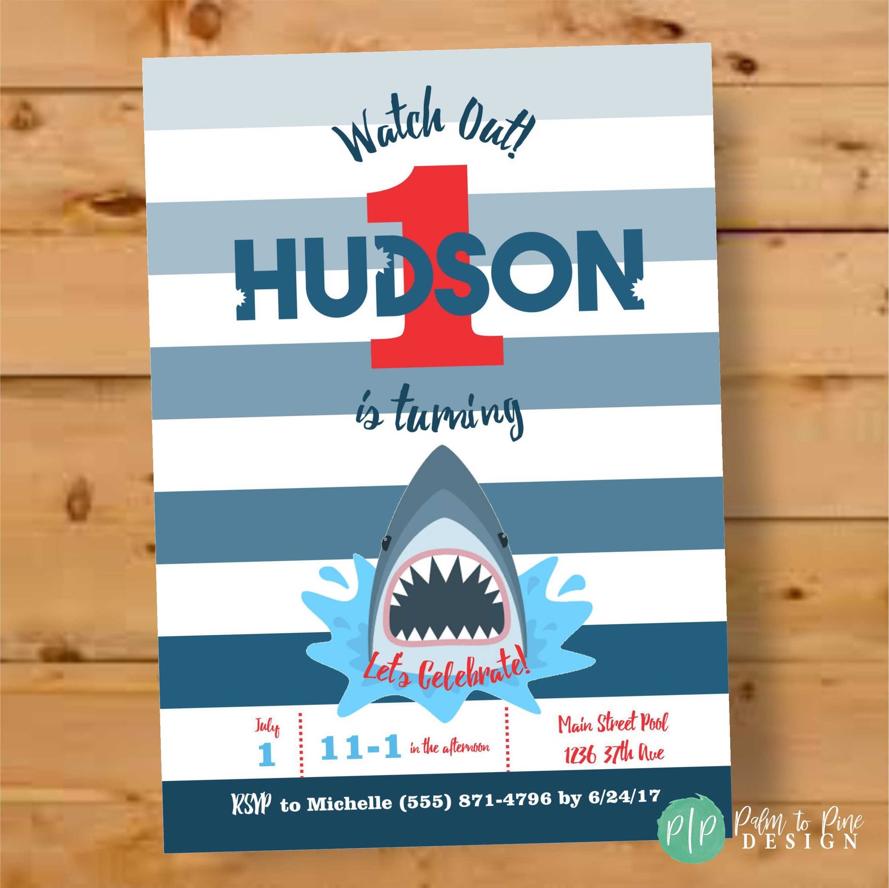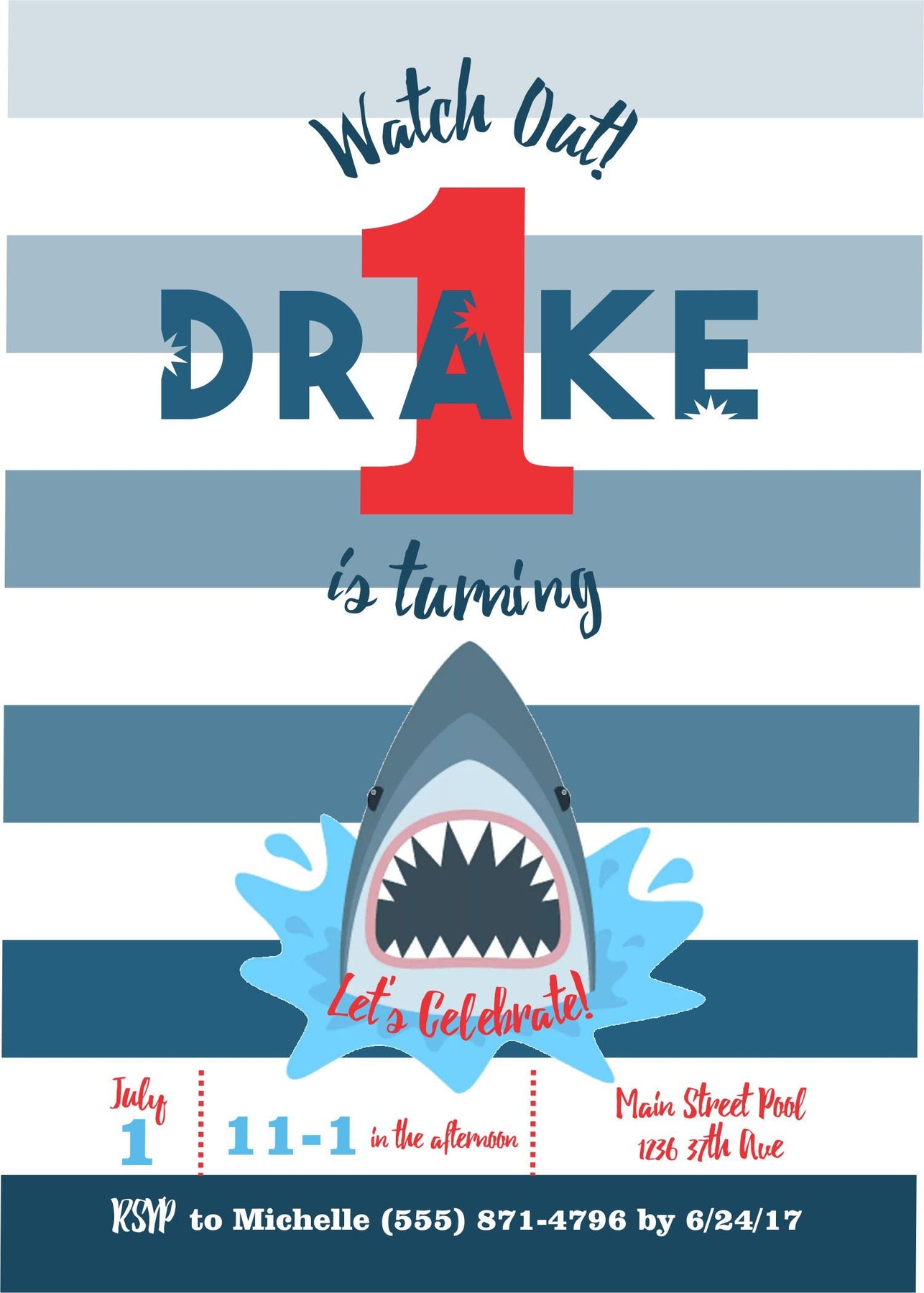 This blue ombre striped shark invite is perfect for your little boys first birthday party (or can be changed to read two, three, four etc.) The "shark bite" name adds a fun detail to this boy birthday invite and the shark "jaws" are perfect for an under the sea adventure! Birthday party guests will love this shark birthday invite.