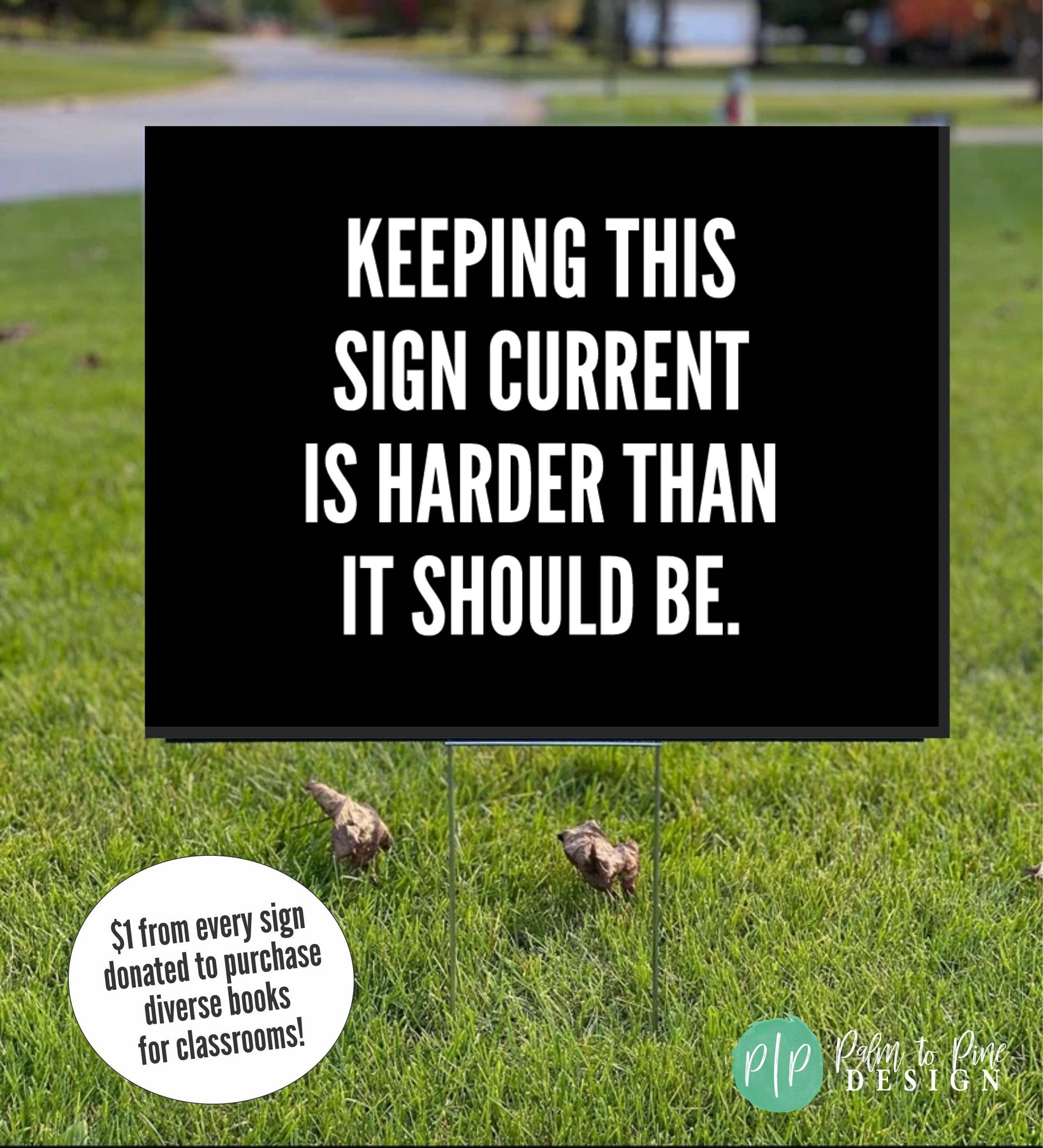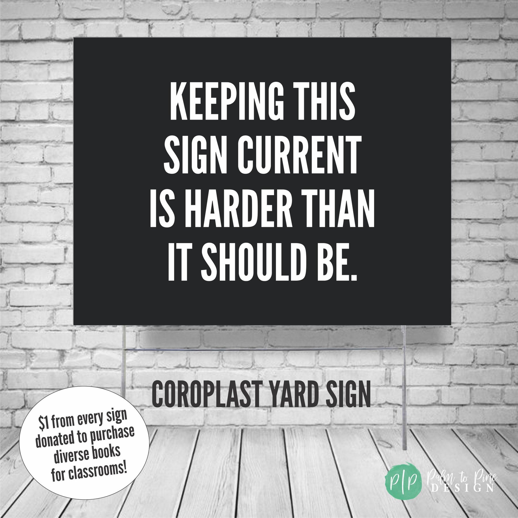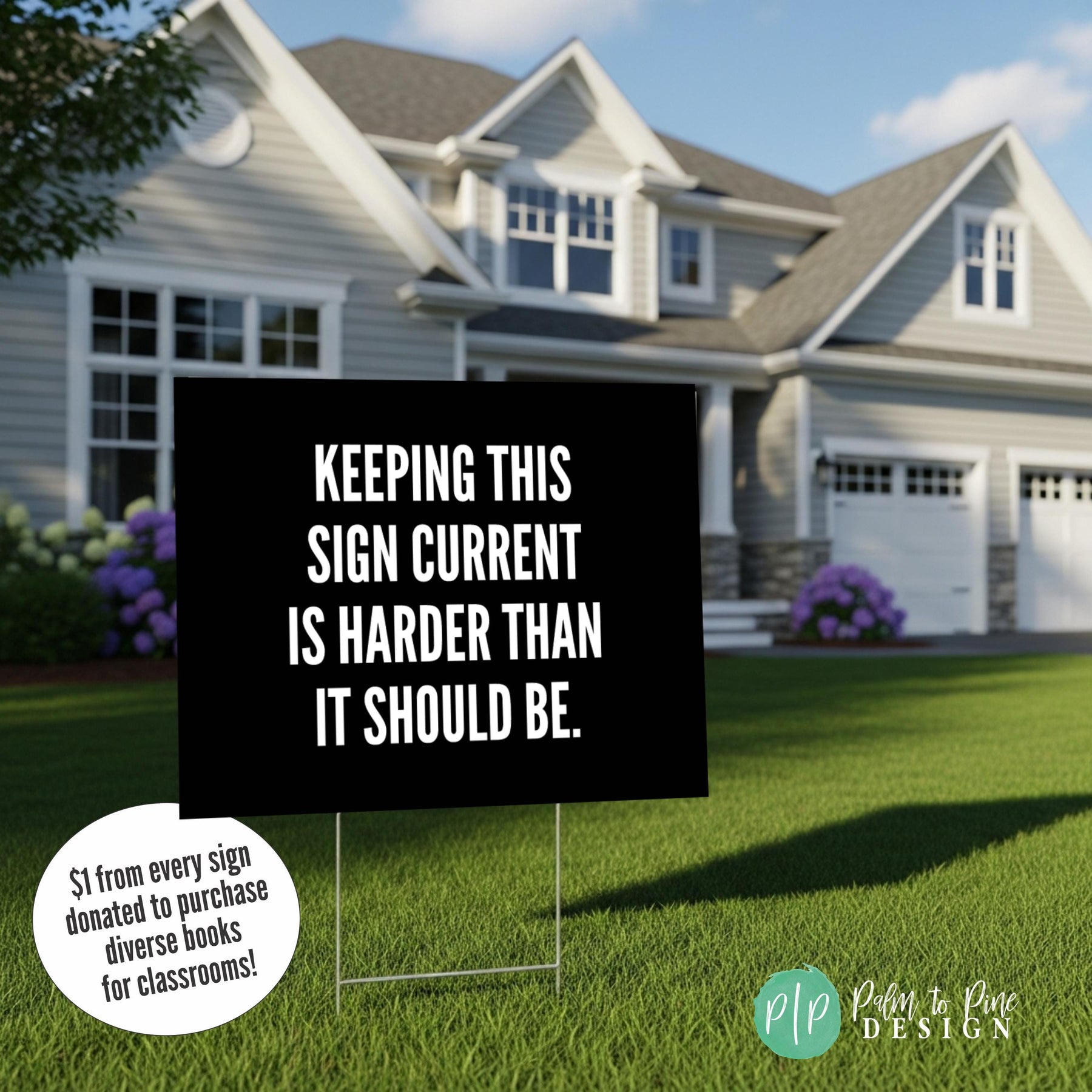 This social justice yard sign is designed for those who want their democratic values clearly seen and awareness raised in a witty, thought provoking way. Featuring the bold black and white message, “Keeping this sign current is harder than it should be,” this political yard sign makes a powerful statement whether displayed in your yard, at a protest, or during a rally. From calls for compassion around immigration and the belief that no human is illegal, to standing in solidarity with Black Lives Matter and advocating for inclusive, equitable education, this sign reflects a shared desire for dignity, fairness, and accountability in an ever-changing political climate. It offers a meaningful way to show support for social justice causes while encouraging thoughtful dialogue and awareness.